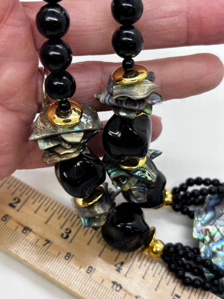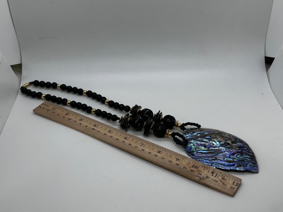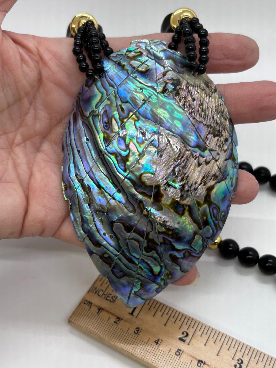 Large Black Enameled Leaf Carved Abalone Shell Pendant Statement Necklace. In good condition. Black beads and abalone fragments compliment the pendant.