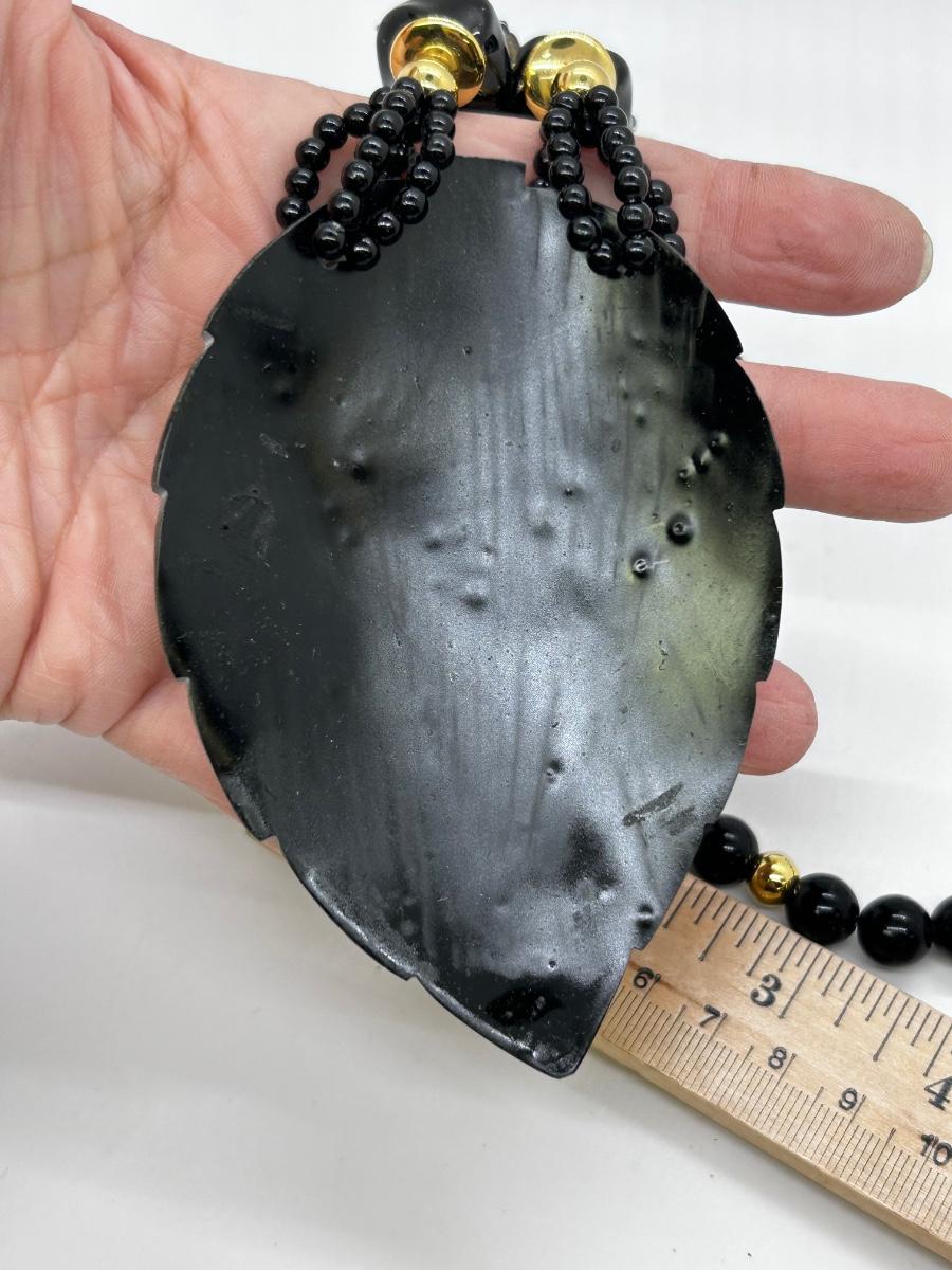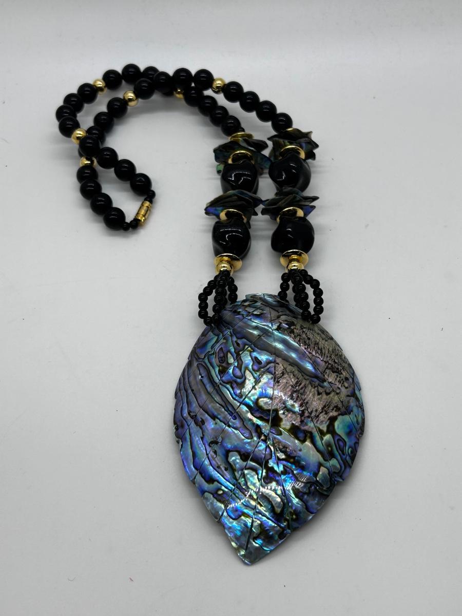 Large Black Enameled Leaf Carved Abalone Shell Pendant Statement Necklace