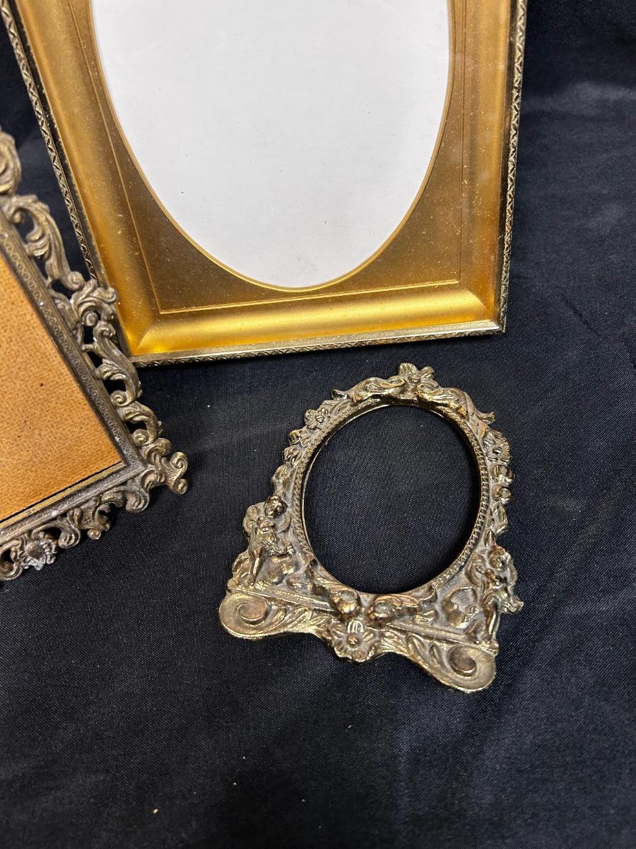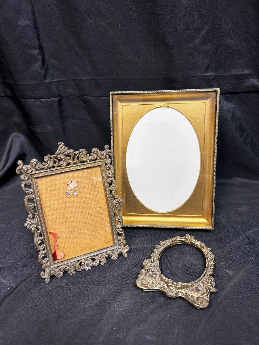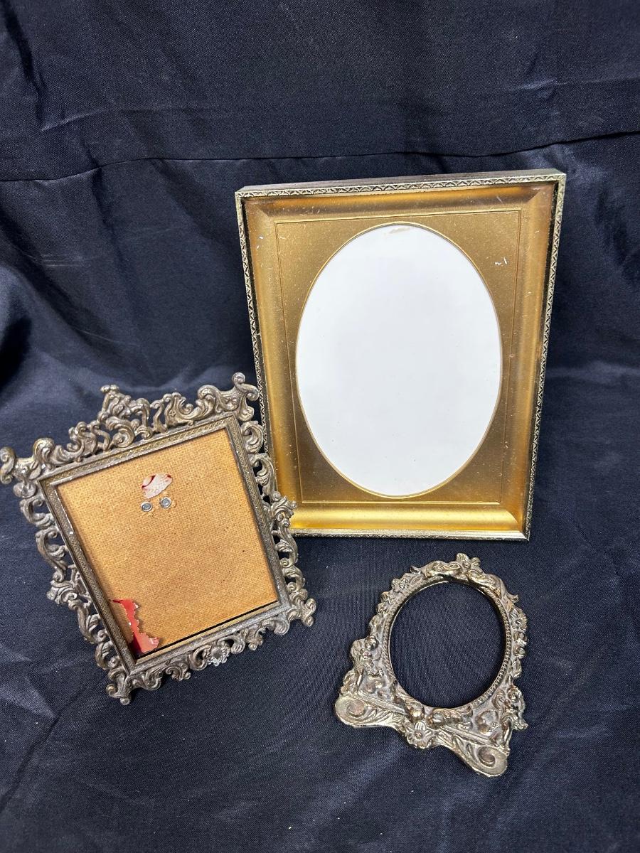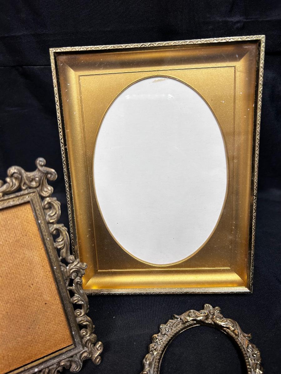 Lot of Three Vintage Photo Picture Frames Gold Brass Tone Metal. In vintage condition. The smallest is missing glass and back piece.