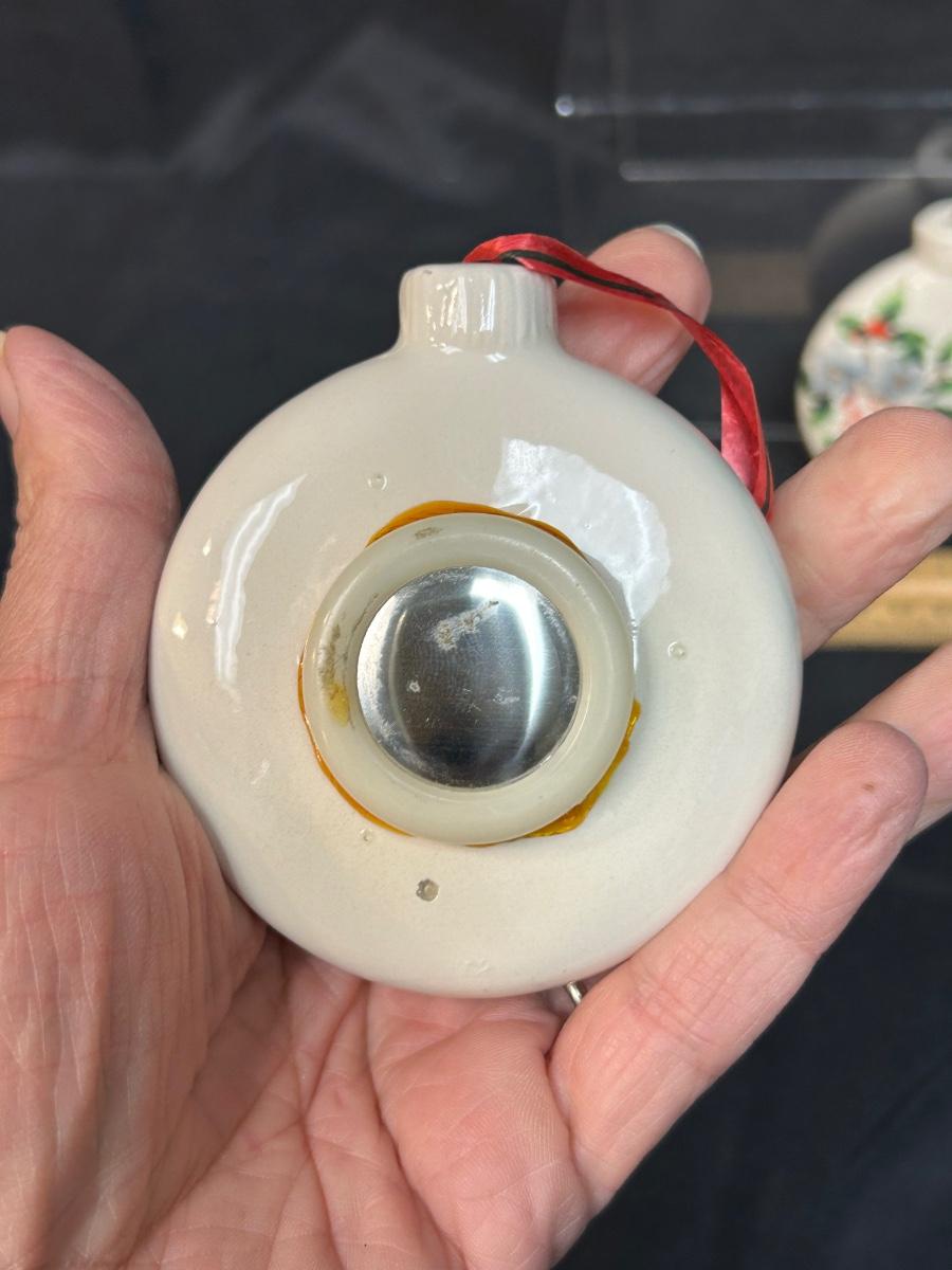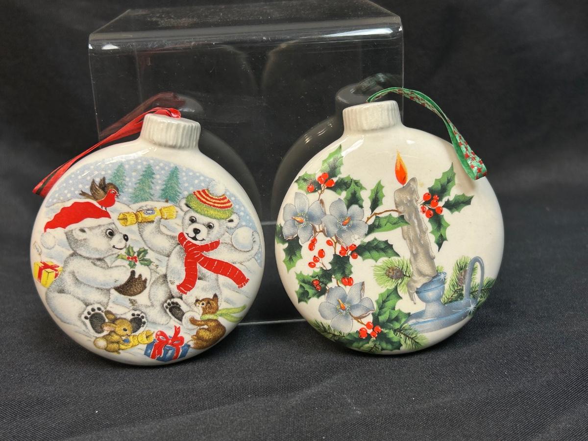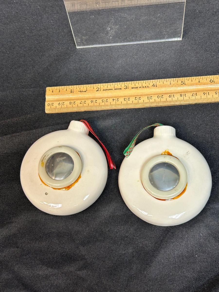 Pair of Ceramic Christmas Holiday Tree Ornaments with Push to Play Music on Back. One works ok the other trys to play but sounds terrible. Display well as ornaments.
