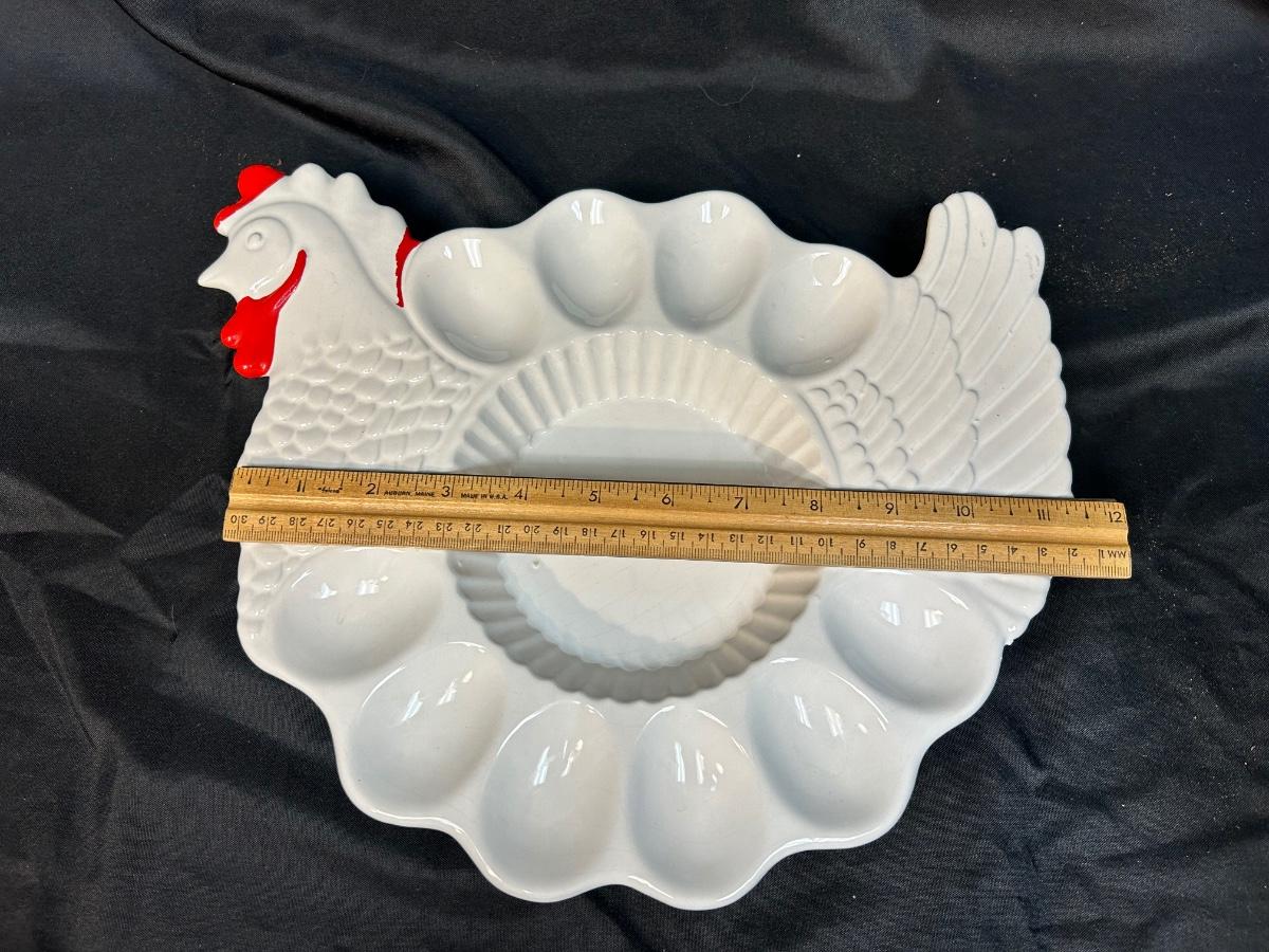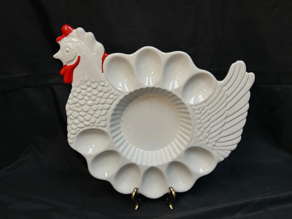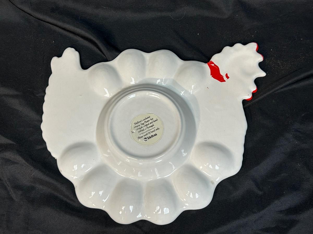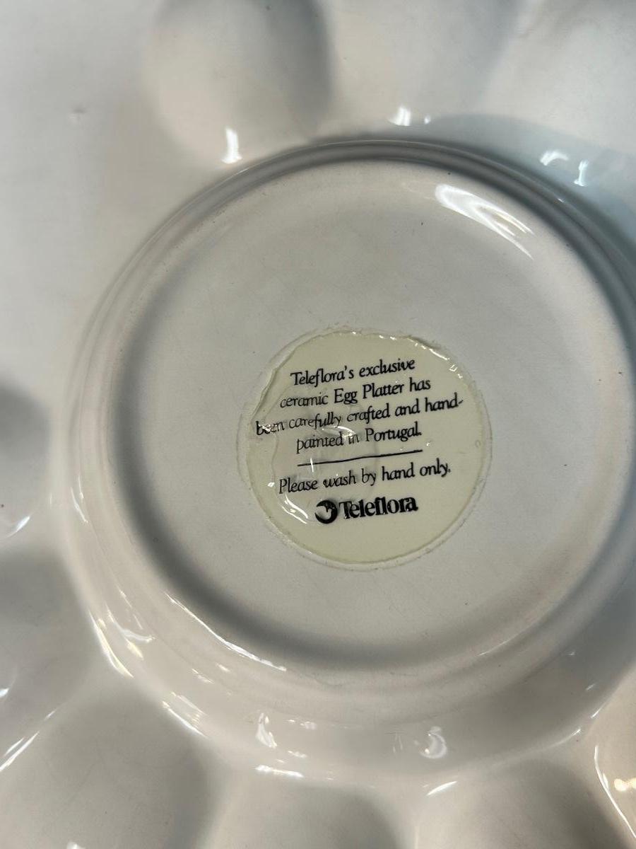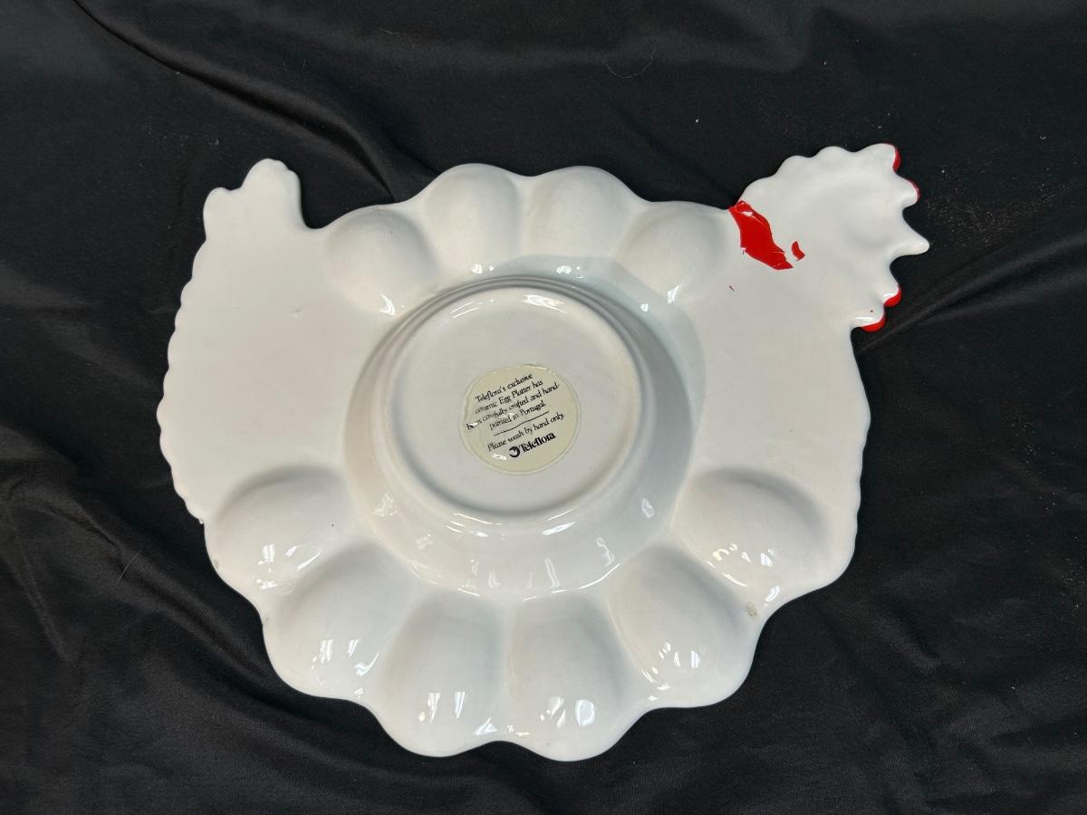 Teleflora Ceramic Hen Chicken Shaped Egg Plate Platter Made in Portugal. In good used condition. No chips but there is crazing.