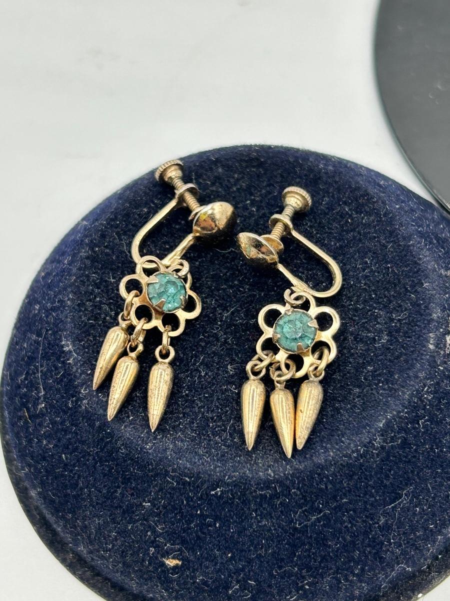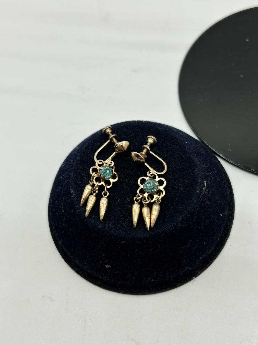 Pair of Vintage Gold Tone Dangling Screw Back Earrings with Blue Rhinestone Center