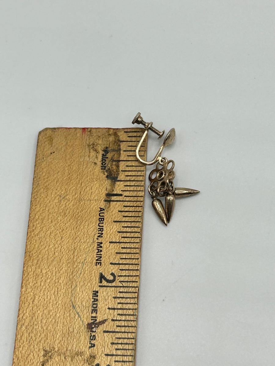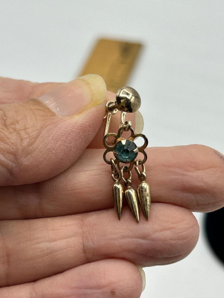Pair of Vintage Gold Tone Dangling Screw Back Earrings with Blue Rhinestone Center. In good vintage condition.
