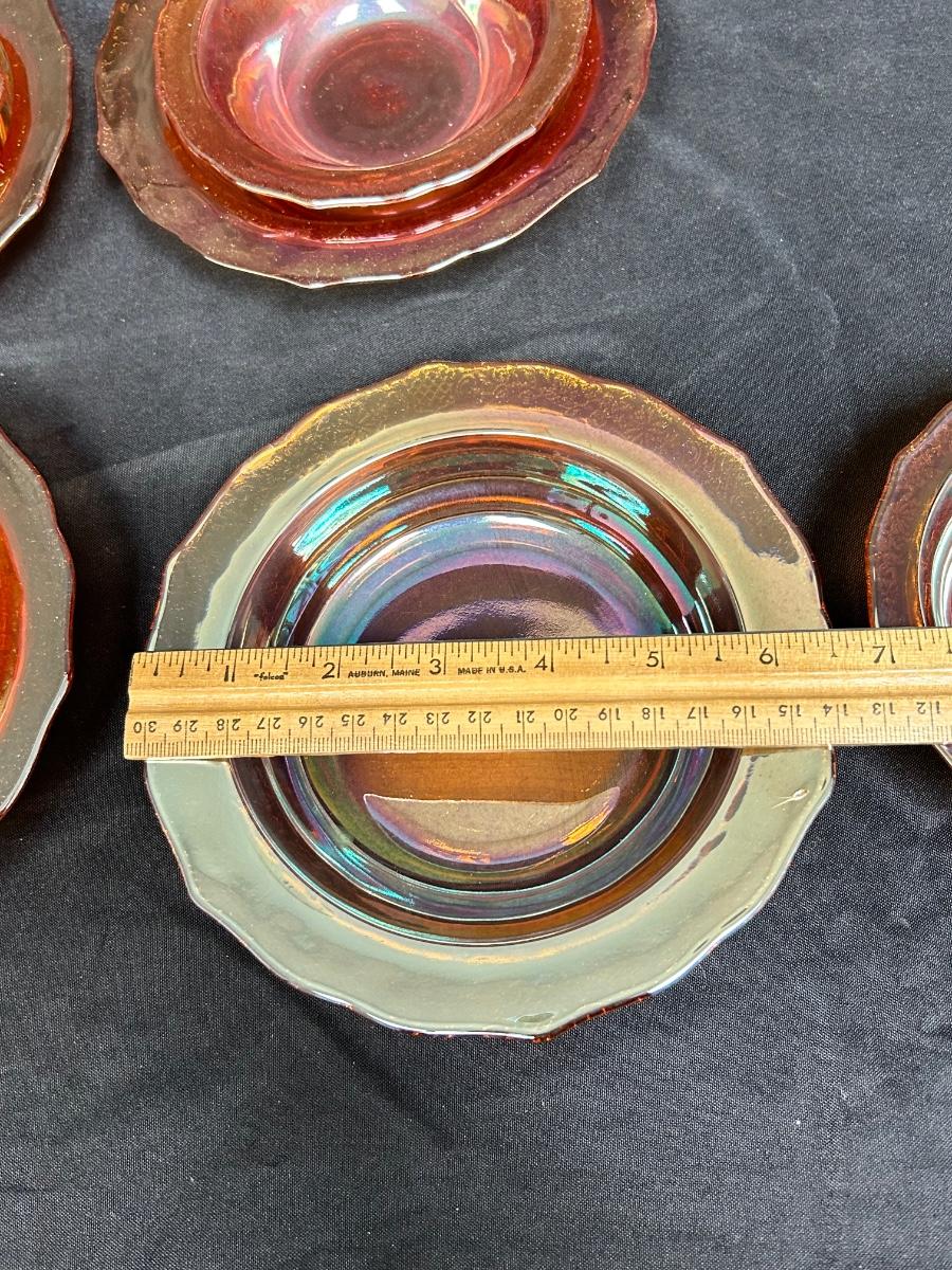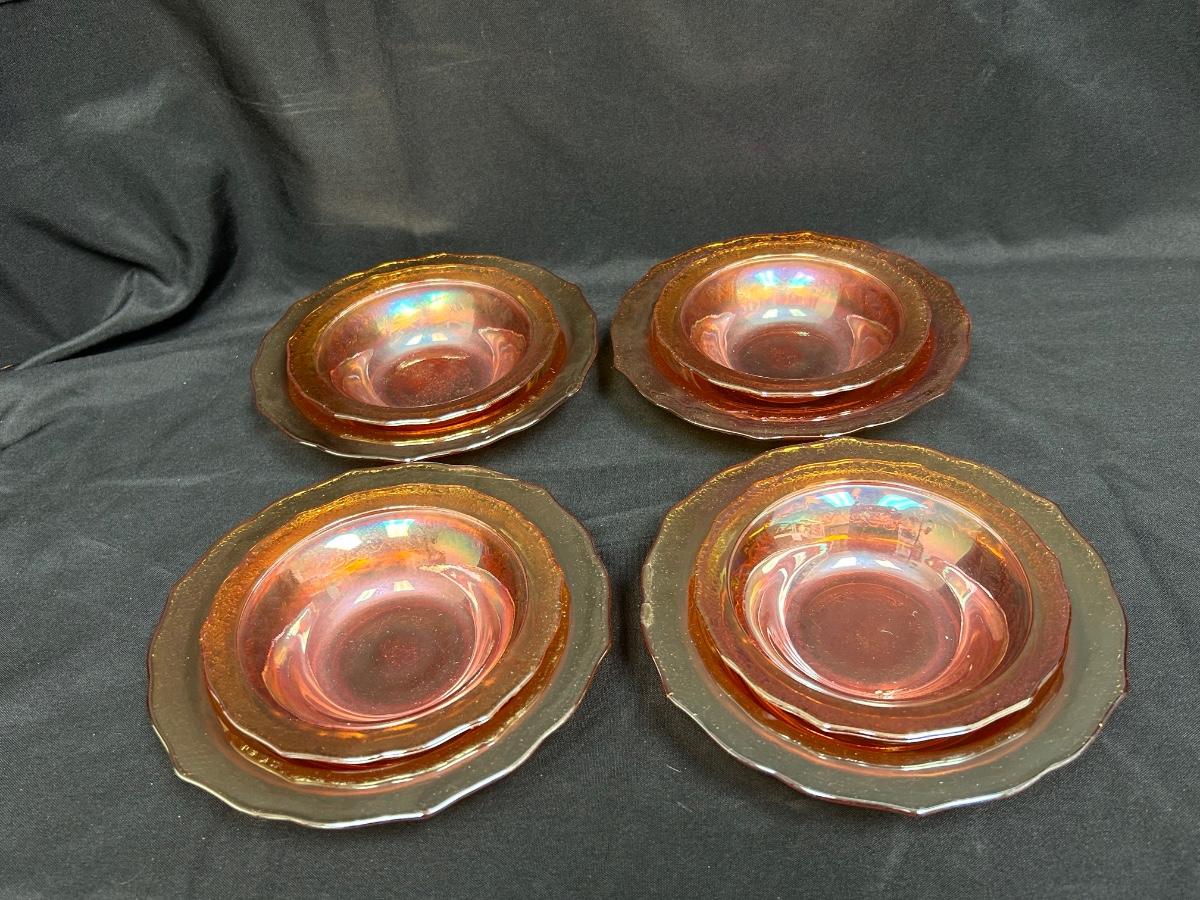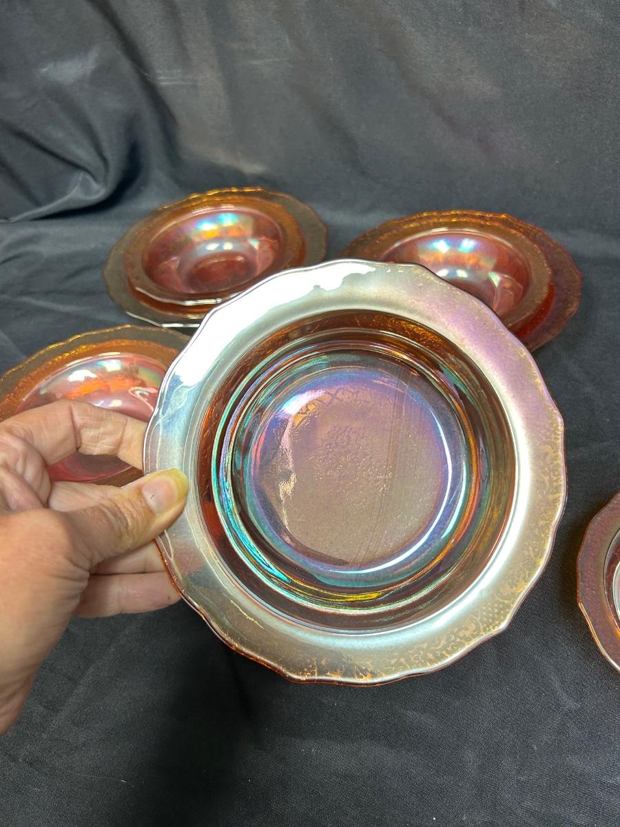 Vintage Marigold Carnival Glass Normandie by Federal Glass Fruit Dessert Bowls Two Sizes. 4 each; 8 total. In good vintage condition. No chips. 5" and 7" size approximately.