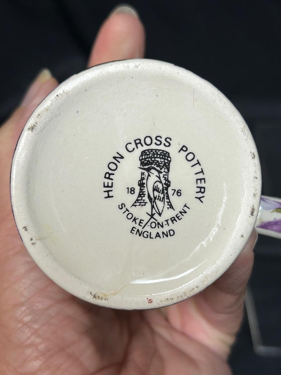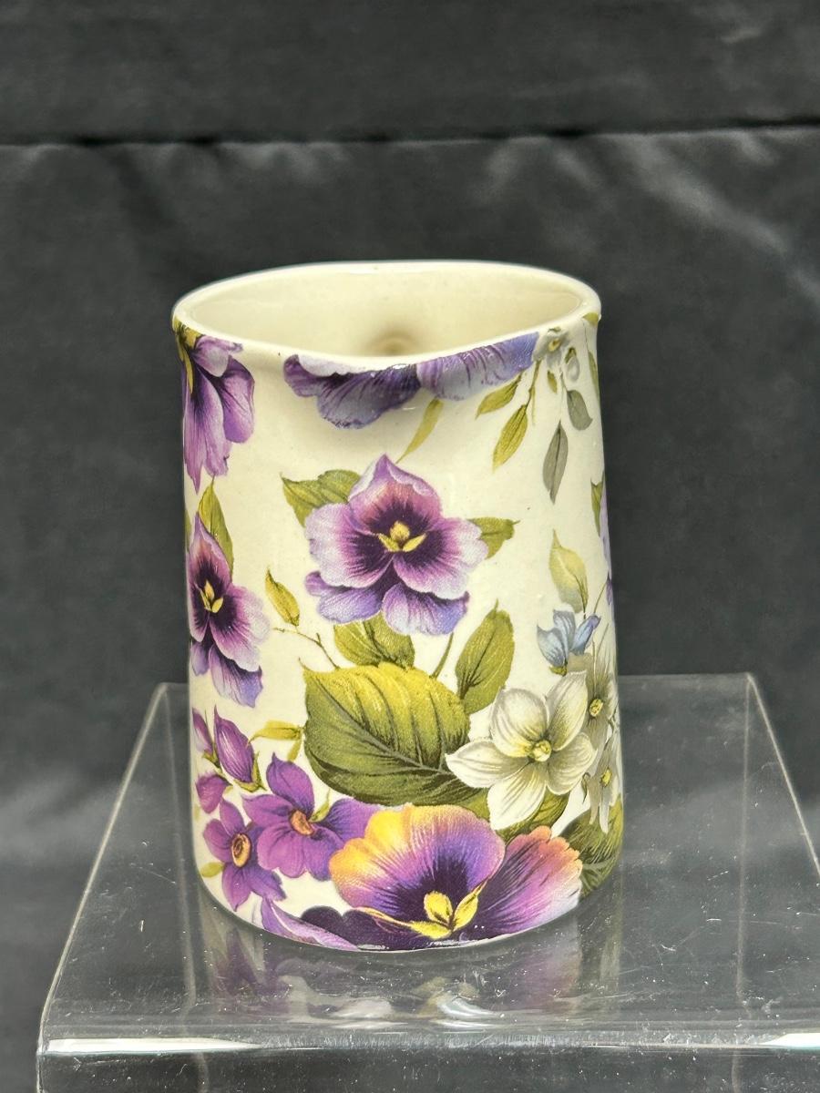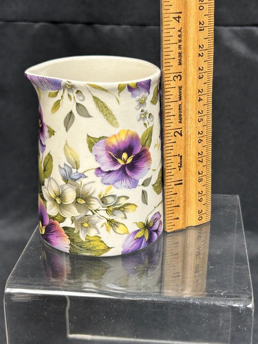 Heron Cross Pottery Purple Pansy Violet Flower Chintz Cream Pitcher. In good condition. No chips noticed. About 3" size.
