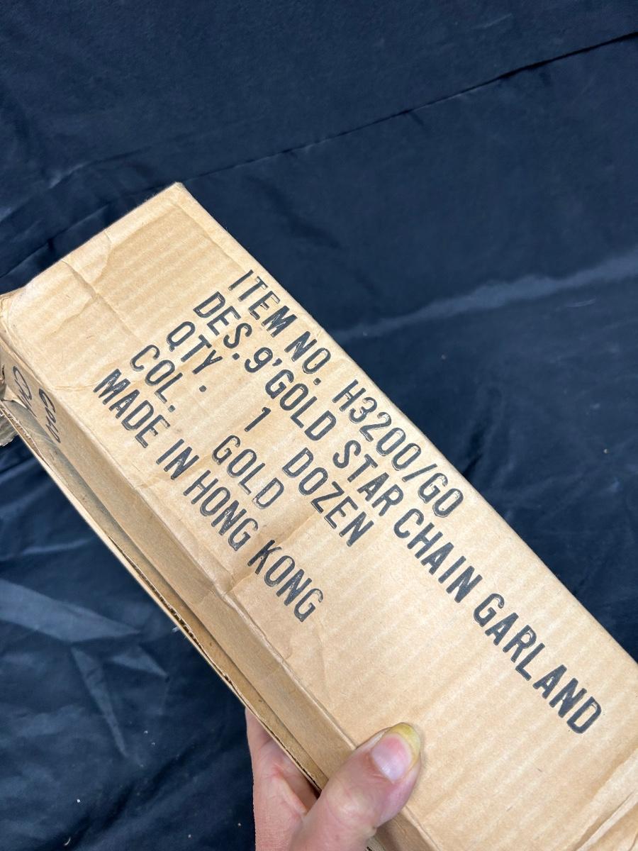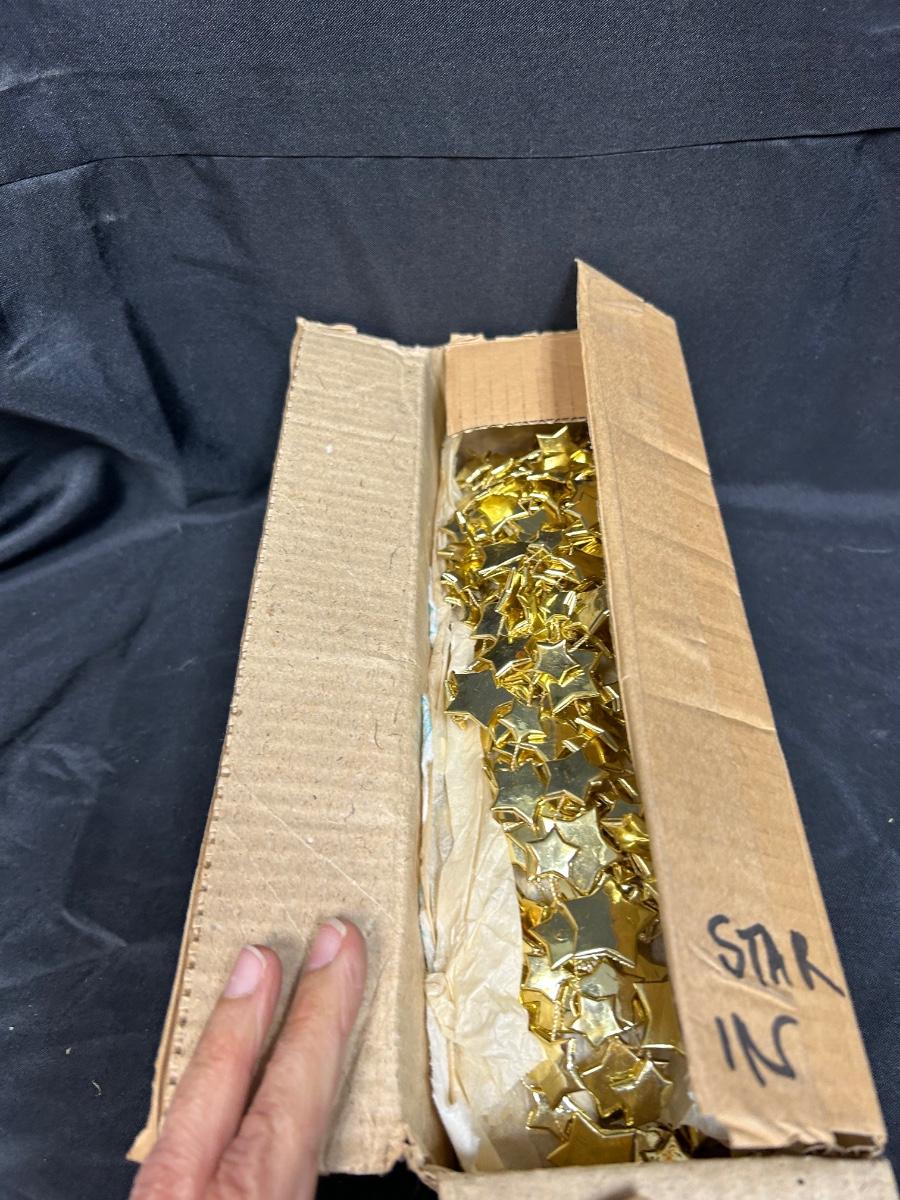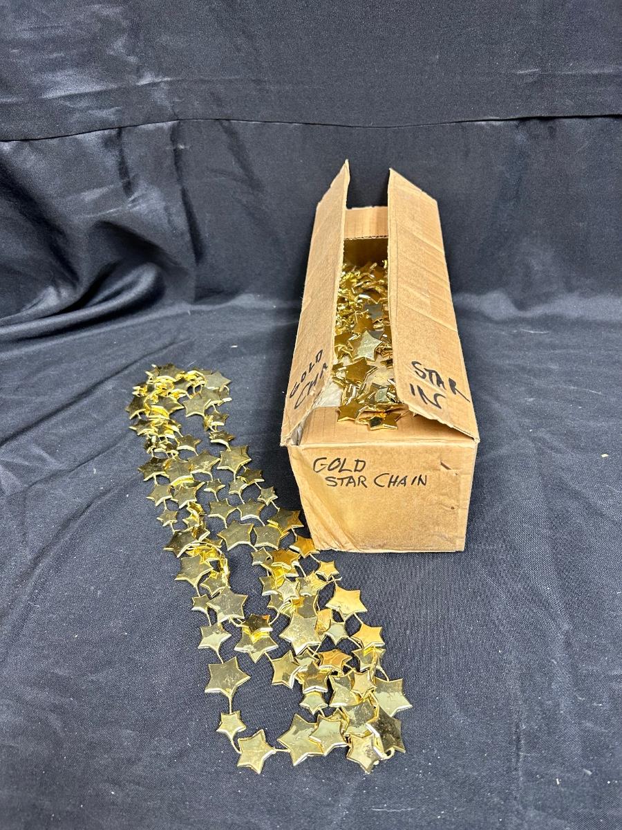 Lot of Gold Star Plastic Christmas Holiday Tree Garland. According to box there are 12 9' sections of garland. Box seems full.