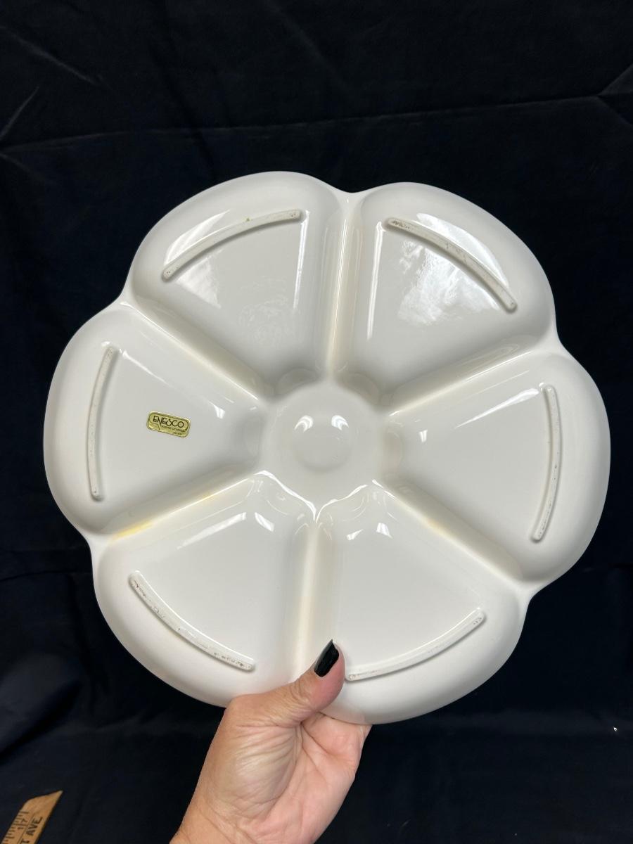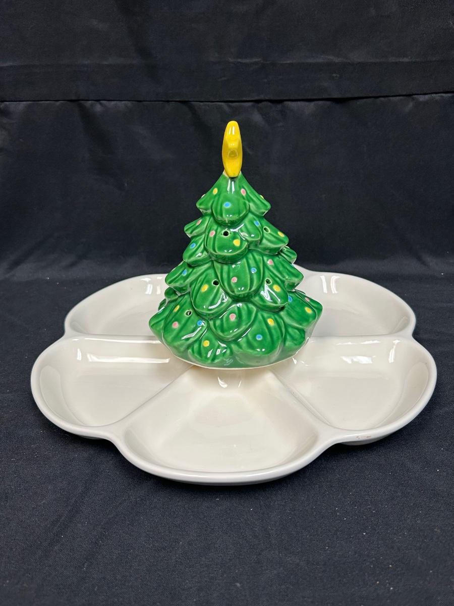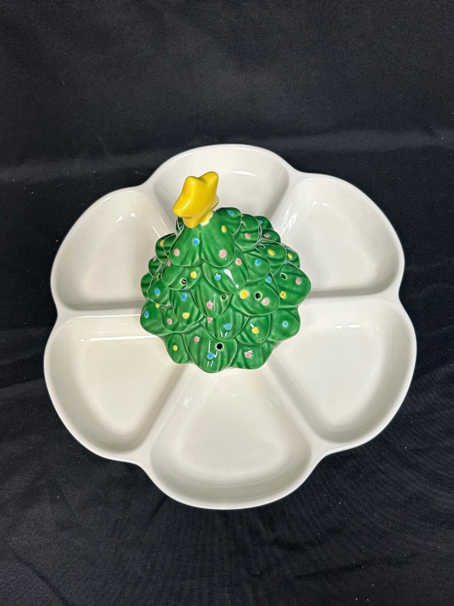 Musical Wind-Up Christmas Tree Holiday Serving Dish Divided Platter We Wish You a Merry Christmas. Tree turns to wind music player; it works but the music player is slow. In good condition. Original Enesco sticker attached.