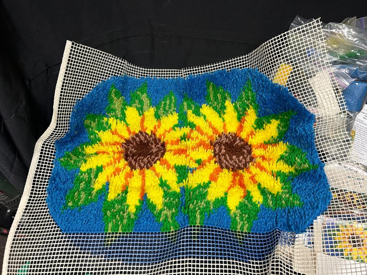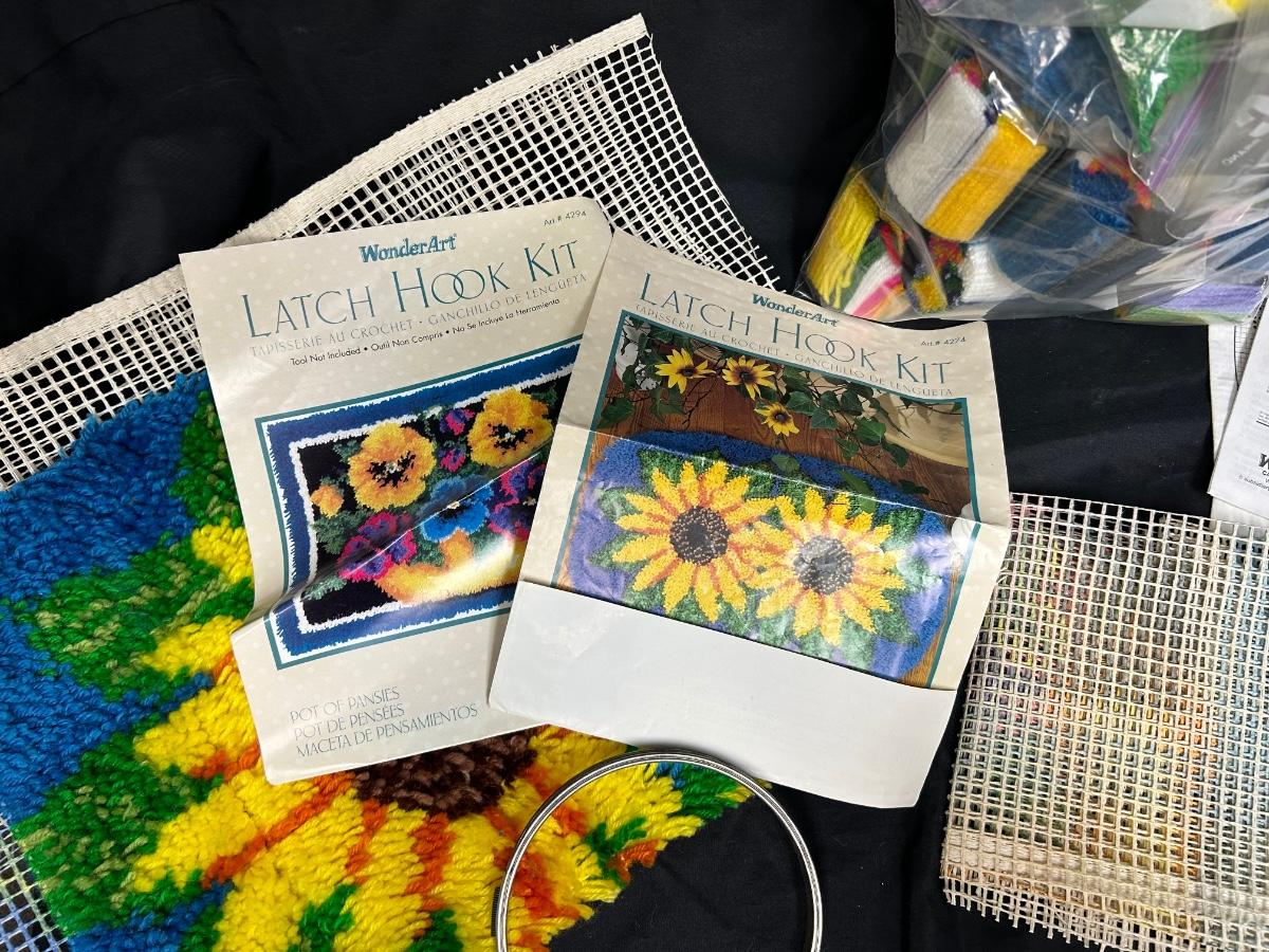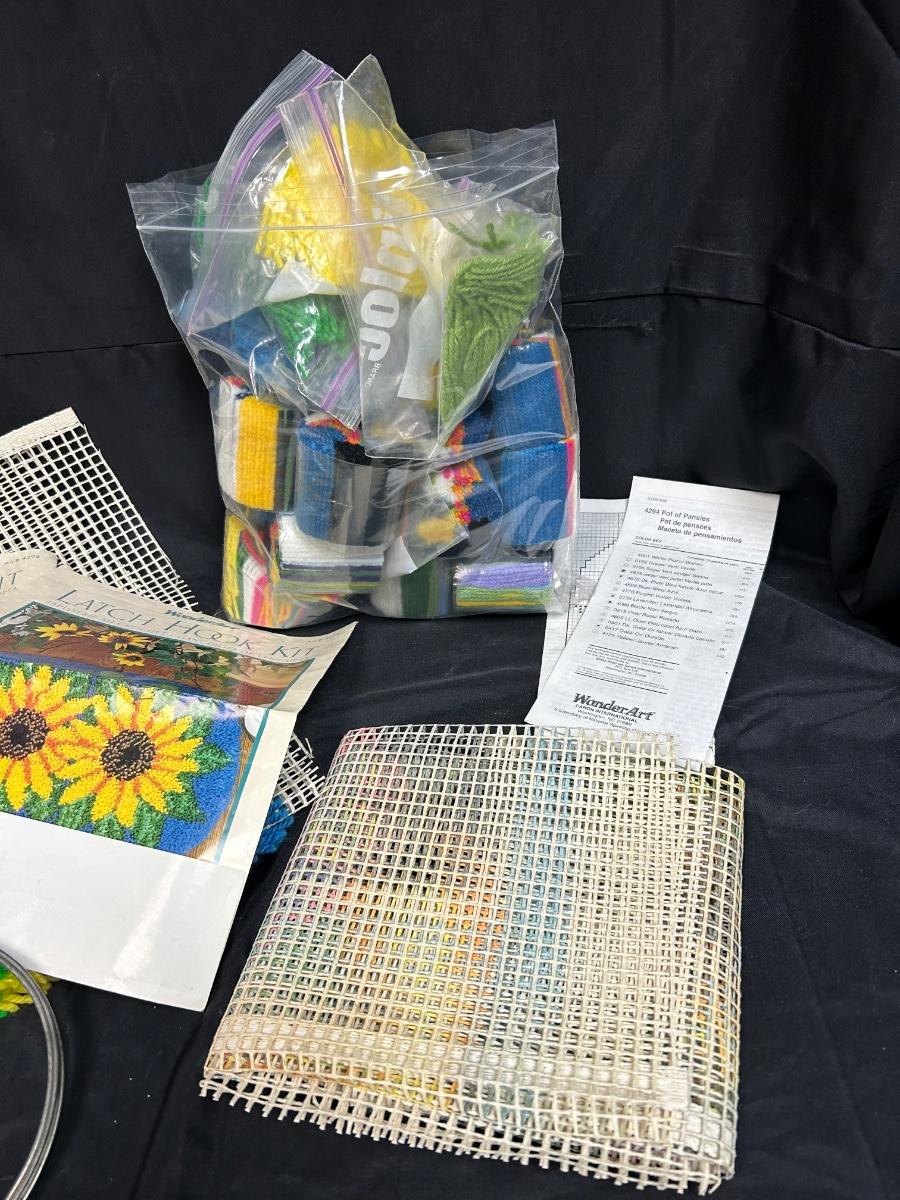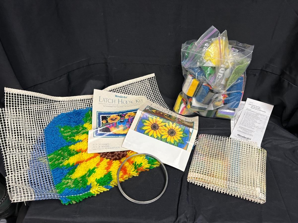 Set of Latch Hook Craft Kits Open Package Partially Completed. Two separate kits, one is almost finished. Unsure if sets are complete. Comes with printed mesh, yarn, tools, and instructions.