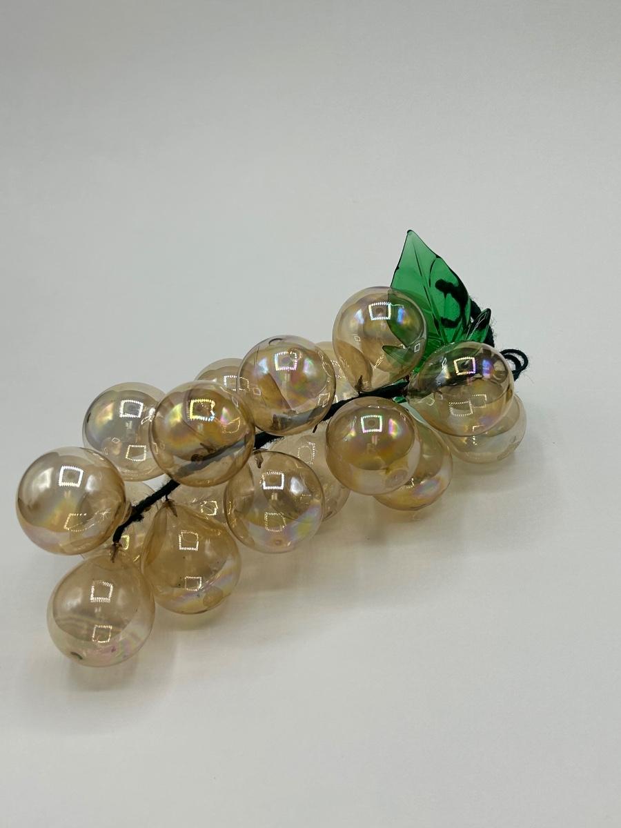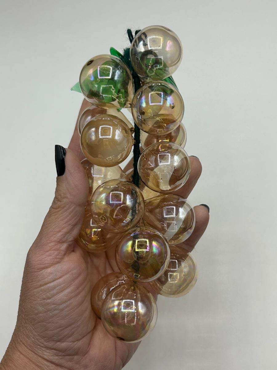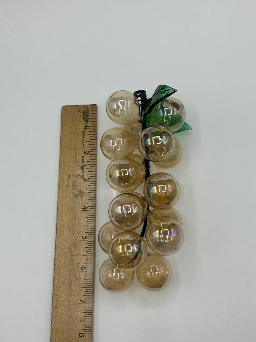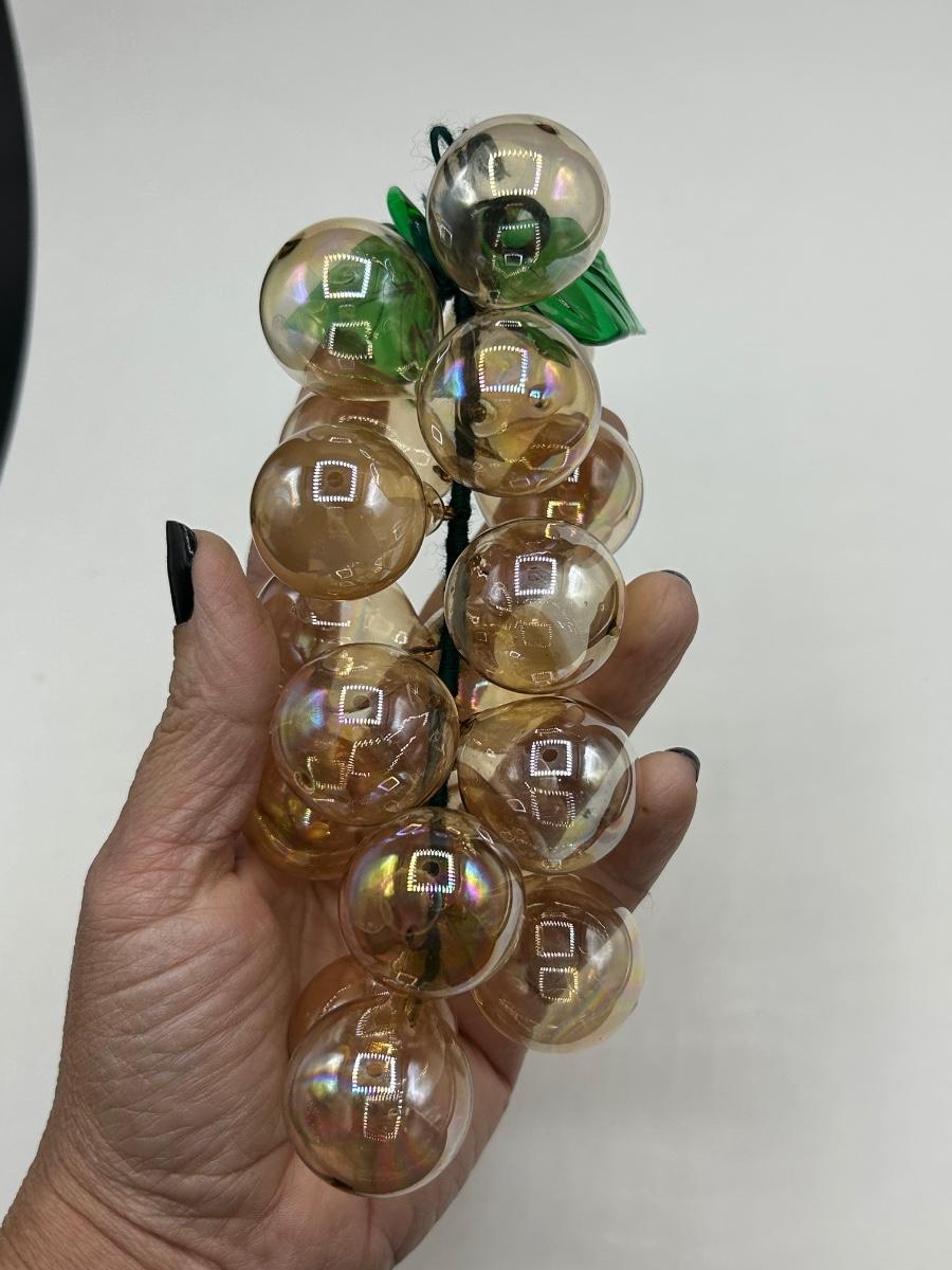 Iridescent Pale Amber Colored Blown Glass Grape Bunch. In good condition. Grapes are blown glass not lucite. About 7" length.