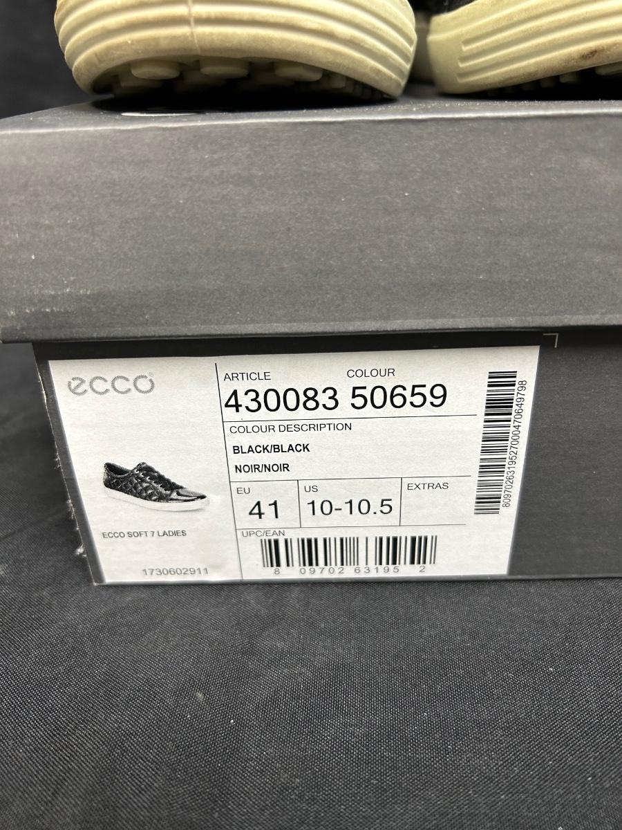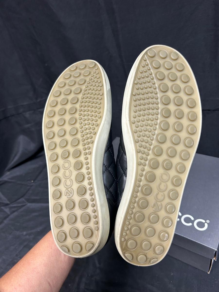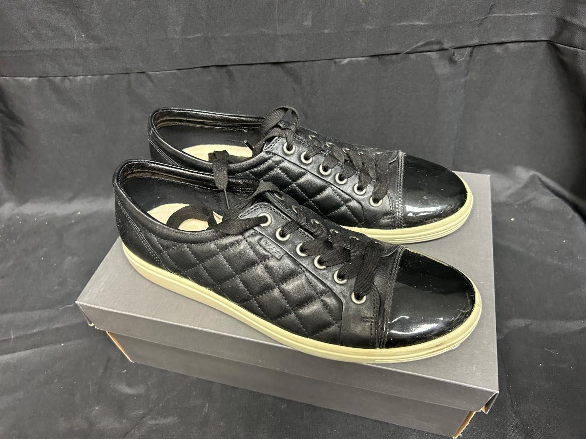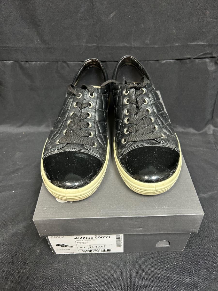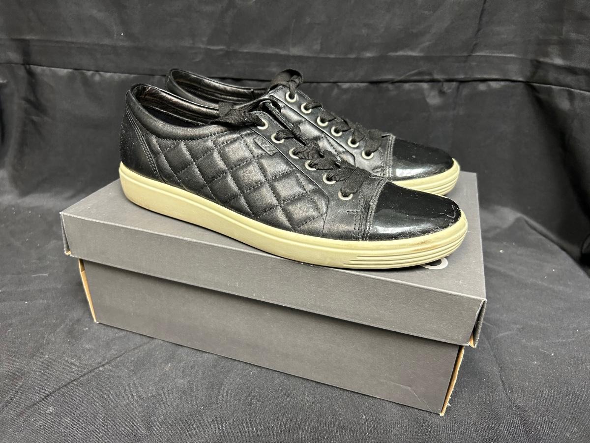 ECCO Black on Black Quilted Shiny Tennis Shoes Sneakers Size 10. Previously worn but good condition. A little dusty from storage, come with original box.