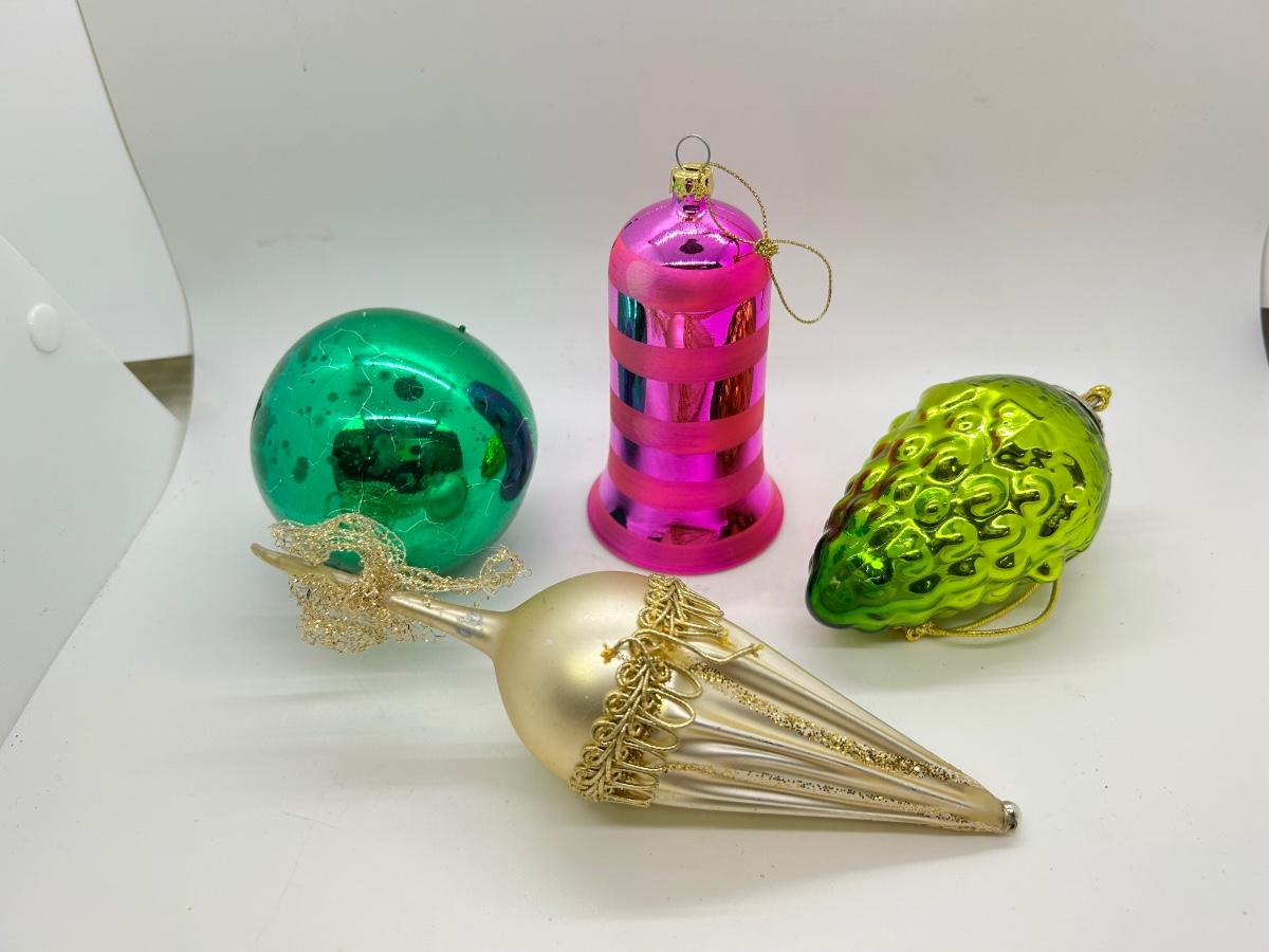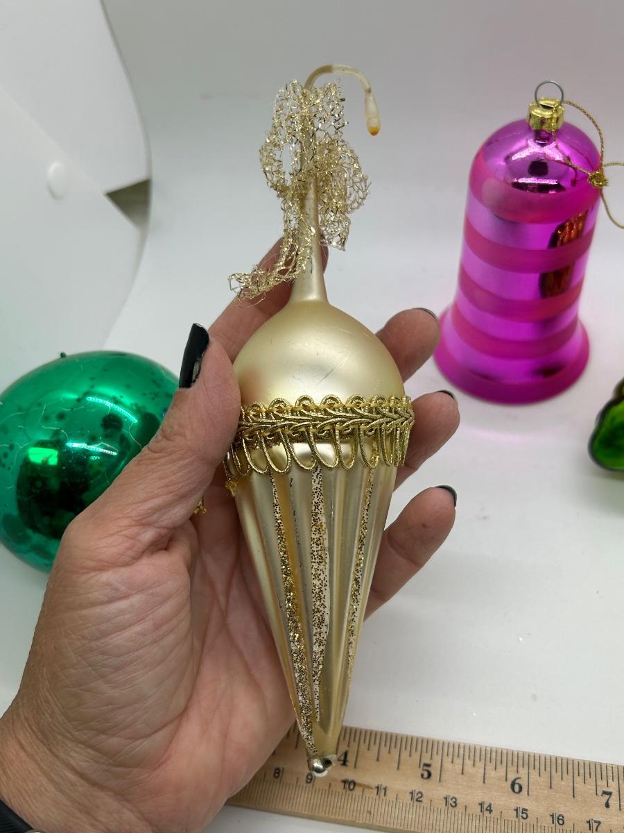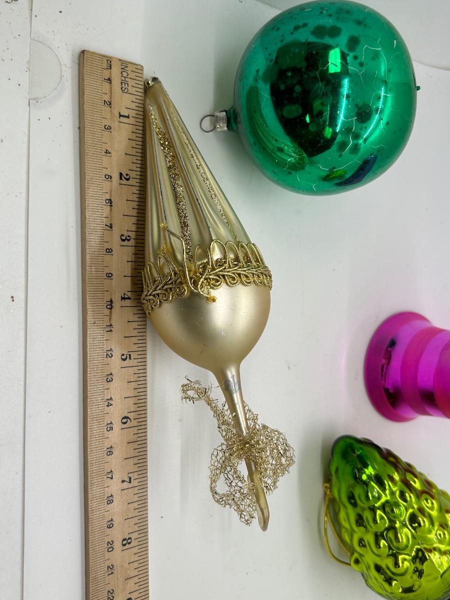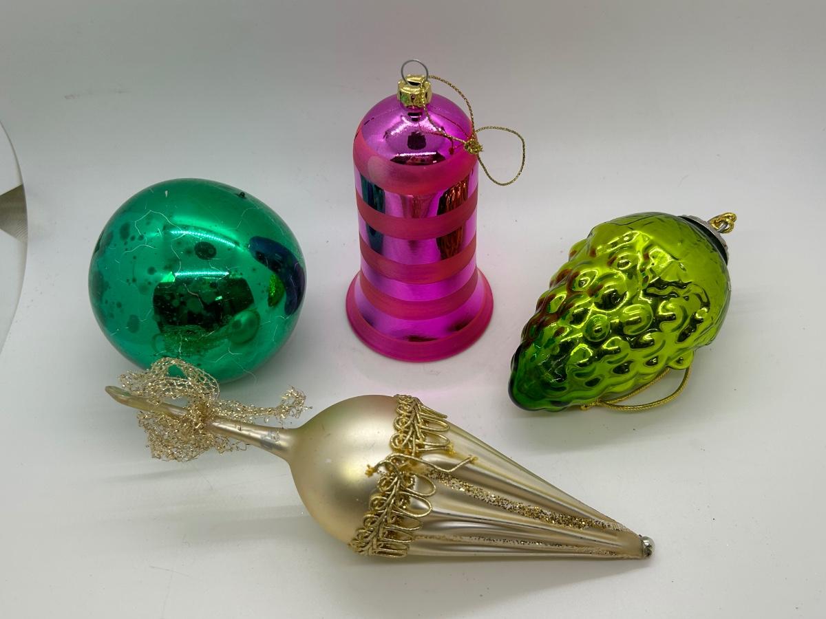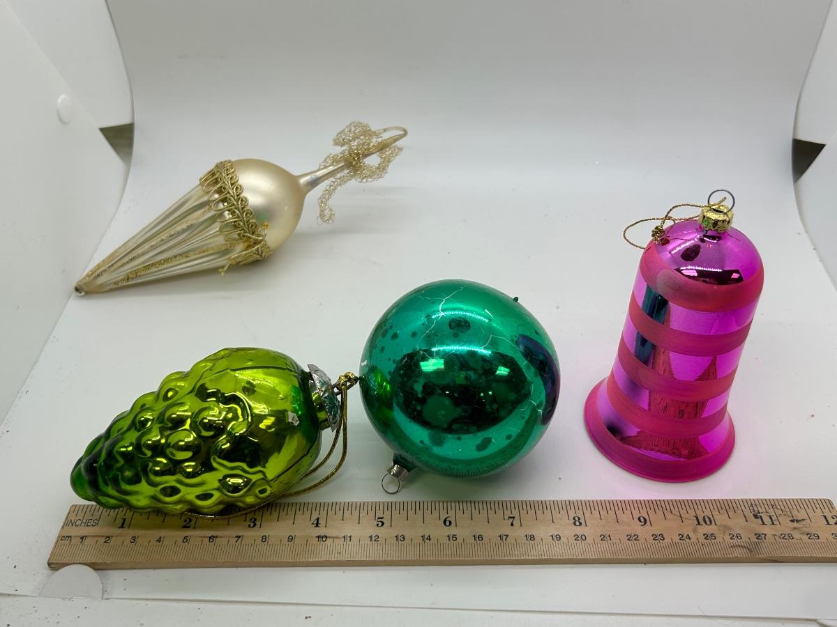 Mixed Lot of Christmas Holiday Ornaments Glass and Plastic. No broken ornaments just wear from age. The pink bell is plastic while the rest are made of glass.