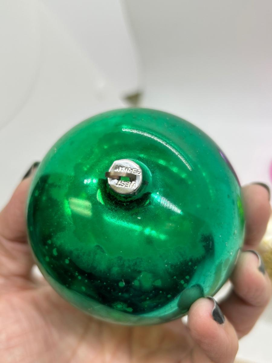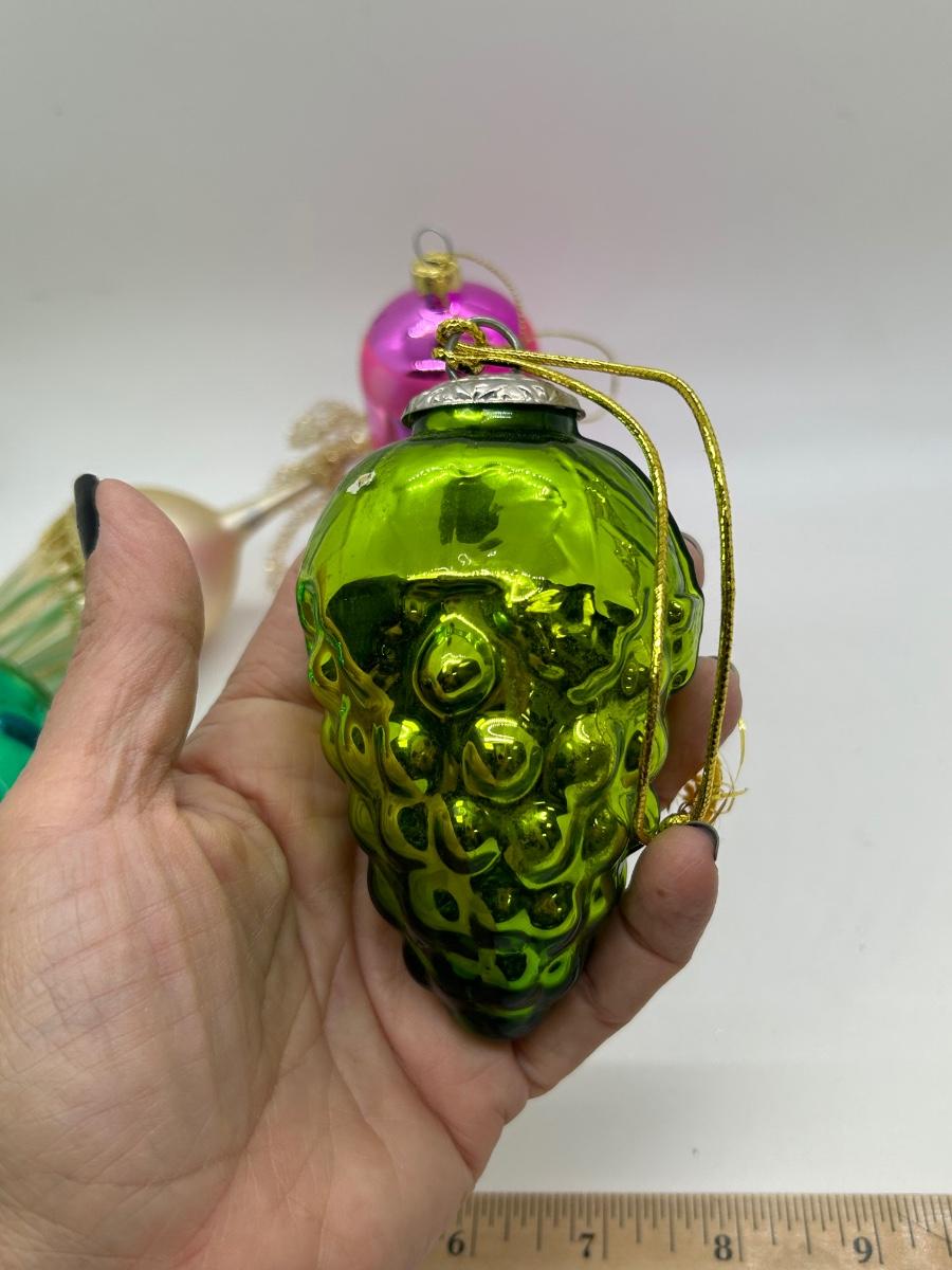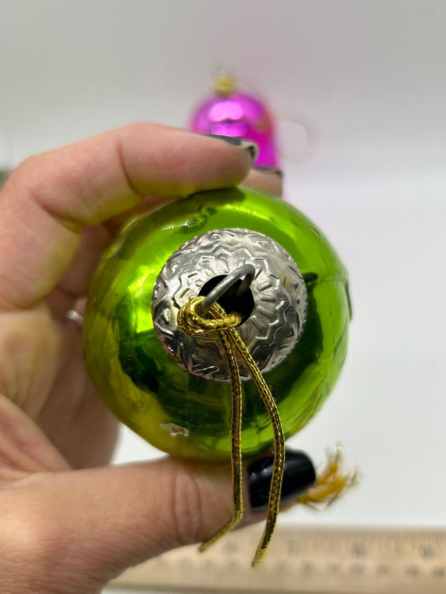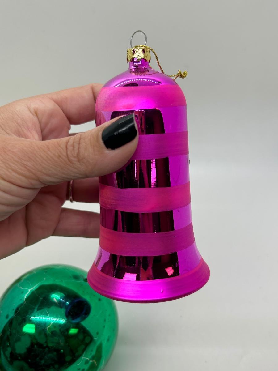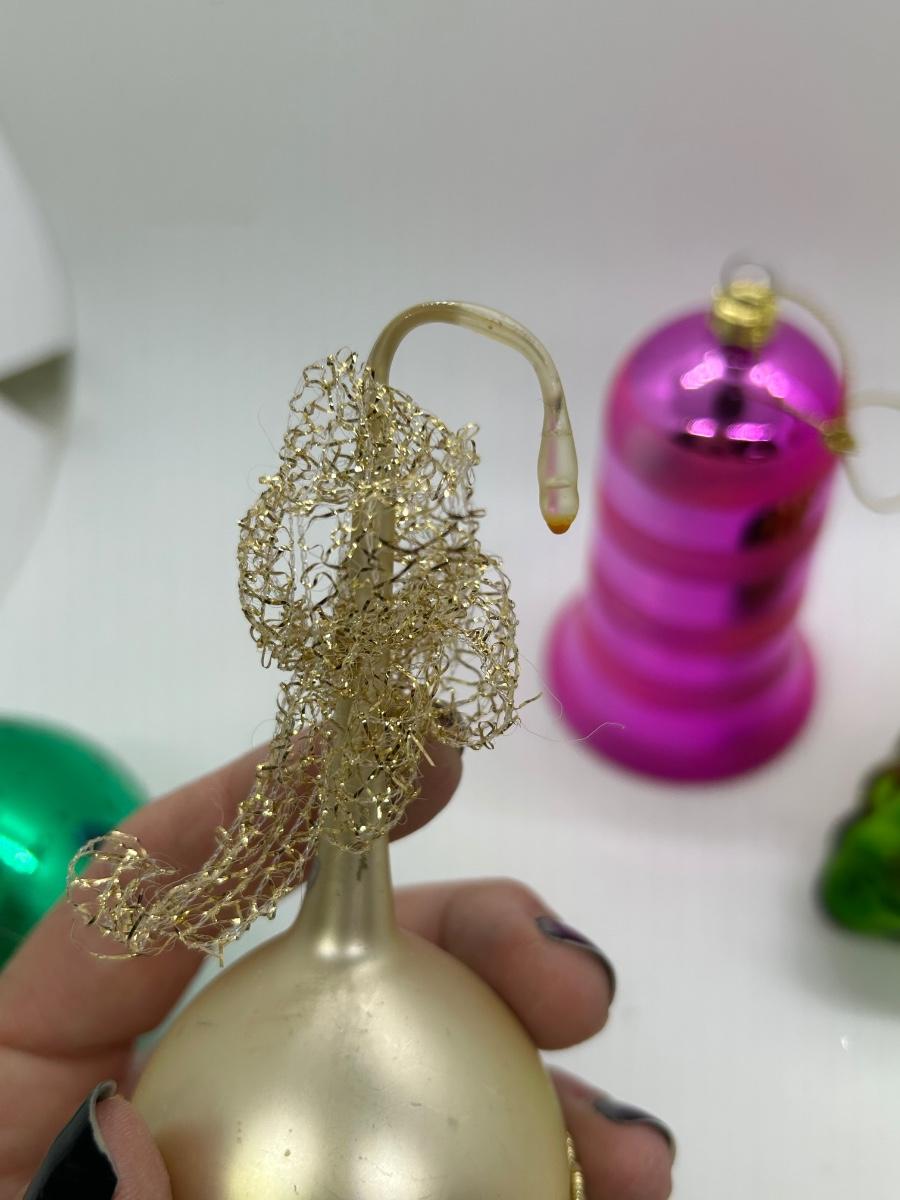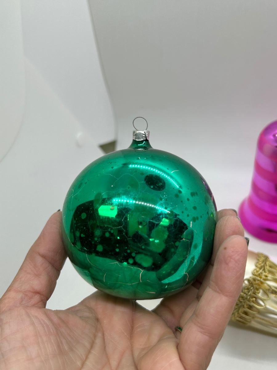 Mixed Lot of Christmas Holiday Ornaments Glass and Plastic. No broken ornaments just wear from age. The pink bell is plastic while the rest are made of glass.