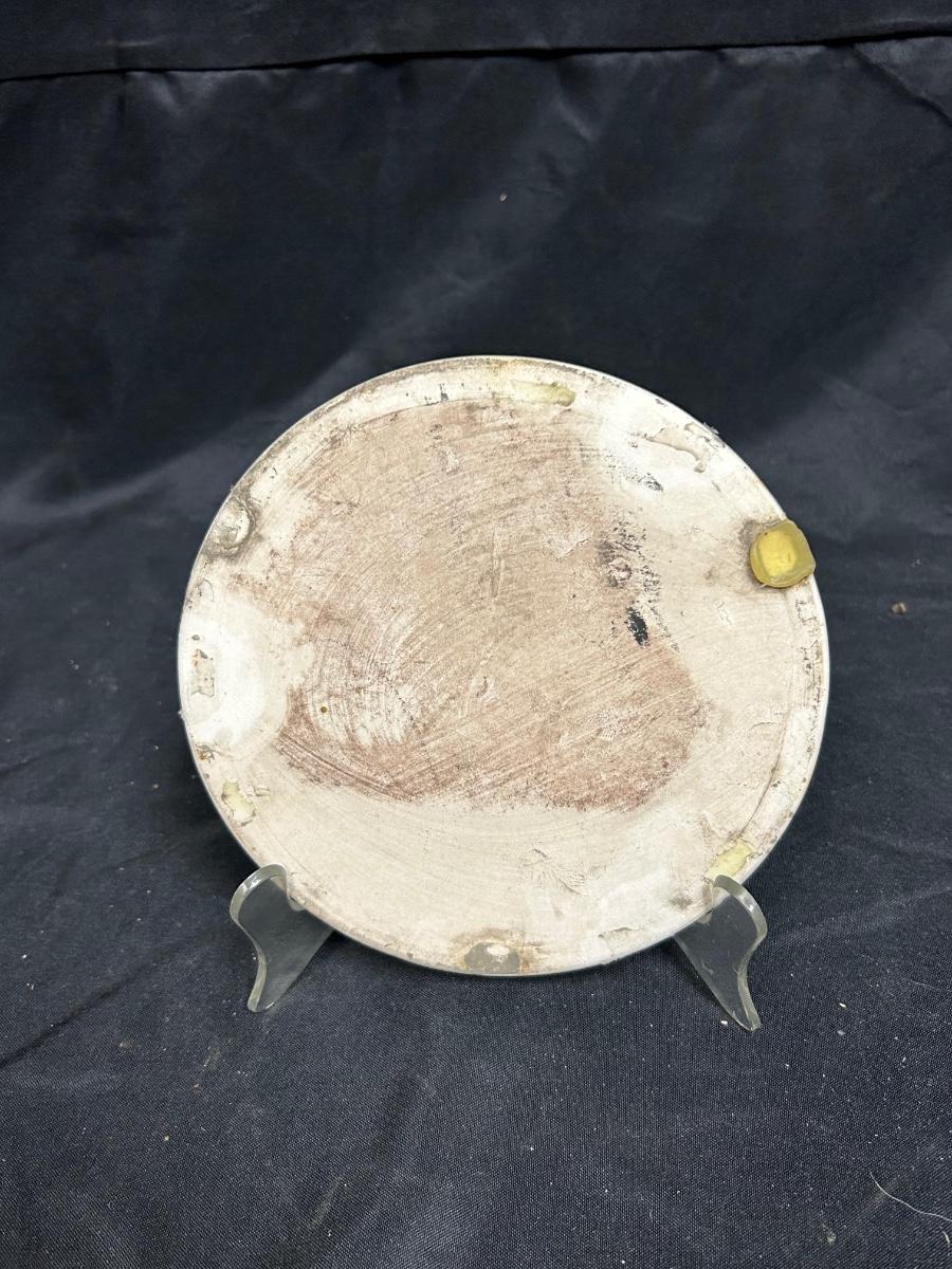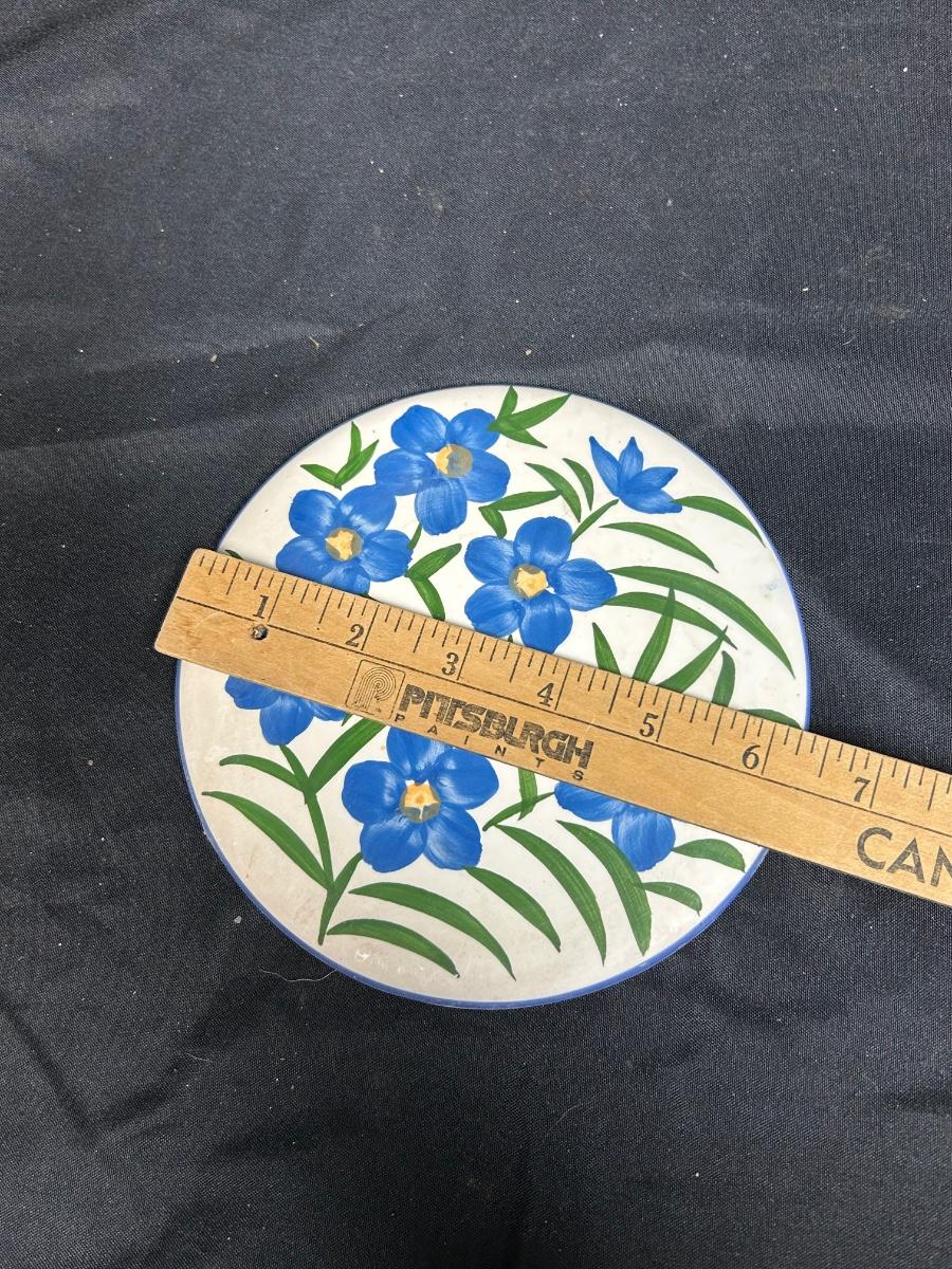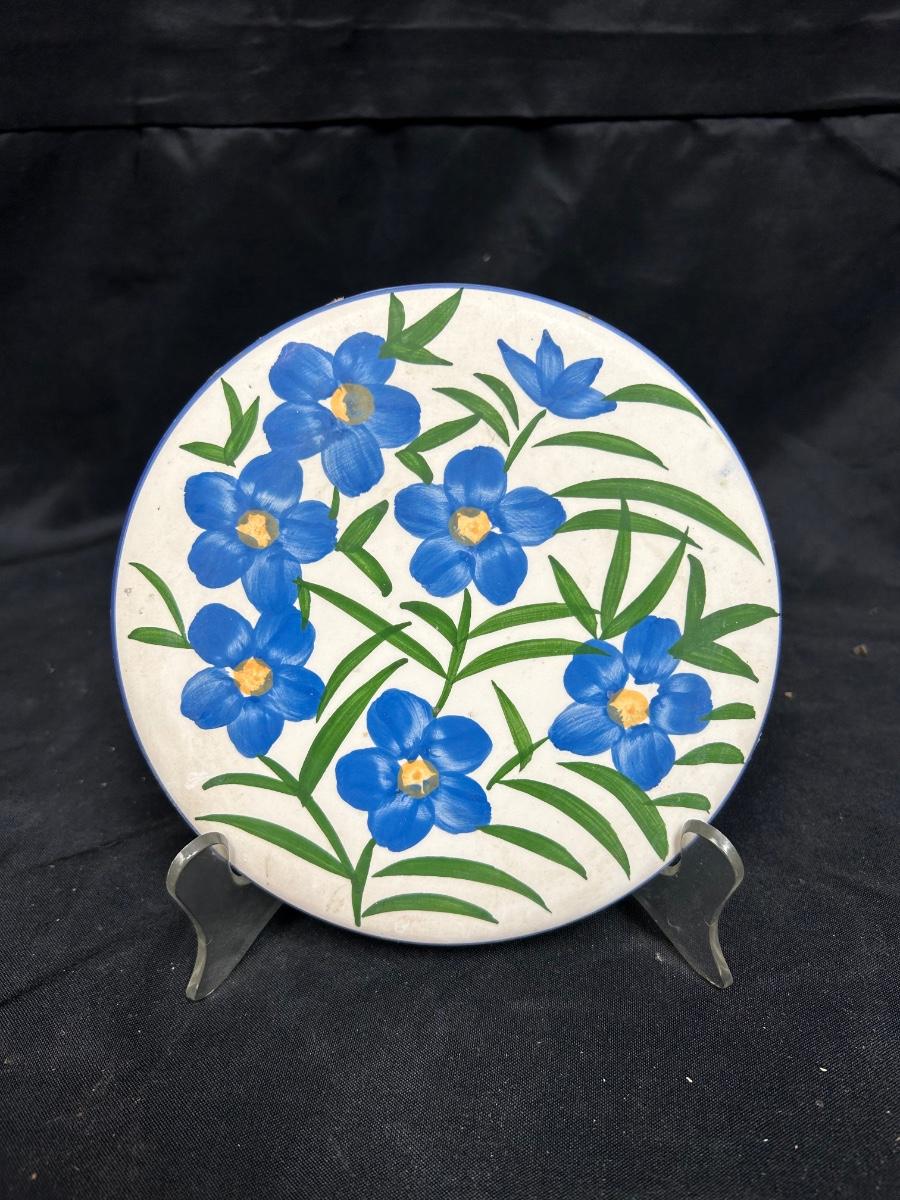 Small Round Ceramic Trivet Tile Painted Blue Flowers. In good used condition. Some light discolor from outside use. Just over 6" size.