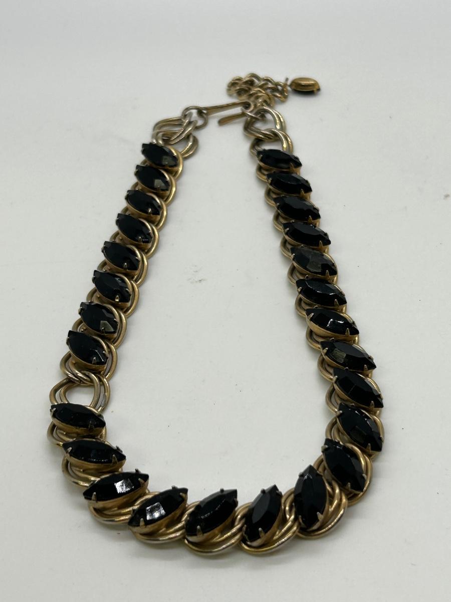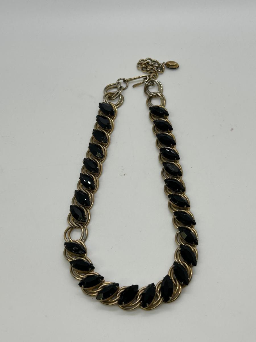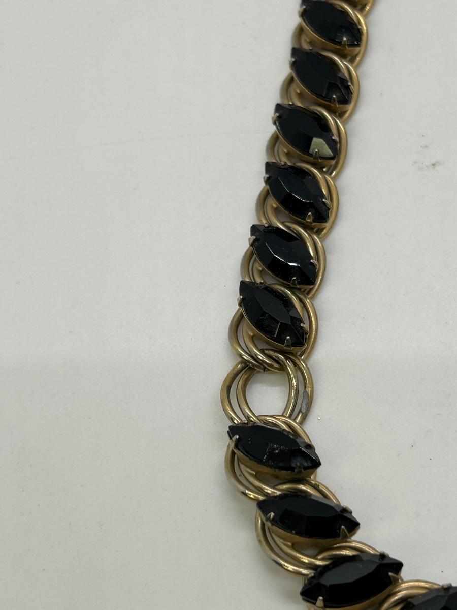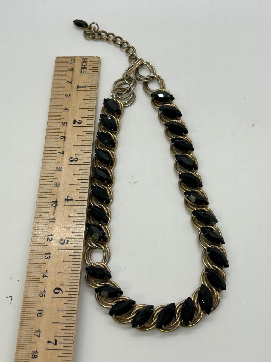 Chunky Gold Tone Metal and Black Rhinestone Choker Style Necklace. Missing one rhinestone on the necklace. Great for repurpose or modifying for wear.