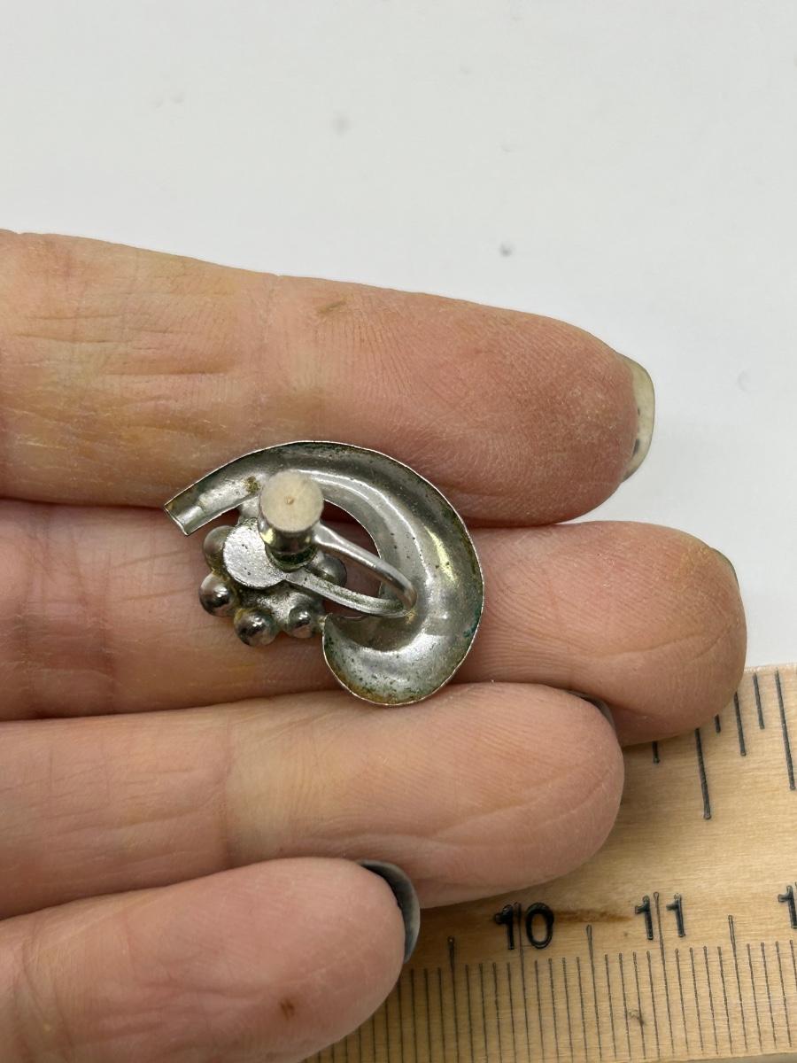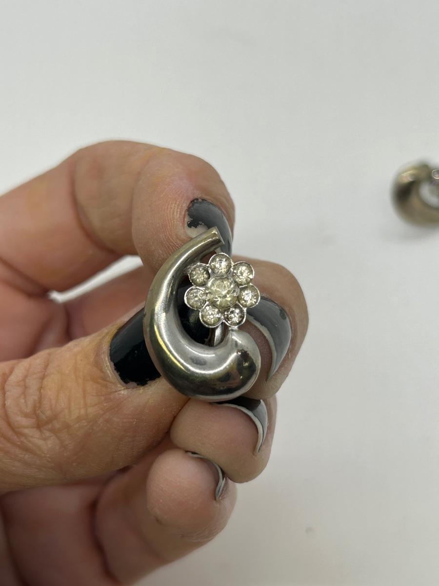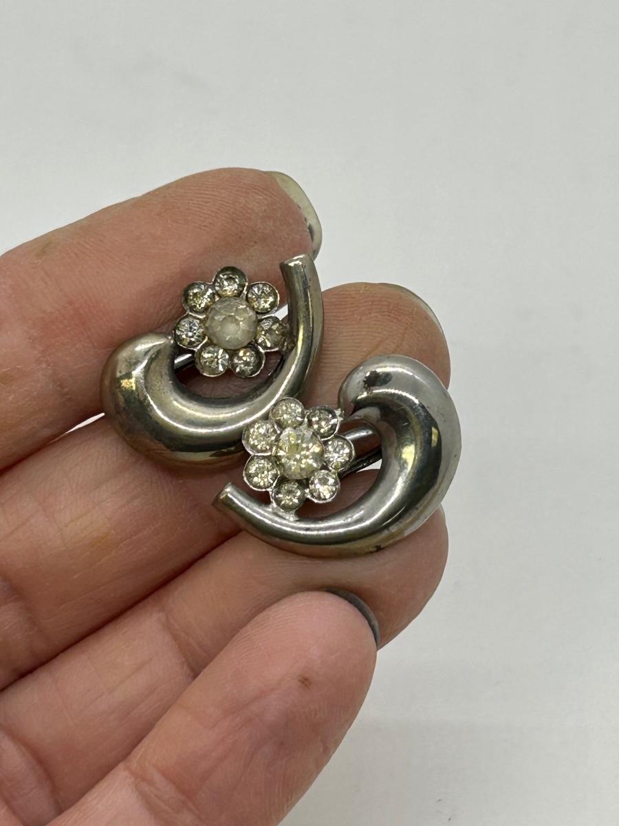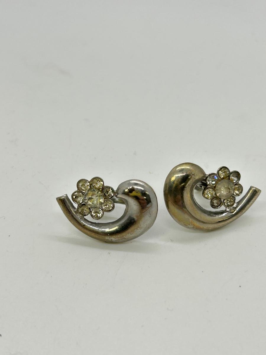Vintage Silver Tone Metal Swirl with Rhinestone Flower Screw Back Earrings. In good vintage condition. No sterling marks.