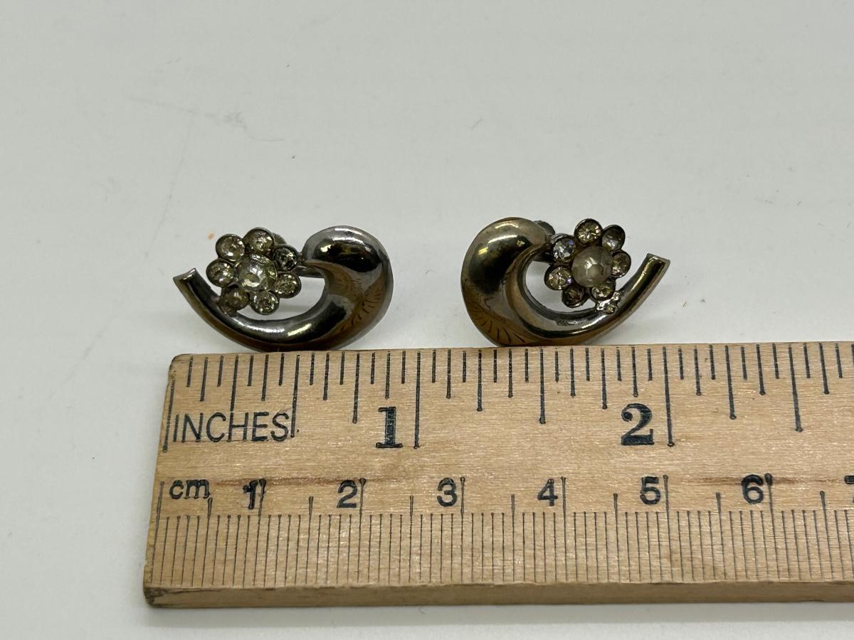 Vintage Silver Tone Metal Swirl with Rhinestone Flower Screw Back Earrings