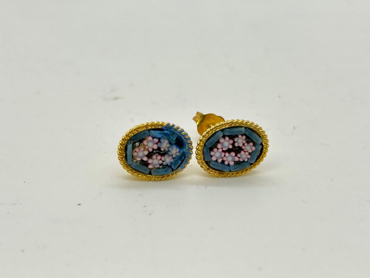 Vintage Flower Floral Mosaic Inlaid Oval Earrings for Pierced Ears