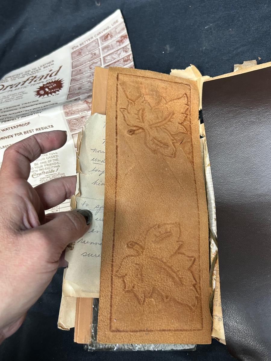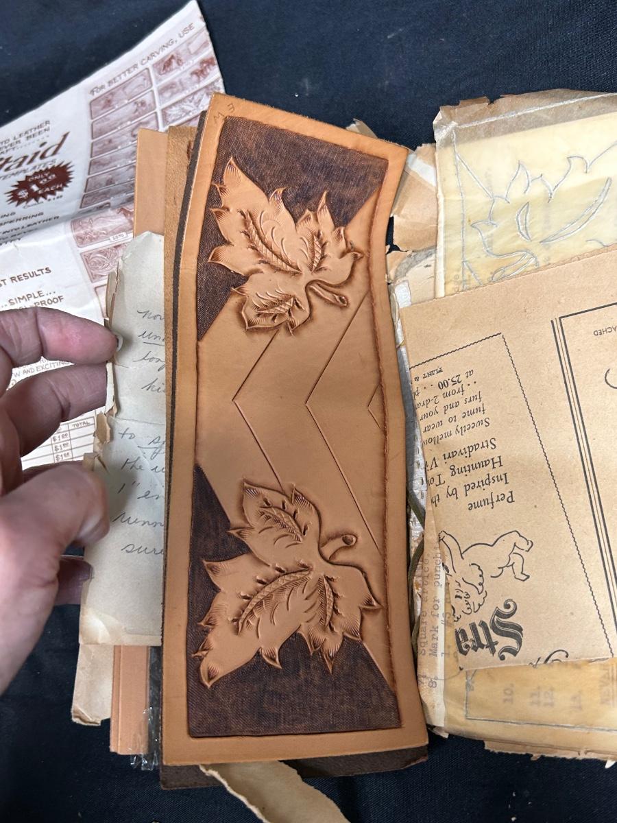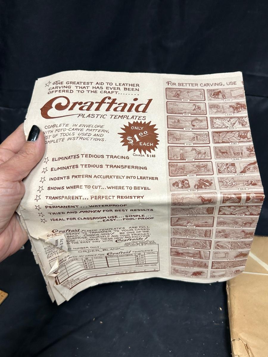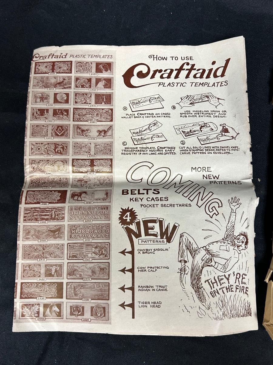 Retro Vintage Leather Strip Pieces for Crafting and Jewelry Making with Old Template Ad. Ad is worn but the leather seems to be good. Some pieces have been embossed and are partially finished.