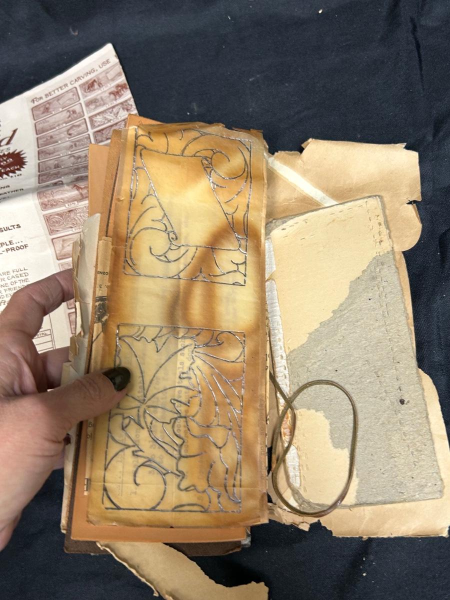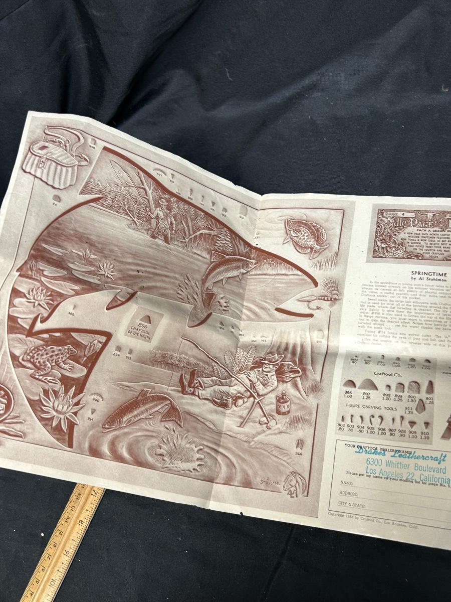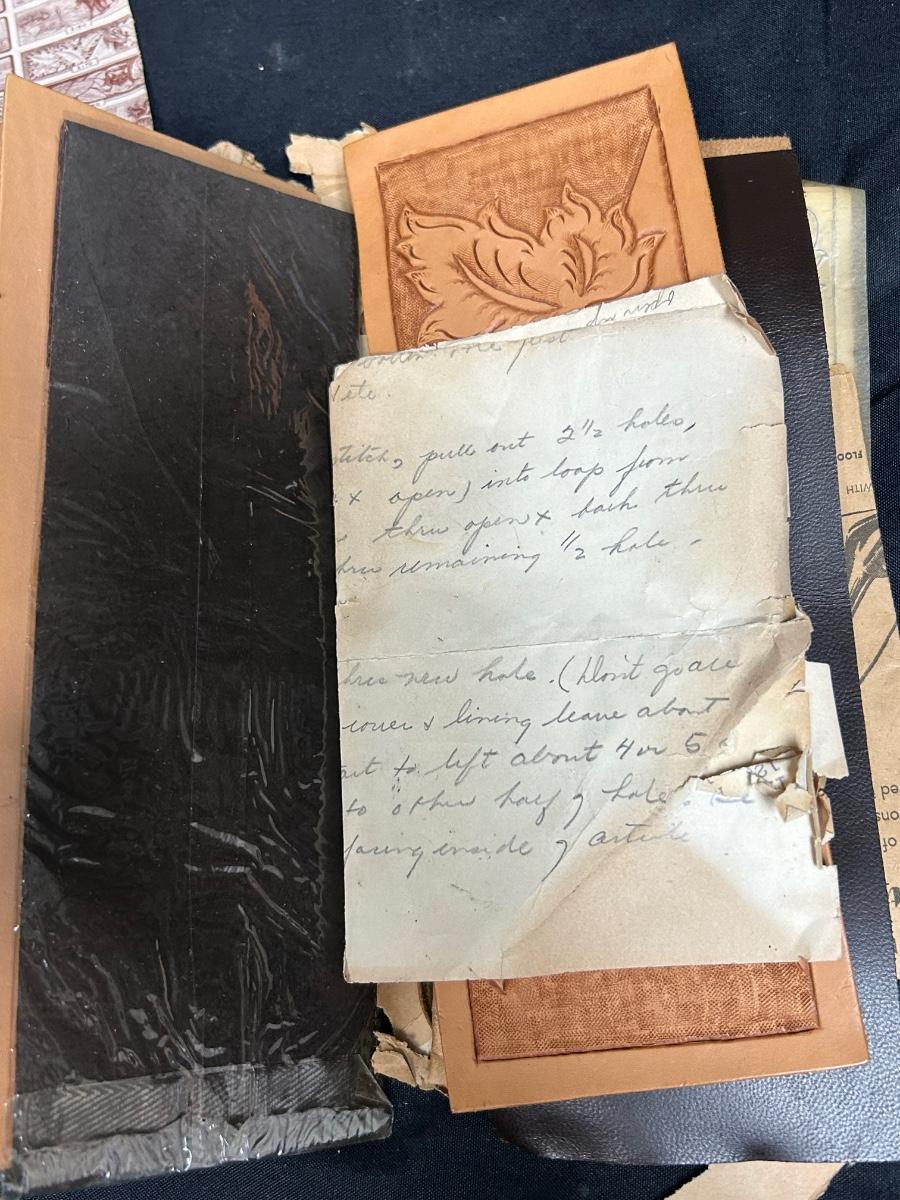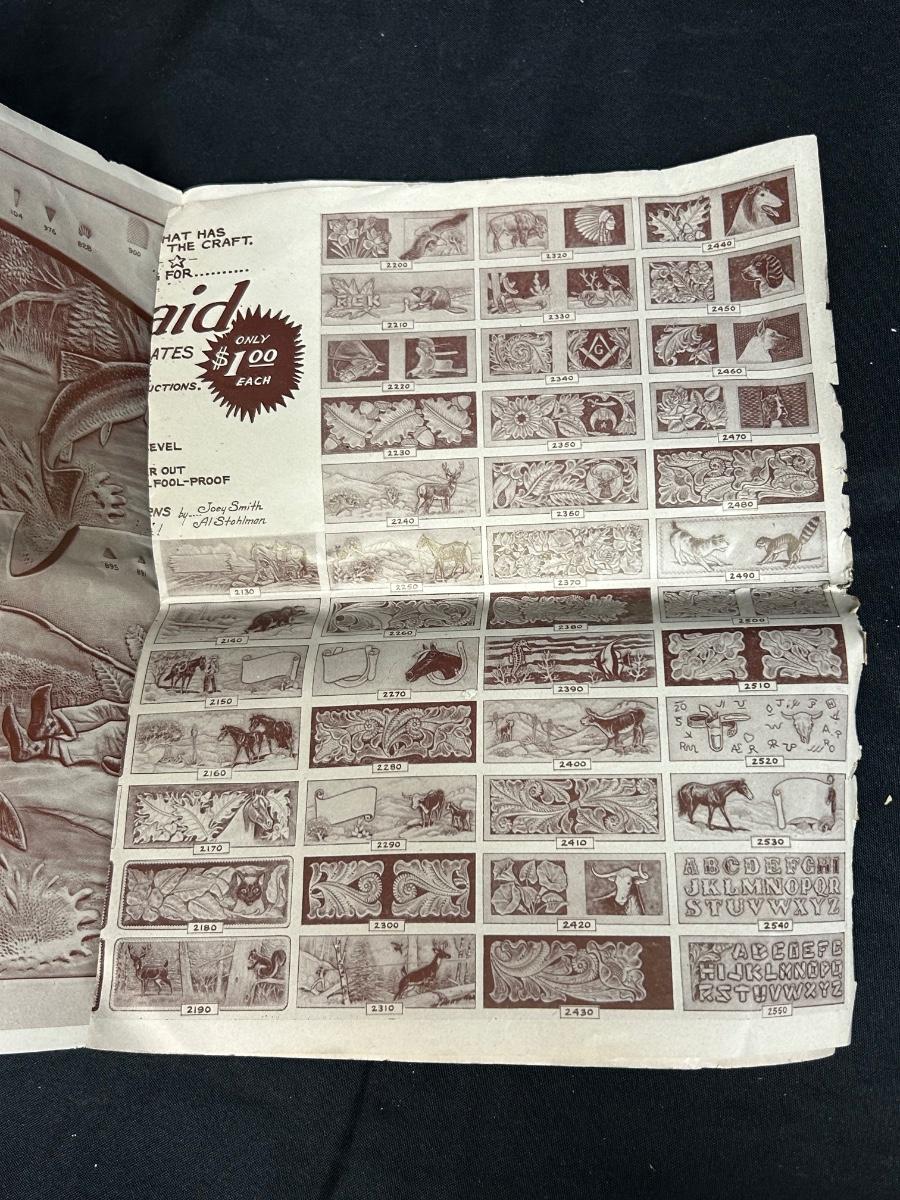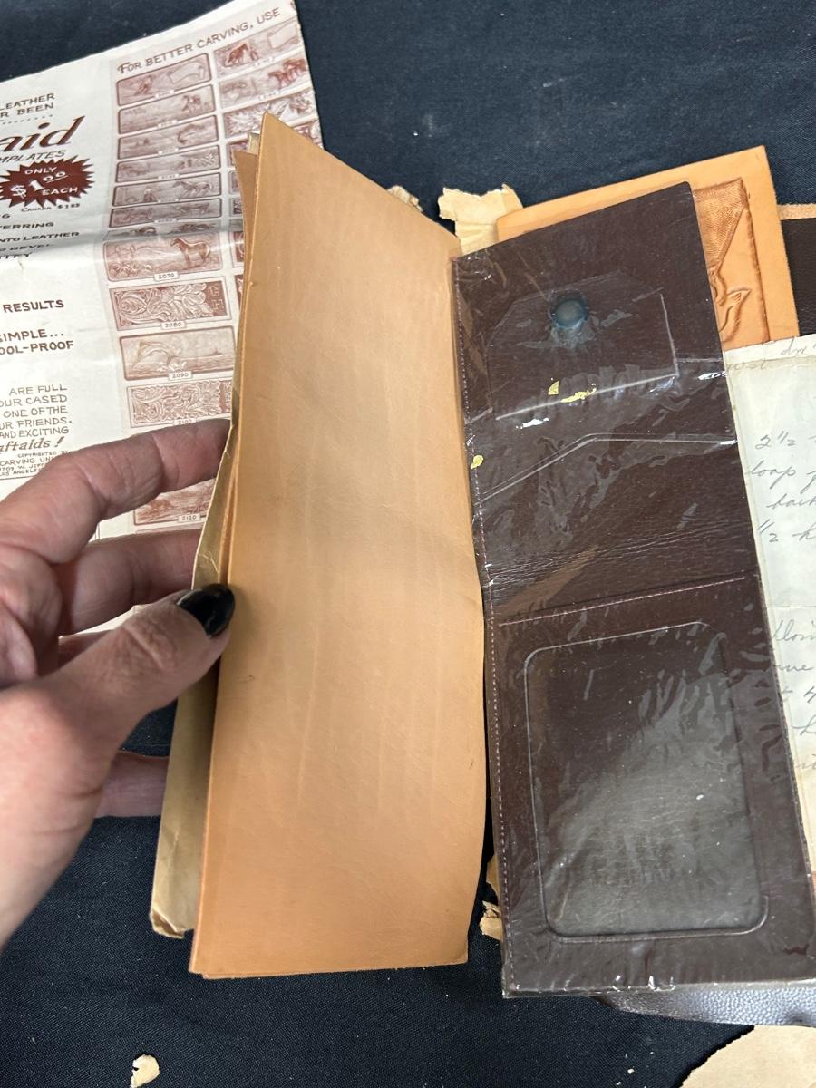 Retro Vintage Leather Strip Pieces for Crafting and Jewelry Making with Old Template Ad. Ad is worn but the leather seems to be good. Some pieces have been embossed and are partially finished.