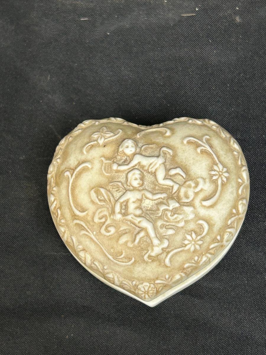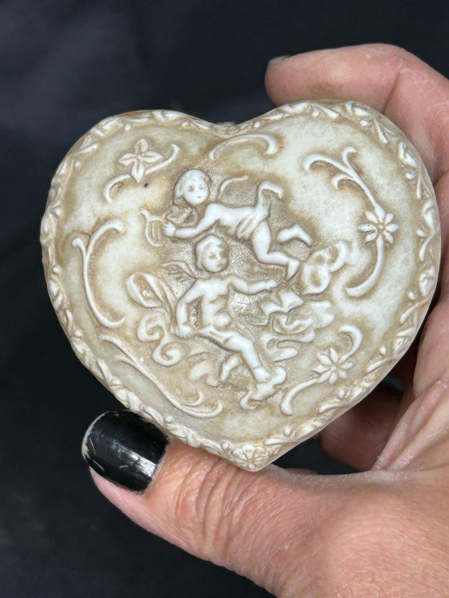 Vintage Bisque Porcelain Heart Shaped Trinket Box with Cherubs on Top. In vintage condition. No chips or cracks but the lid does not close completely. About 3" size.