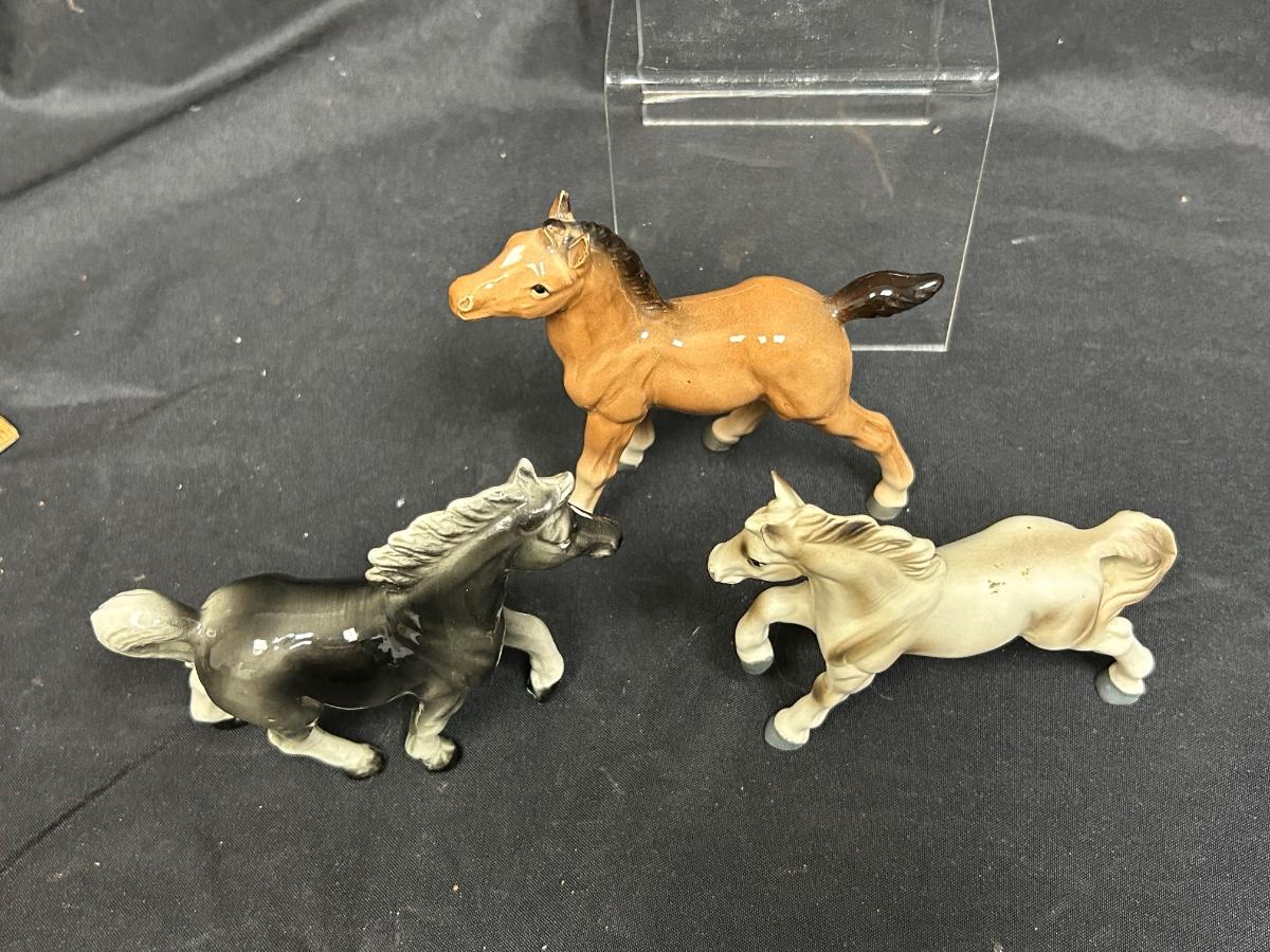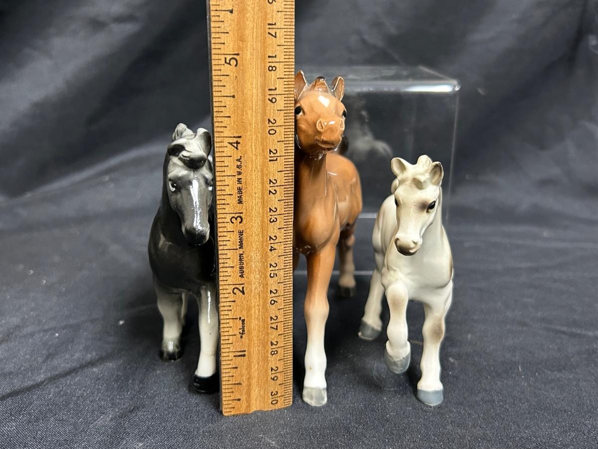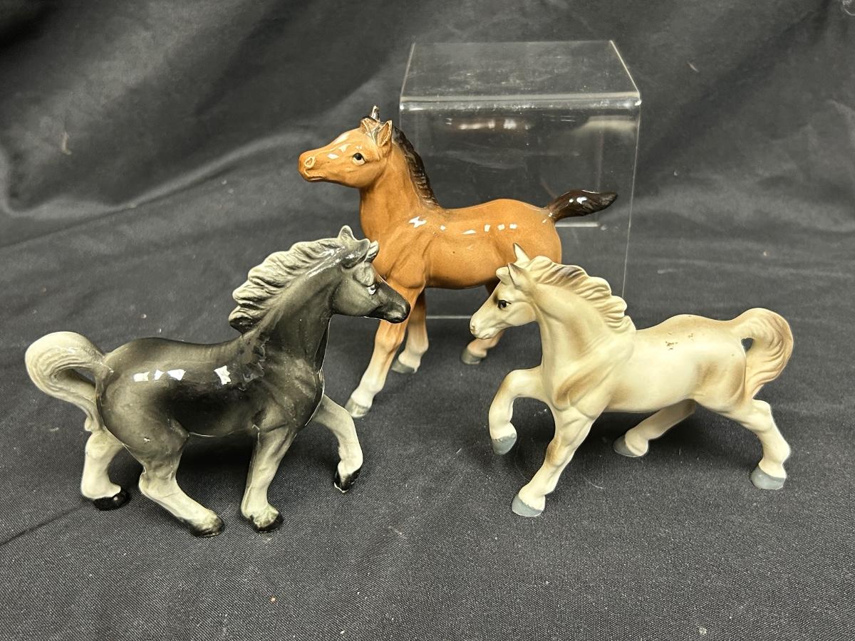 Vintage Ceramic Porcelain Horse Pony Stallion Figurines Japan. Lot of three. Different colors, all about the same size. No damage noticed. About 5" size