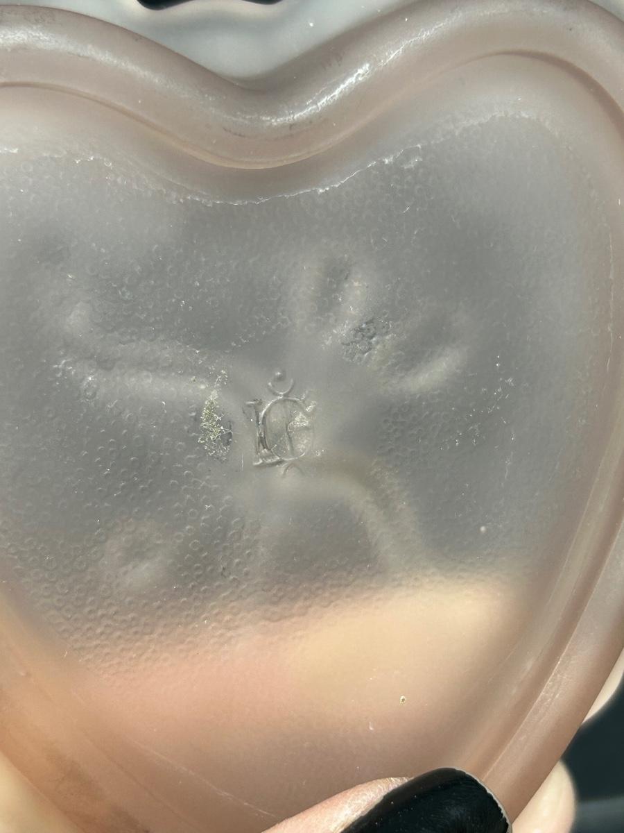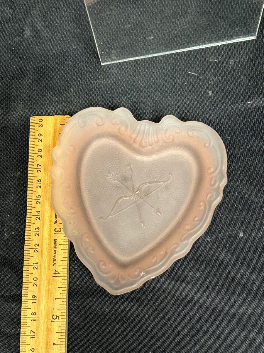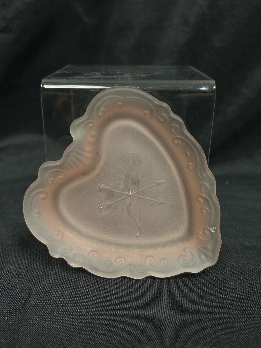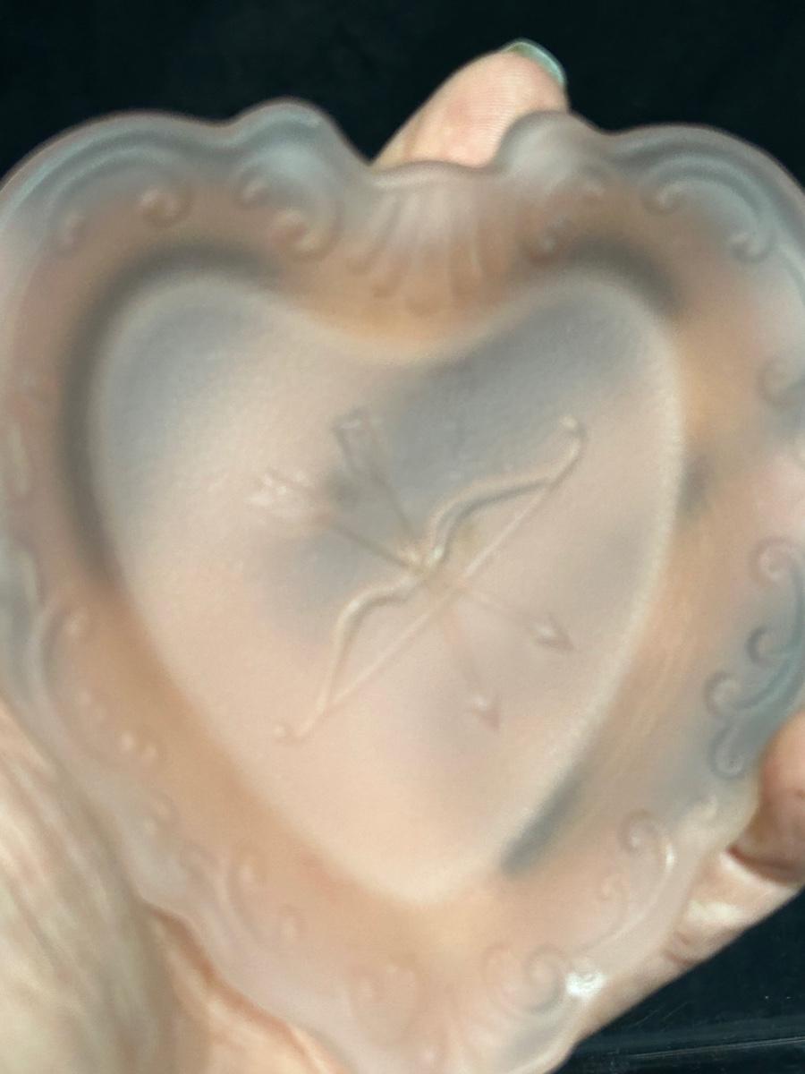 Pink Frosted Opaque Glass Heart Shaped Trinket Dish with Cupid Bow & Arrow in Center. In good condition. No chips. A little over 4" size.