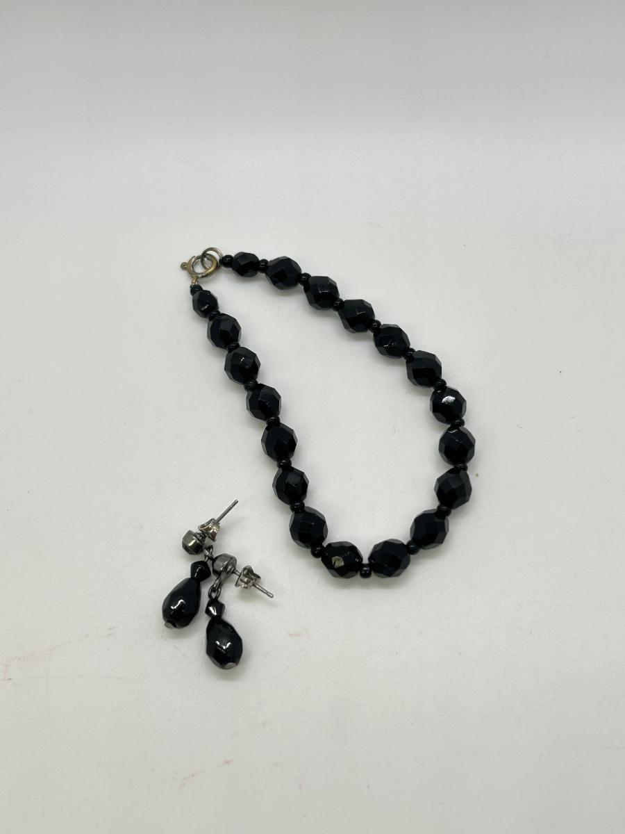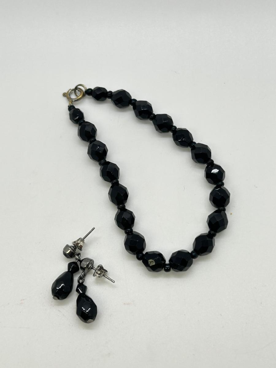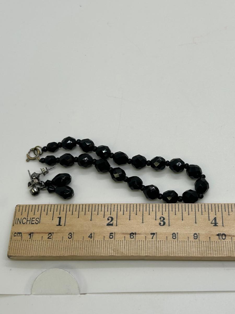 Black Faceted Bead Choker Style Necklace with Dangling Drop Earrings. In good vintage condition. Earrings are for pierced ears.