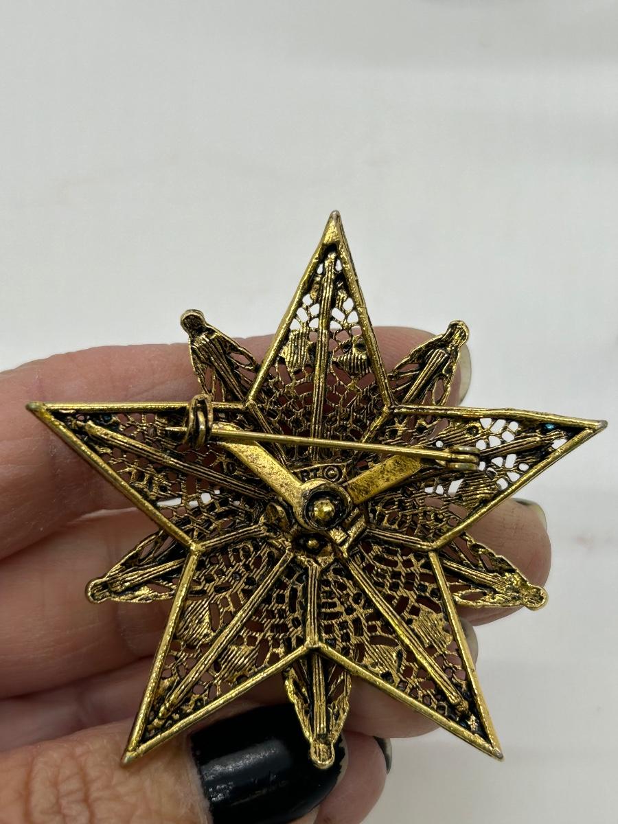 Vintage Filigree Dark Gold Tone Star Shaped Pin Brooch with Tiny Flower Accents and Cabochon Center