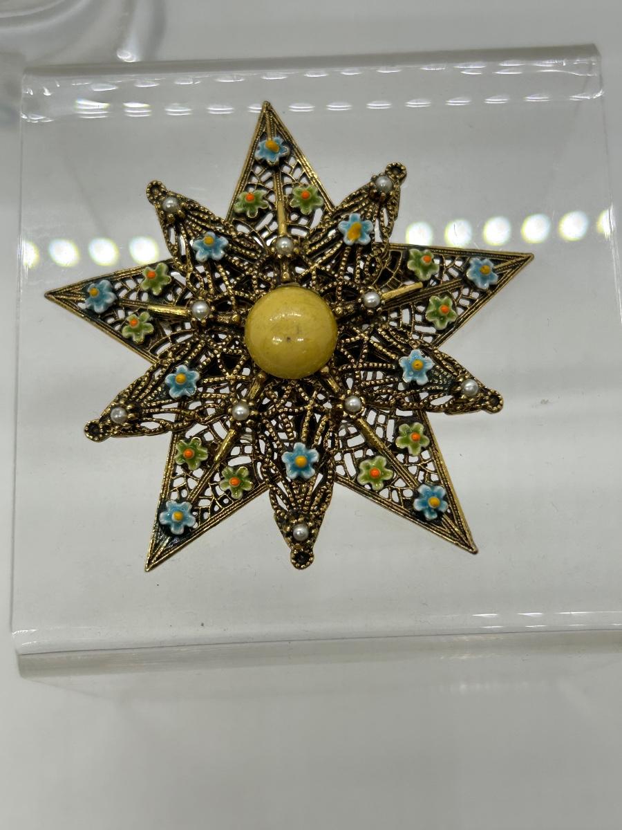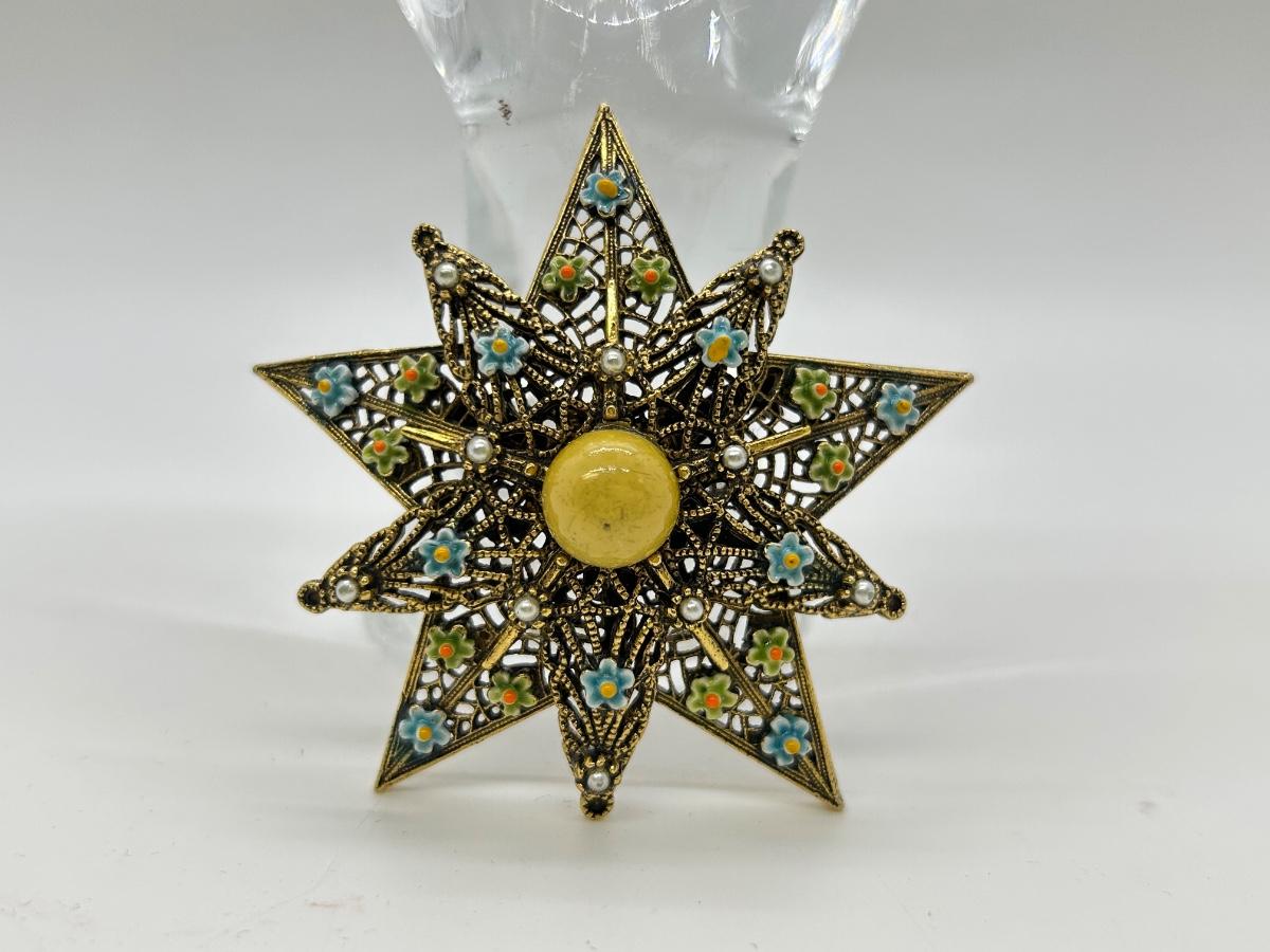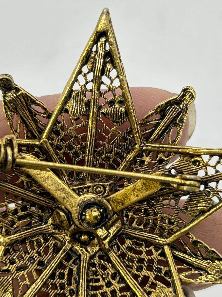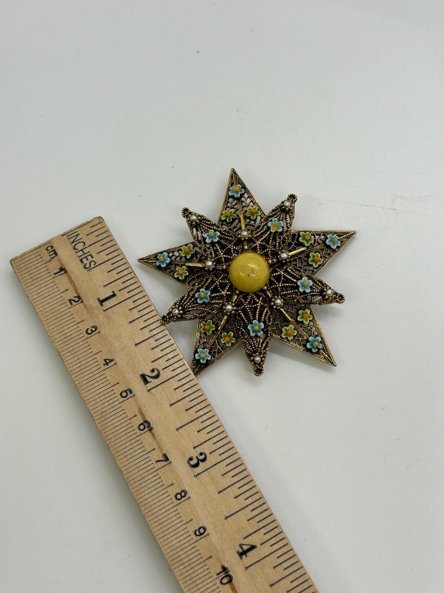Vintage Filigree Dark Gold Tone Star Shaped Pin Brooch with Tiny Flower Accents and Cabochon Center. In good condition. Does look to be signed but part of the name might be behind the pin part.