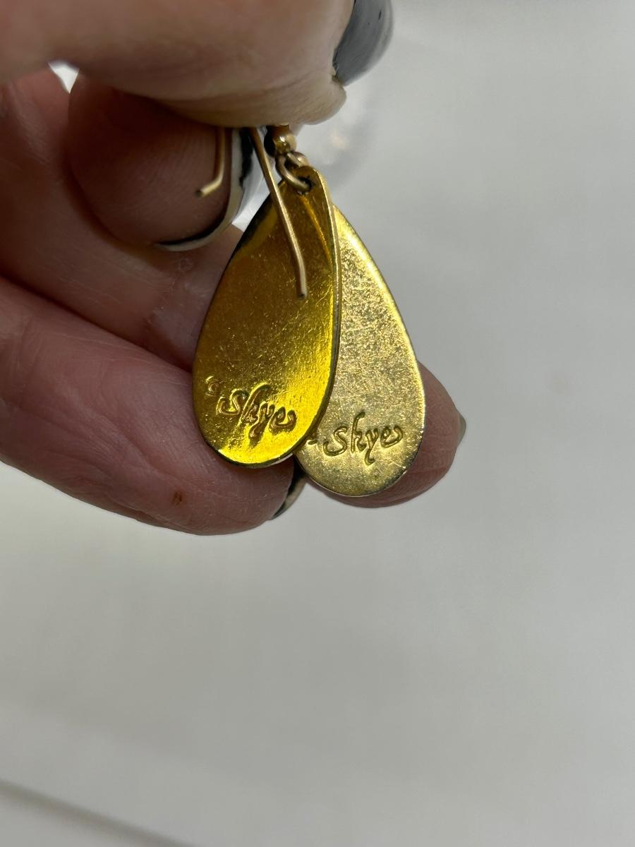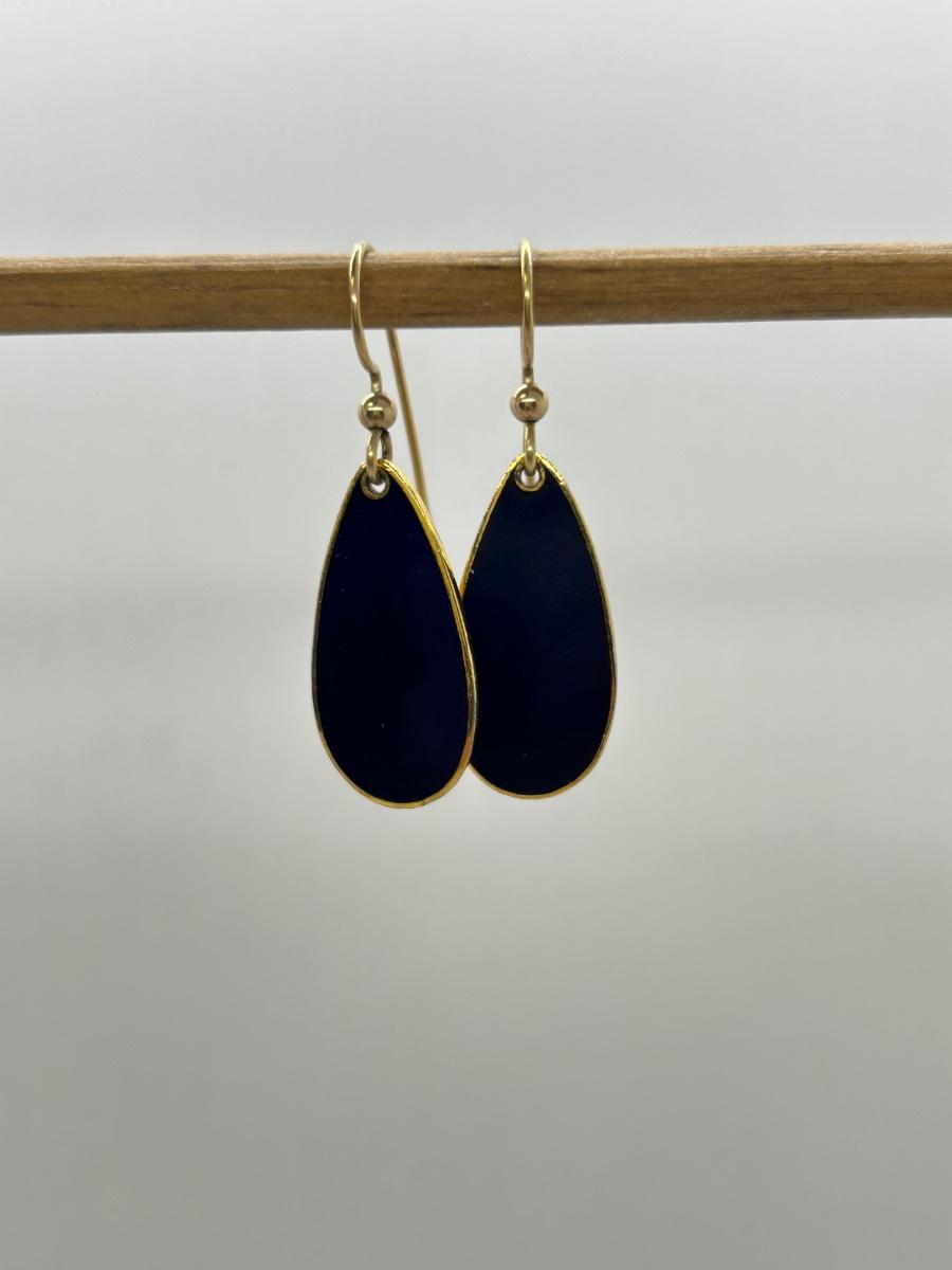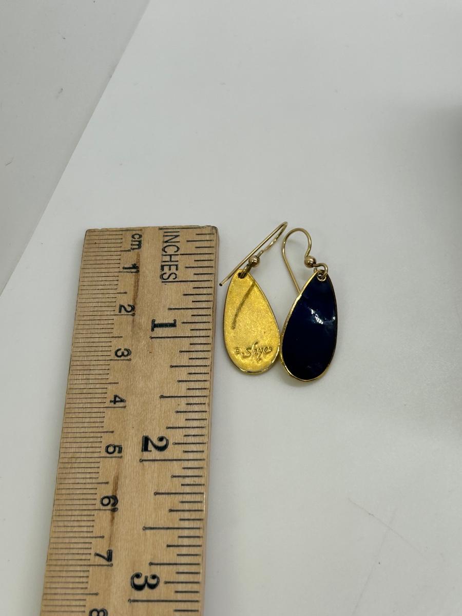 Pair of Raindrop Shaped Gold Tone and Enamel Dangling Earrings for Pierced Ears. In good condition. Signed on the back.