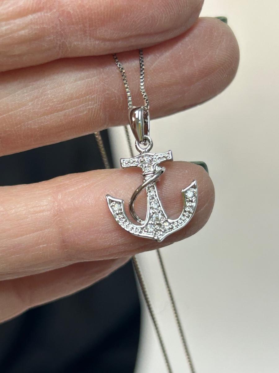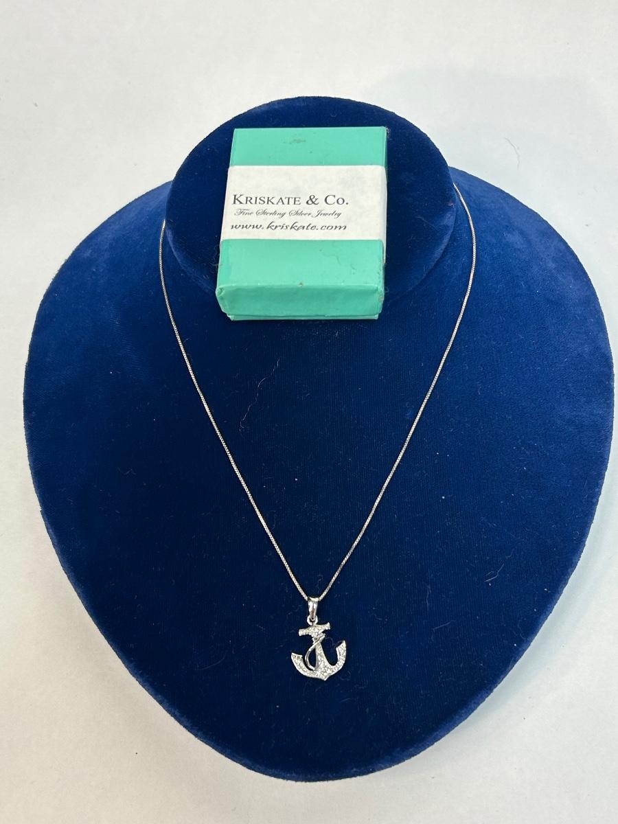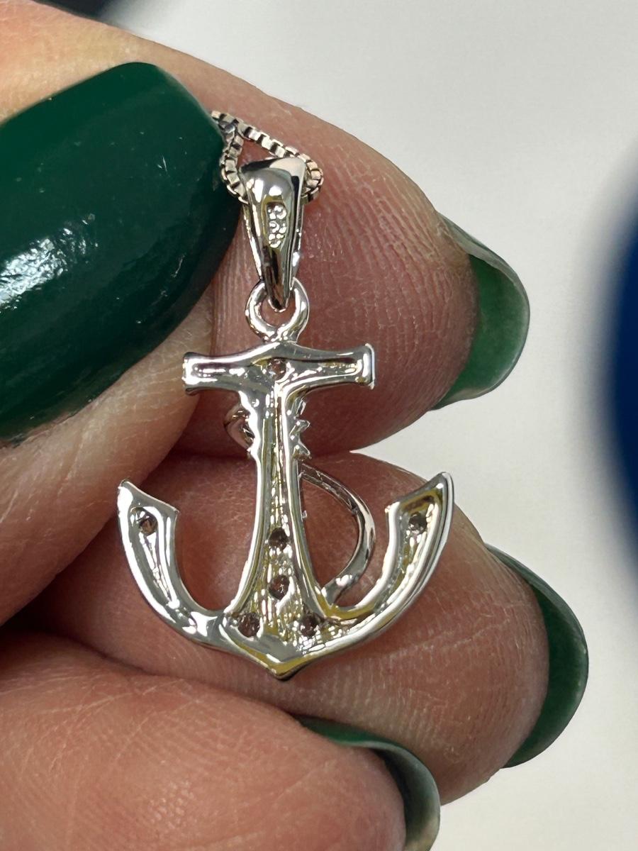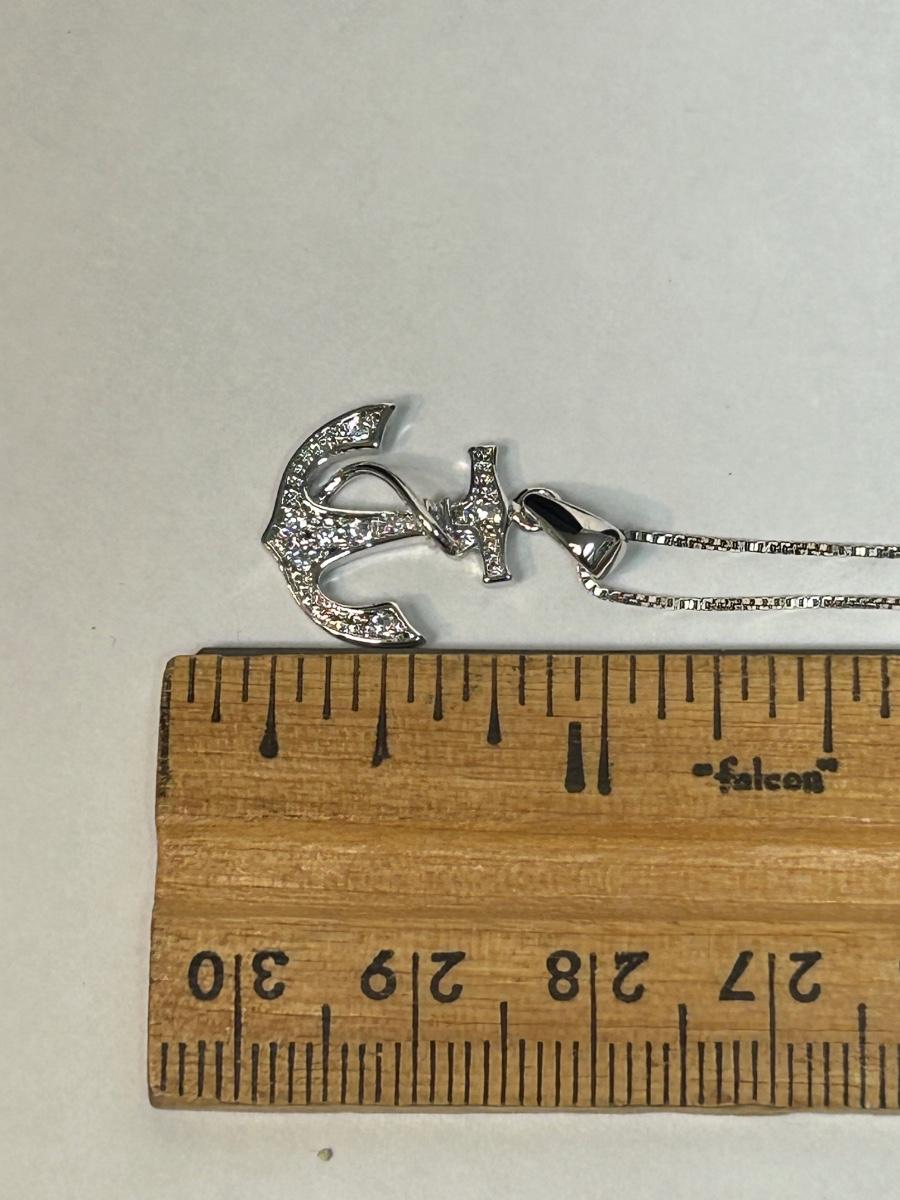 Sterling Silver 925 Ships Anchor Nautical Fashion Necklace with Rhinestone Accents. In good condition. Comes in small box.