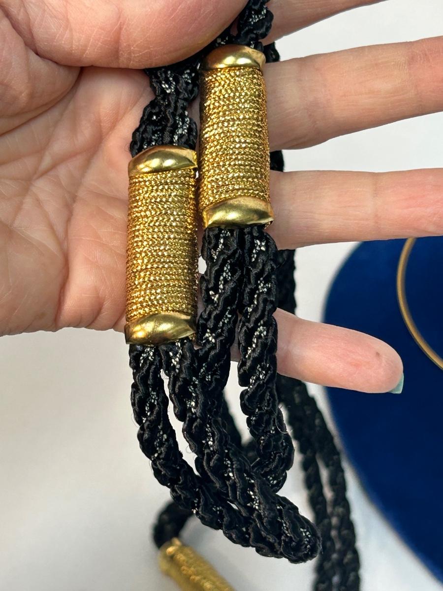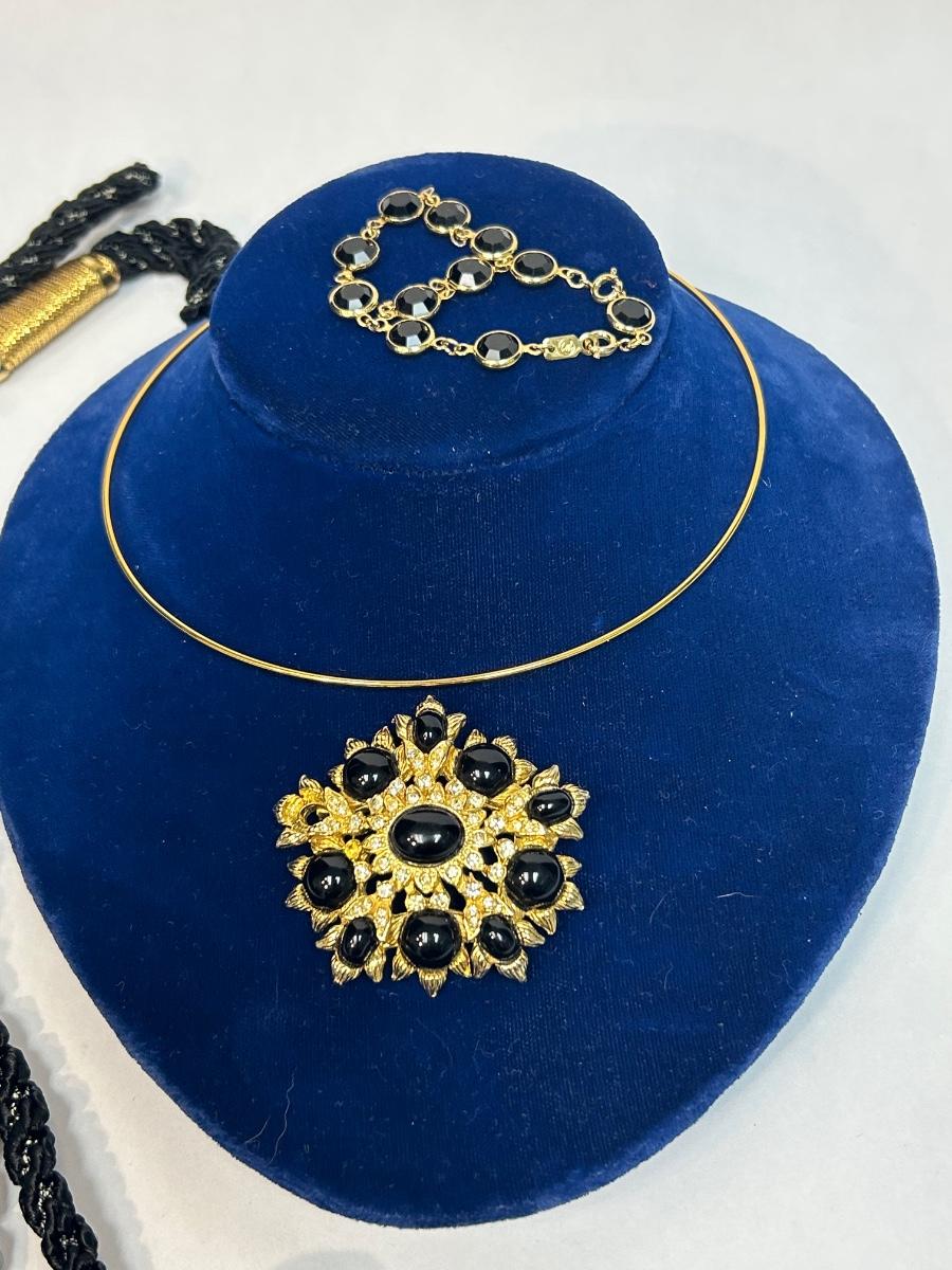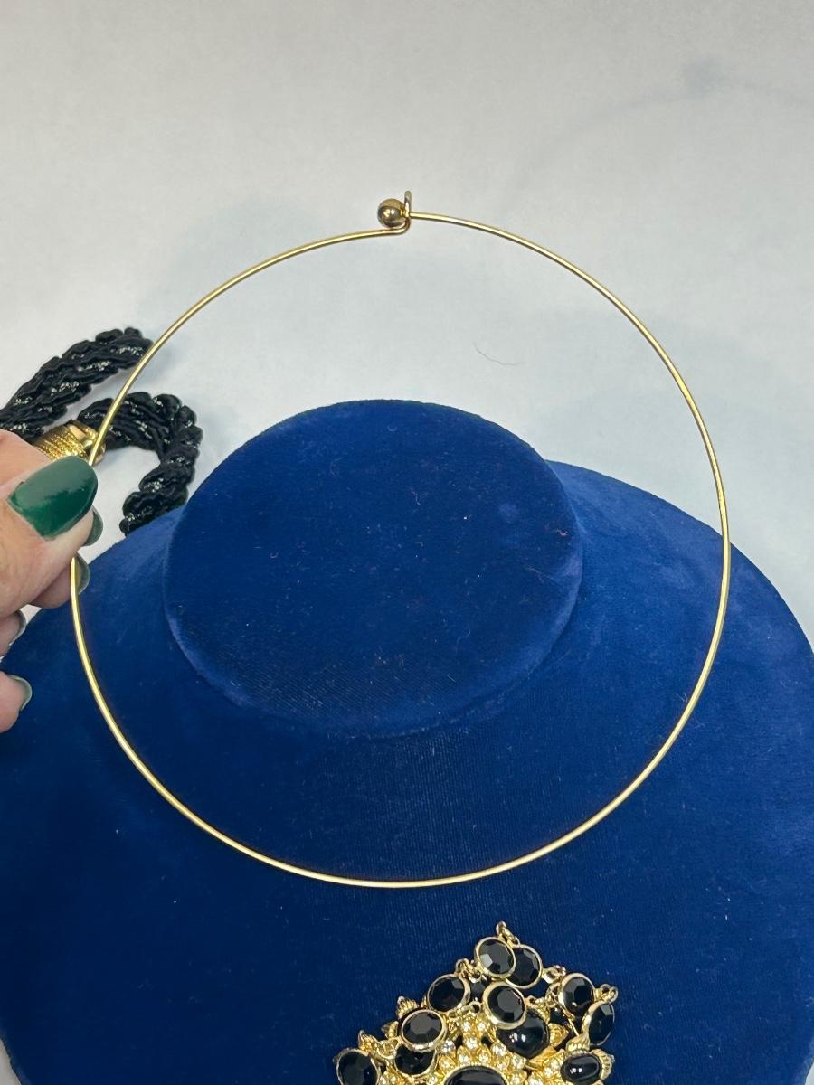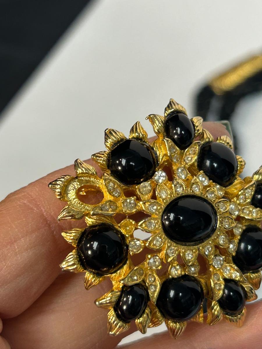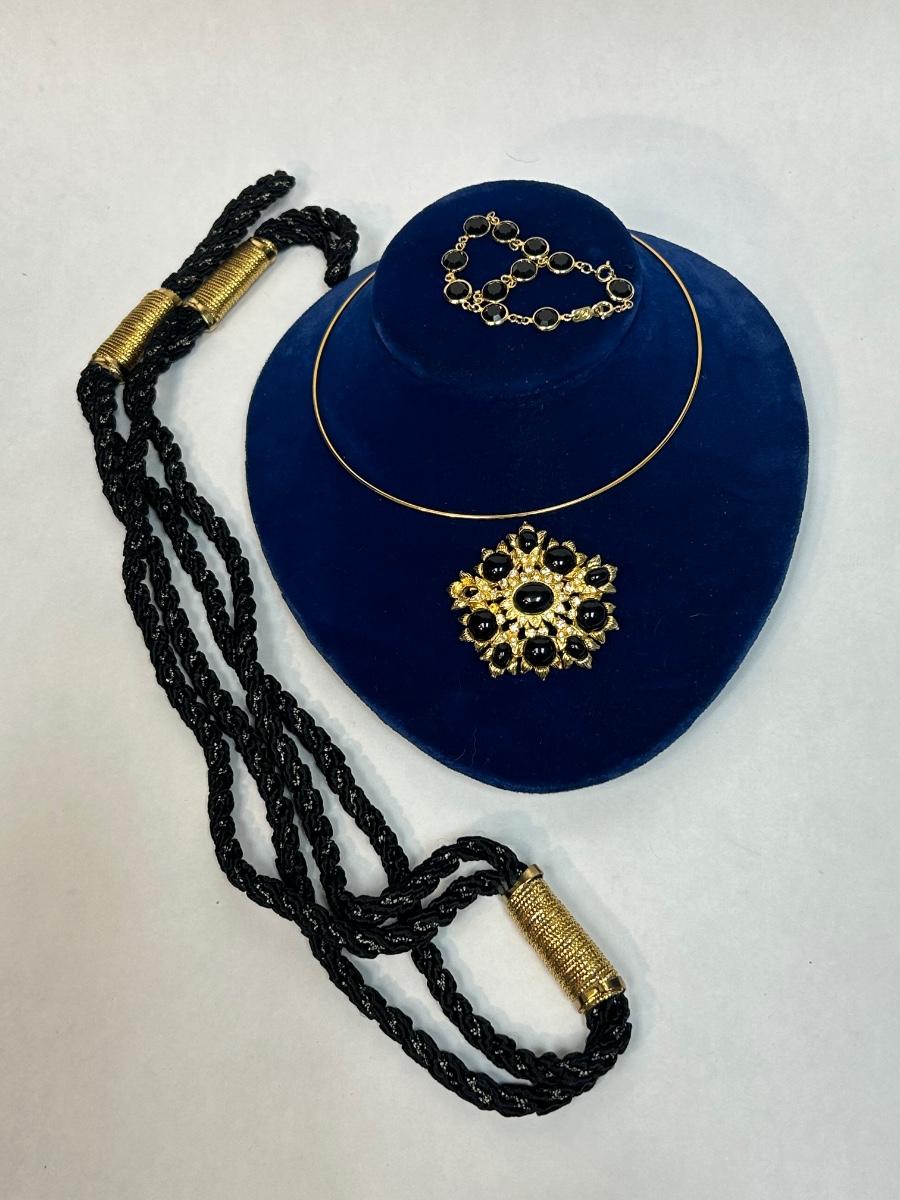 Black and Gold Jewelry Lot of Repurpose and Repair. 4 piece lot. The pin is missing a cabochon and the bracelet needs to be fixed.