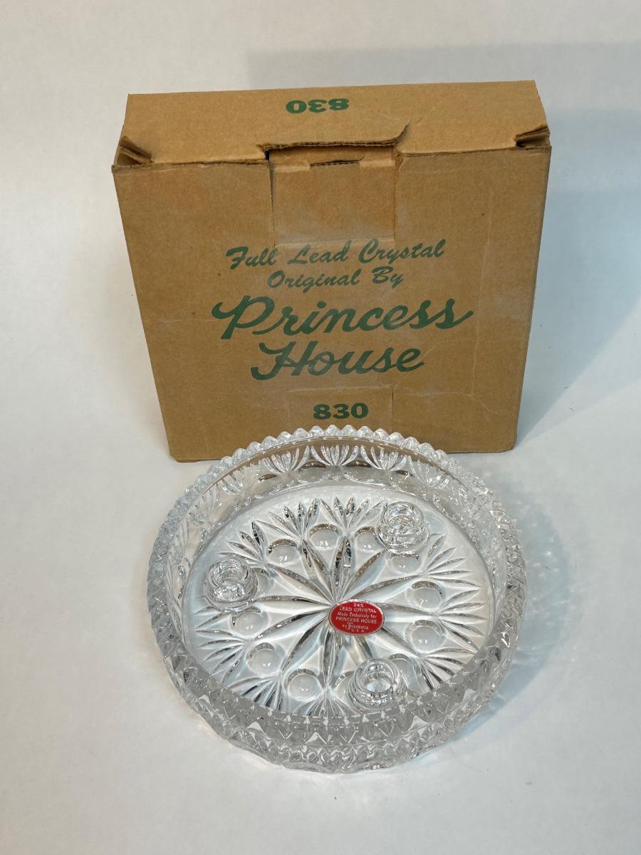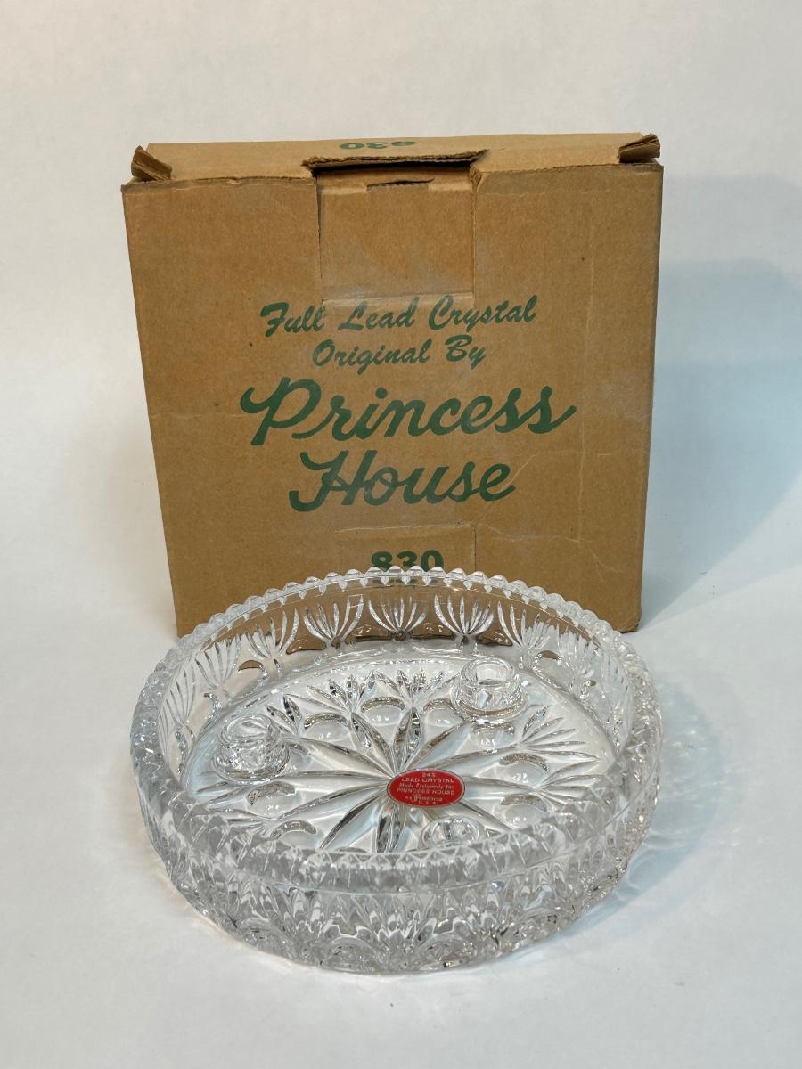 Vintage Fostoria for Princess House Lead Crystal Three Taper Candle Holder Dish with Original Box. In very good condition. Still has the original Princess House/ Fostoria sticker attached to the dish. About 6" size.