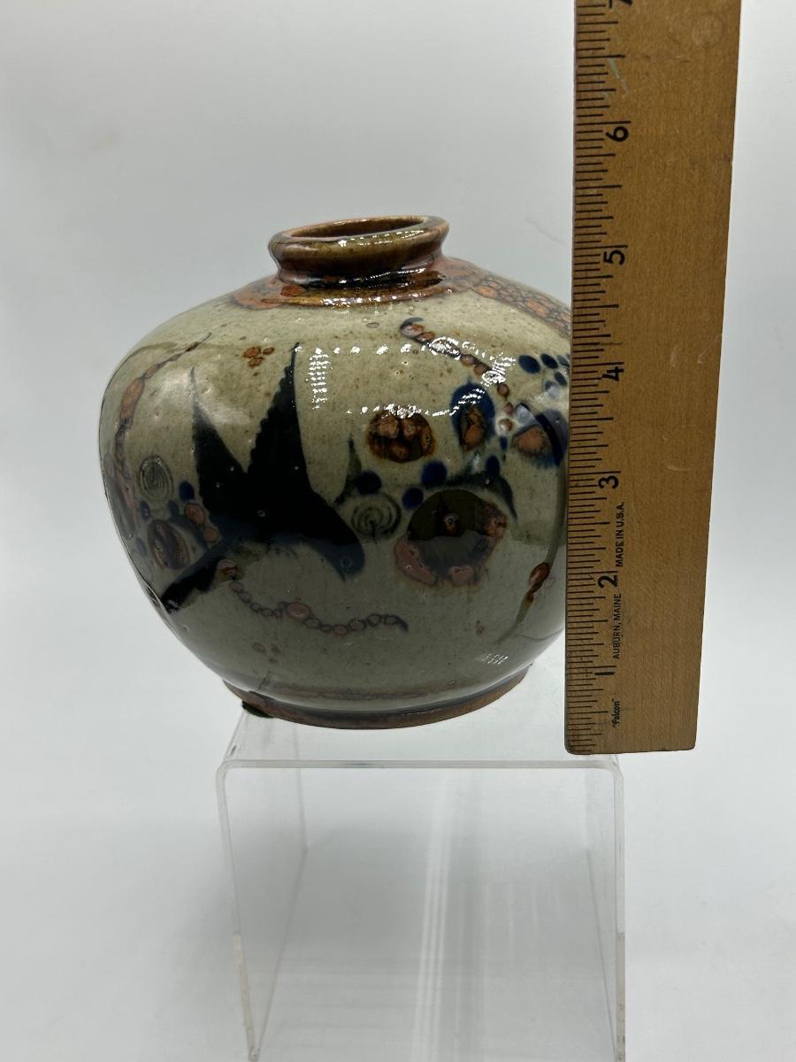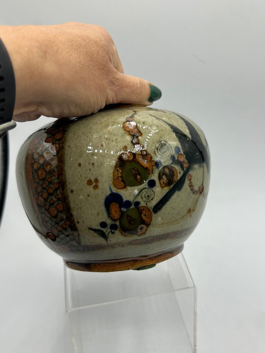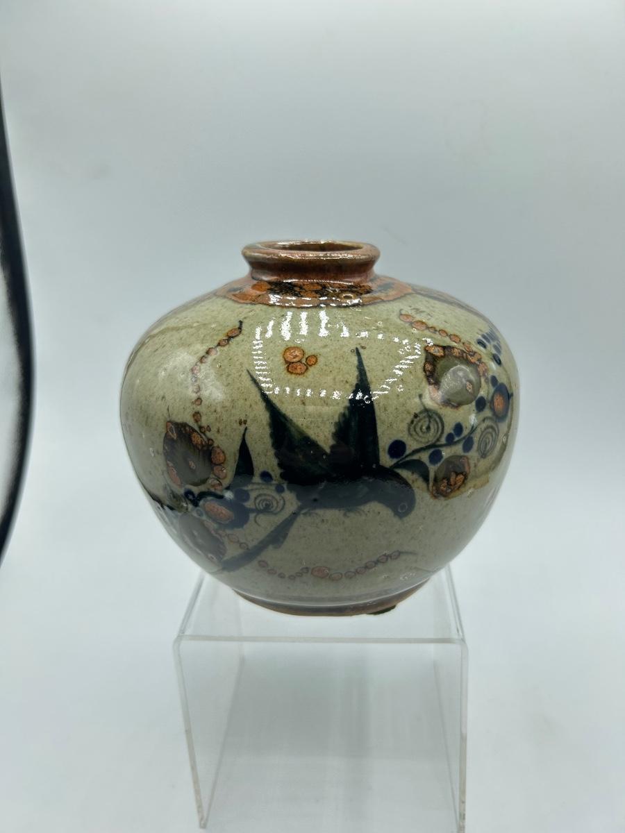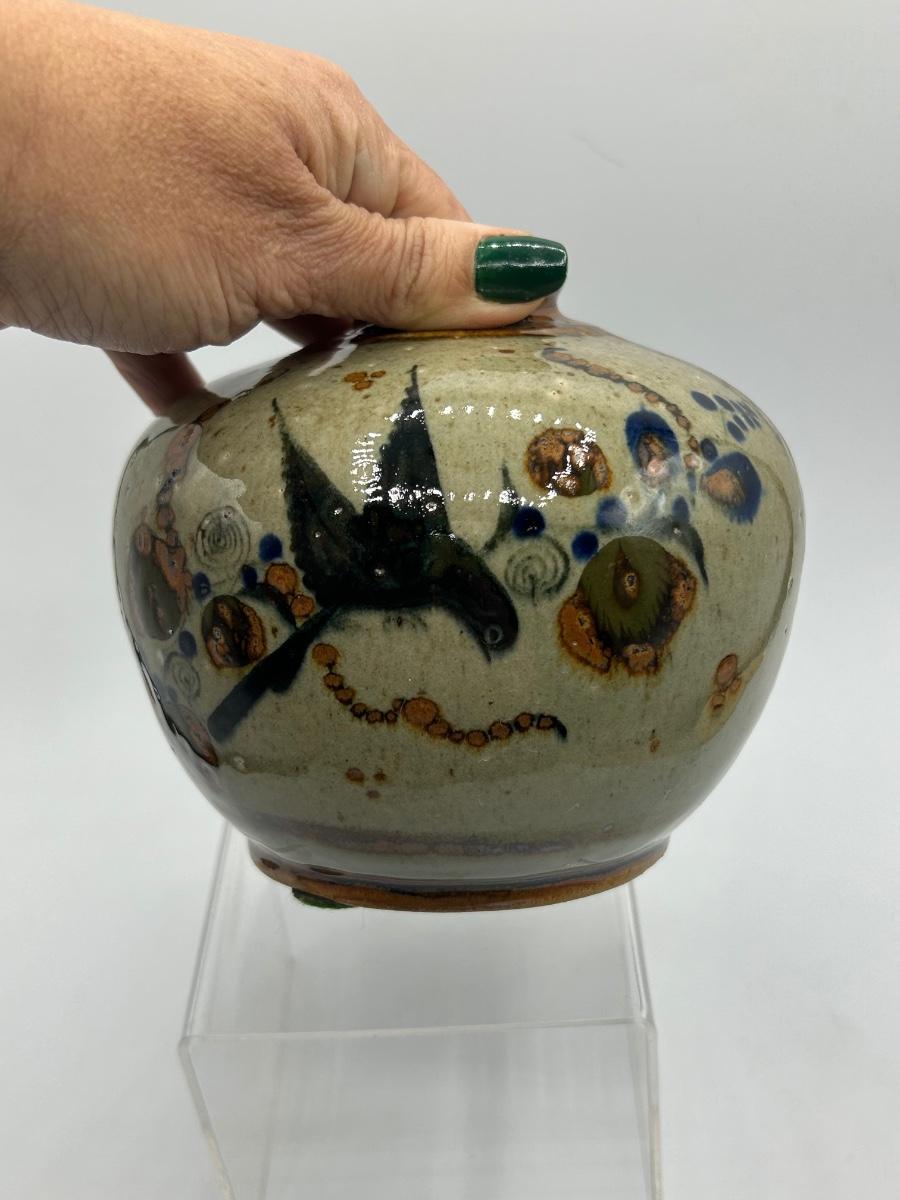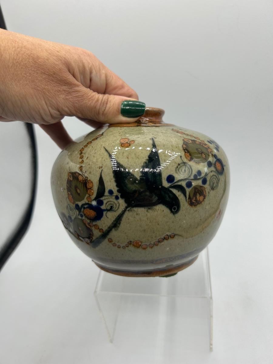 Vintage Made in Mexico Tonala Pottery Vase Urn. Hand made and painted. In good condition. Bird and flower pattern. About 5" size.