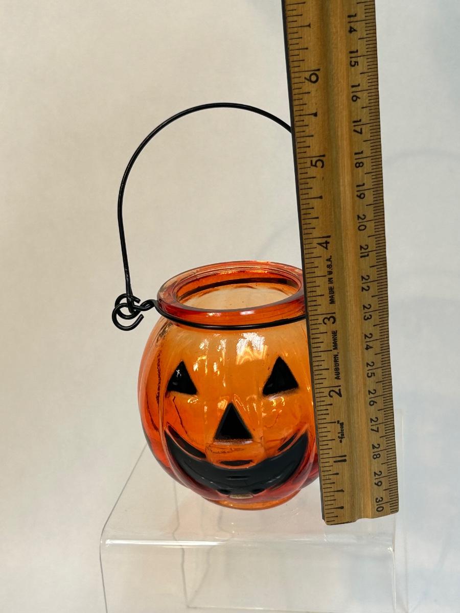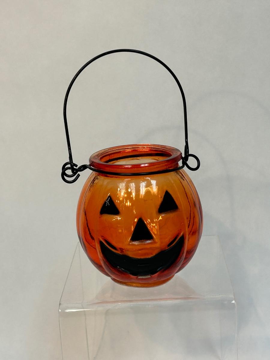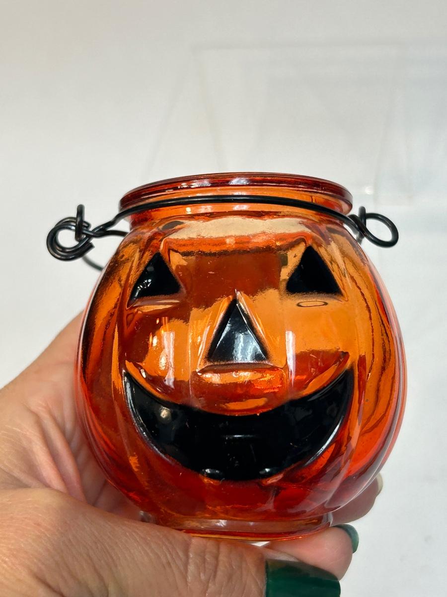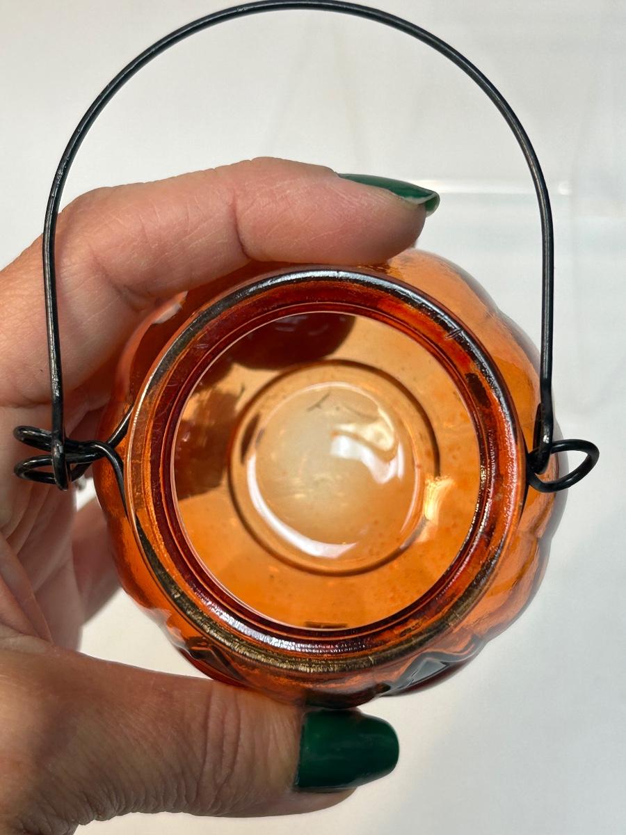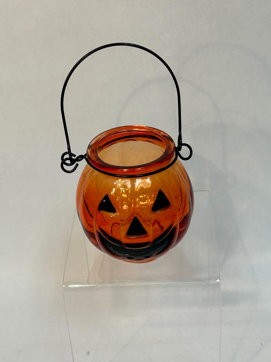 Small Glass Jack o Lantern Pumpkin Candle Holder with Metal Handle