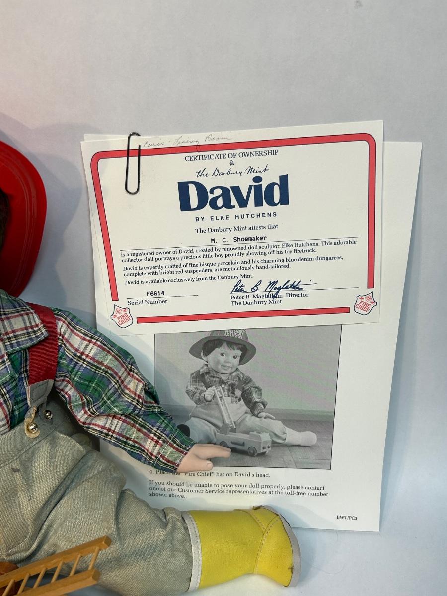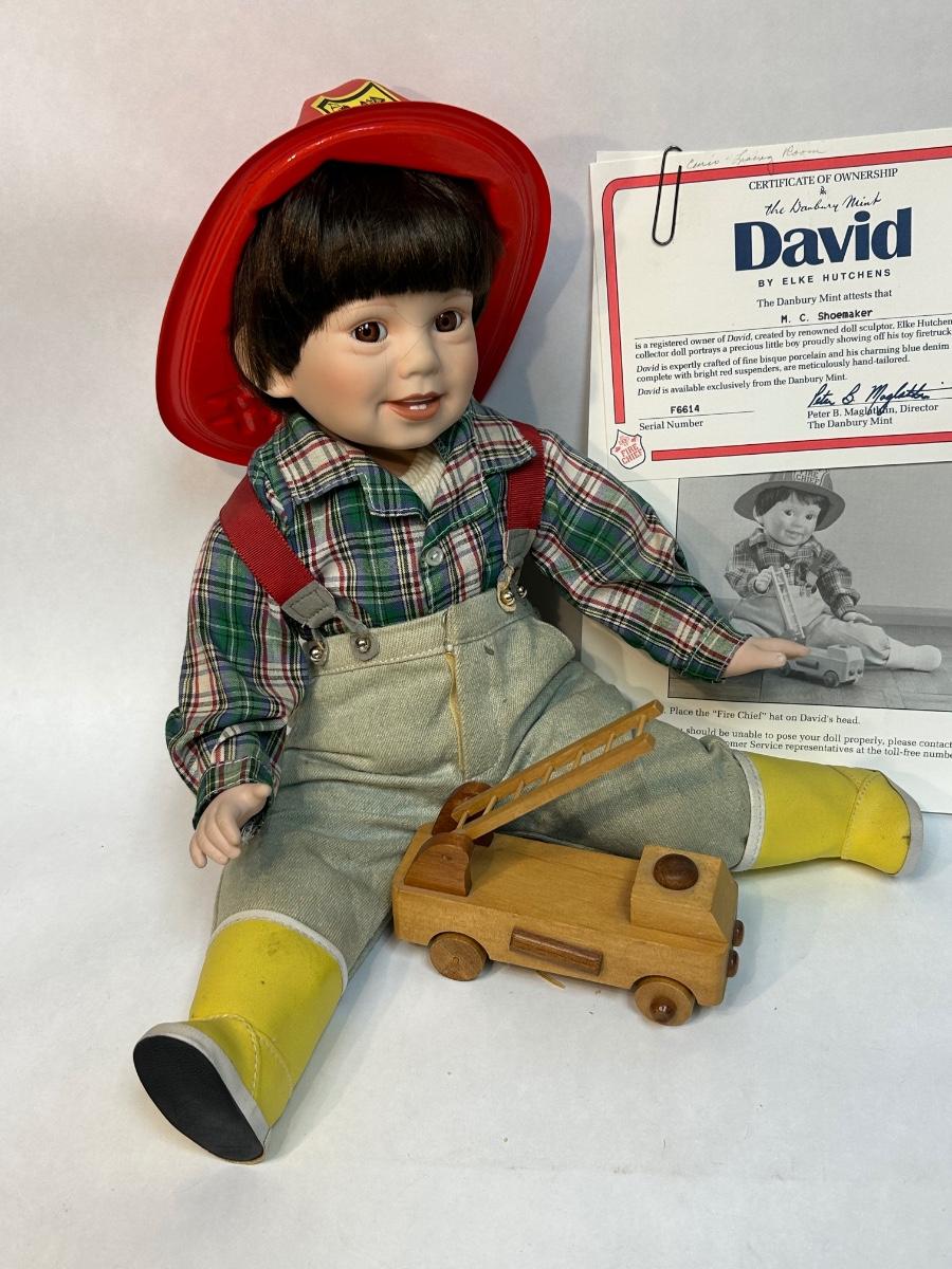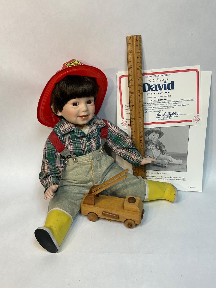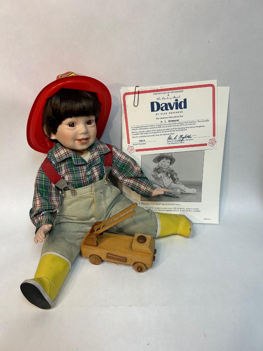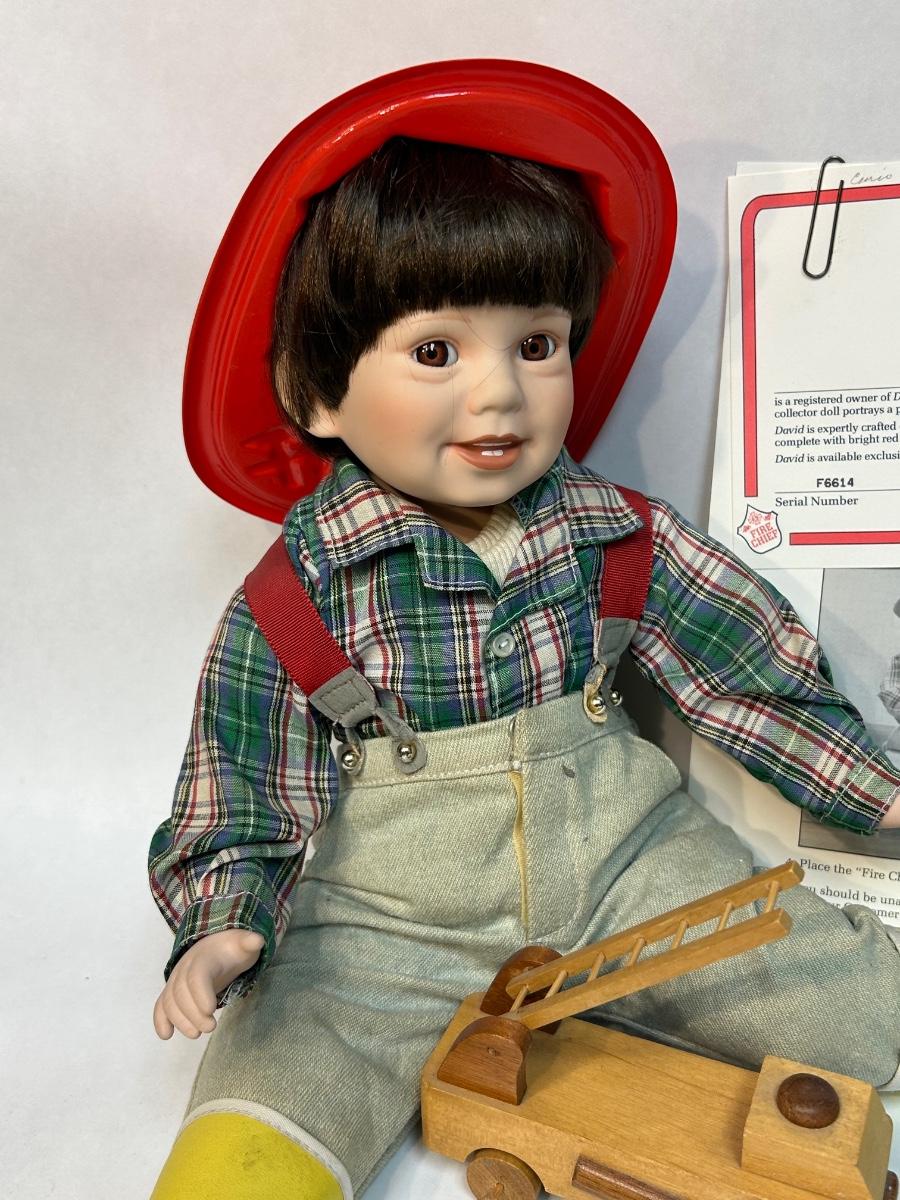 The Danbury Mint Little Boy with Firetruck Porcelain Doll David. Comes with COA. In good condition.