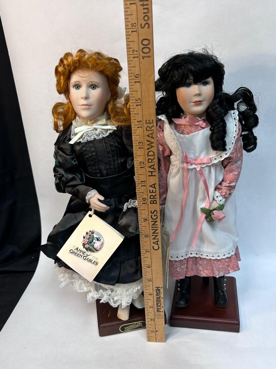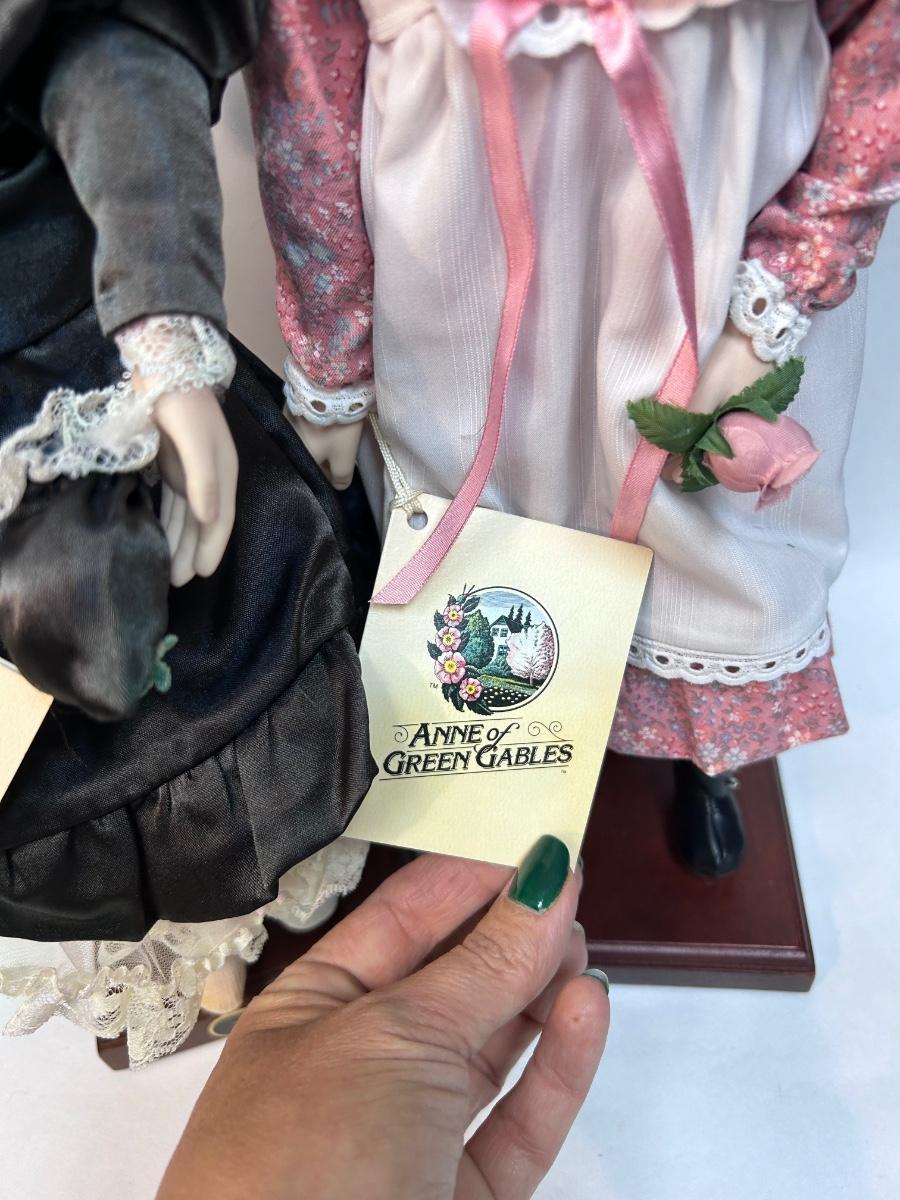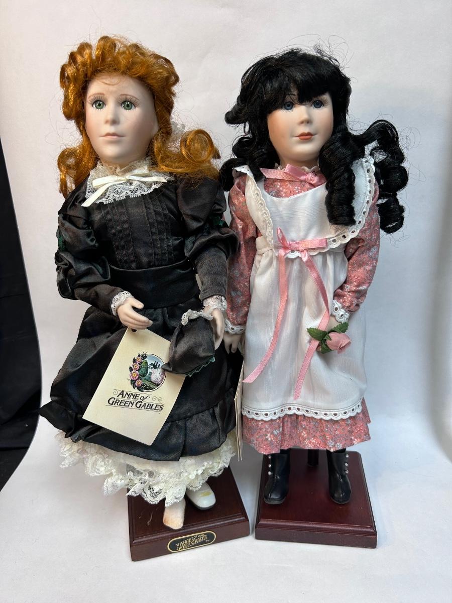 Pair of Porcelain Anne of Green Gables Collector Dolls with Stands and Hang Tags. In previously displayed condition. Anne is missing a shoe. About 16" size.