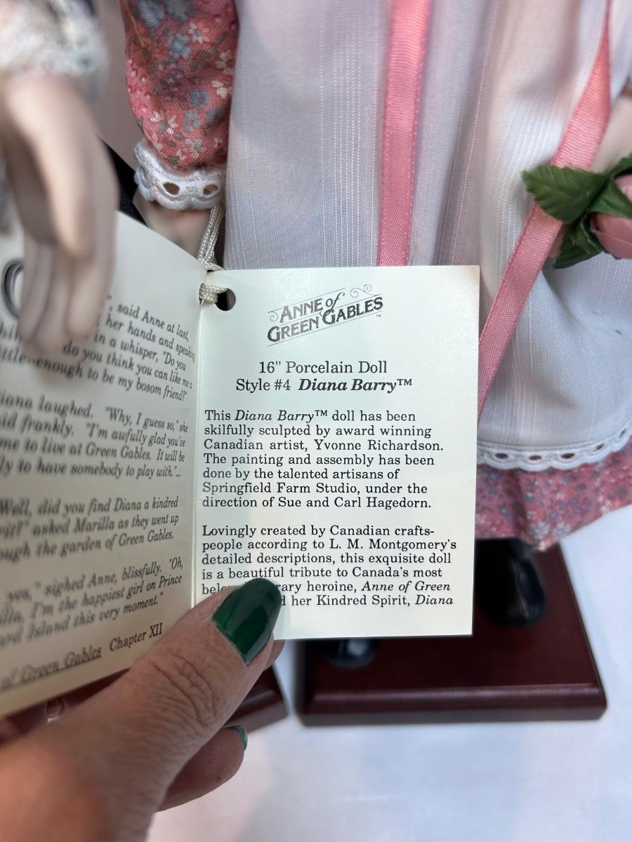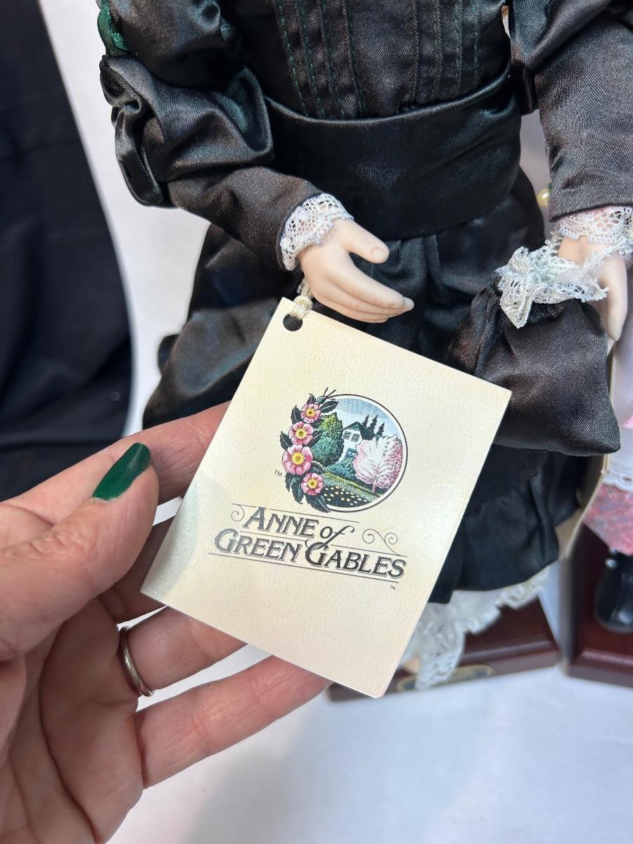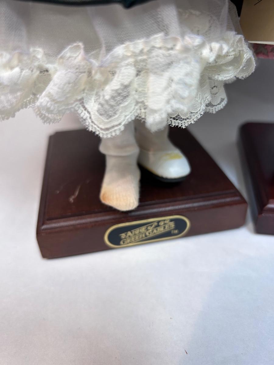 Pair of Porcelain Anne of Green Gables Collector Dolls with Stands and Hang Tags. In previously displayed condition. Anne is missing a shoe. About 16" size.
