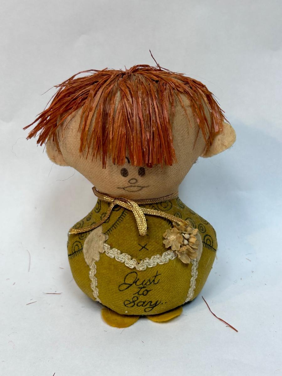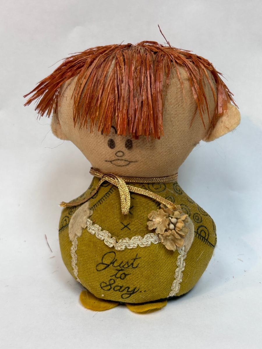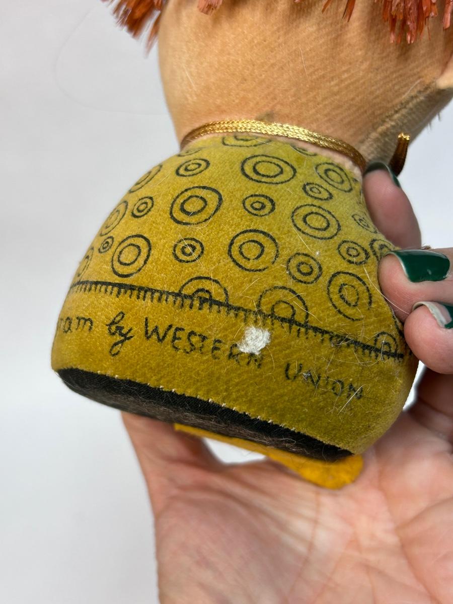 Vintage Western Union Dolly Gram Stuffed Plush Doll. In aged condition. Raffia like hair is starting to fall out. About 6" size.