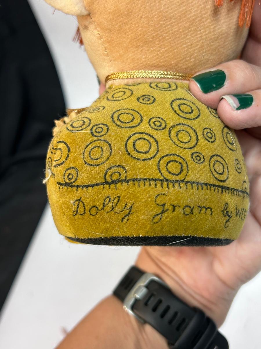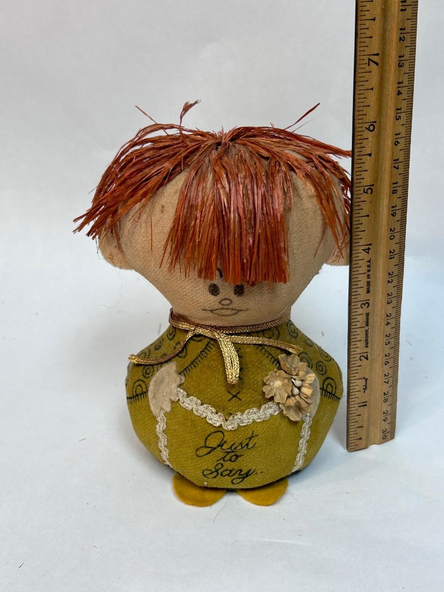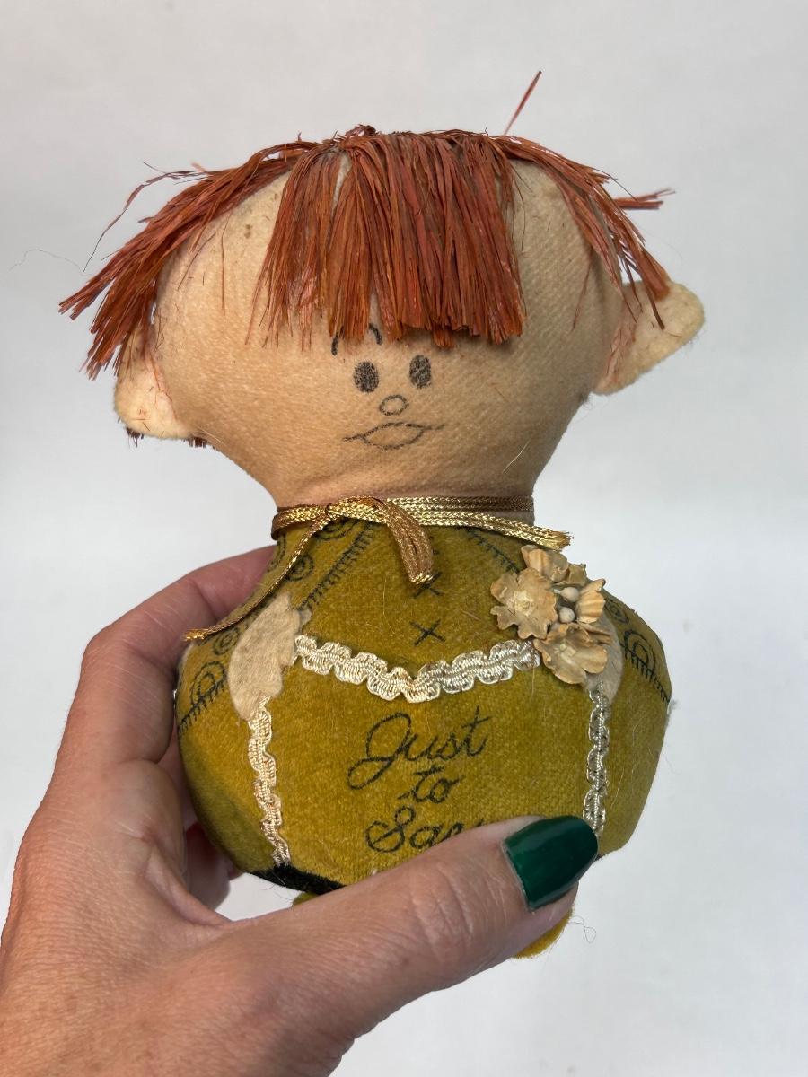 Vintage Western Union Dolly Gram Stuffed Plush Doll. In aged condition. Raffia like hair is starting to fall out. About 6" size.