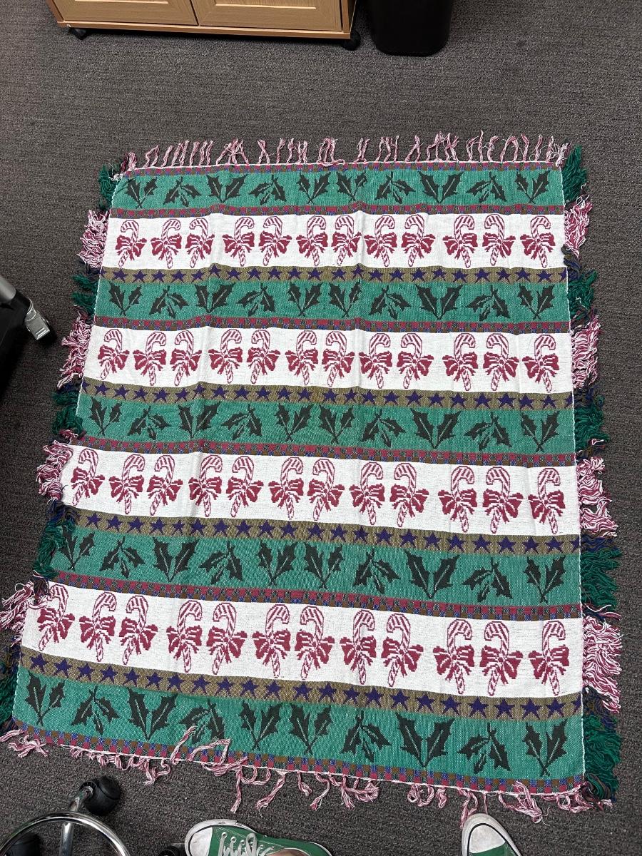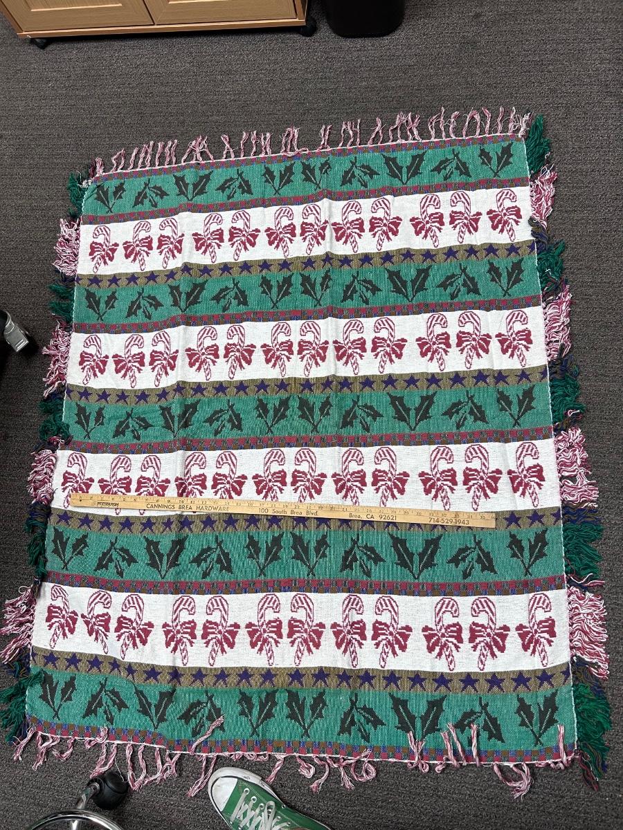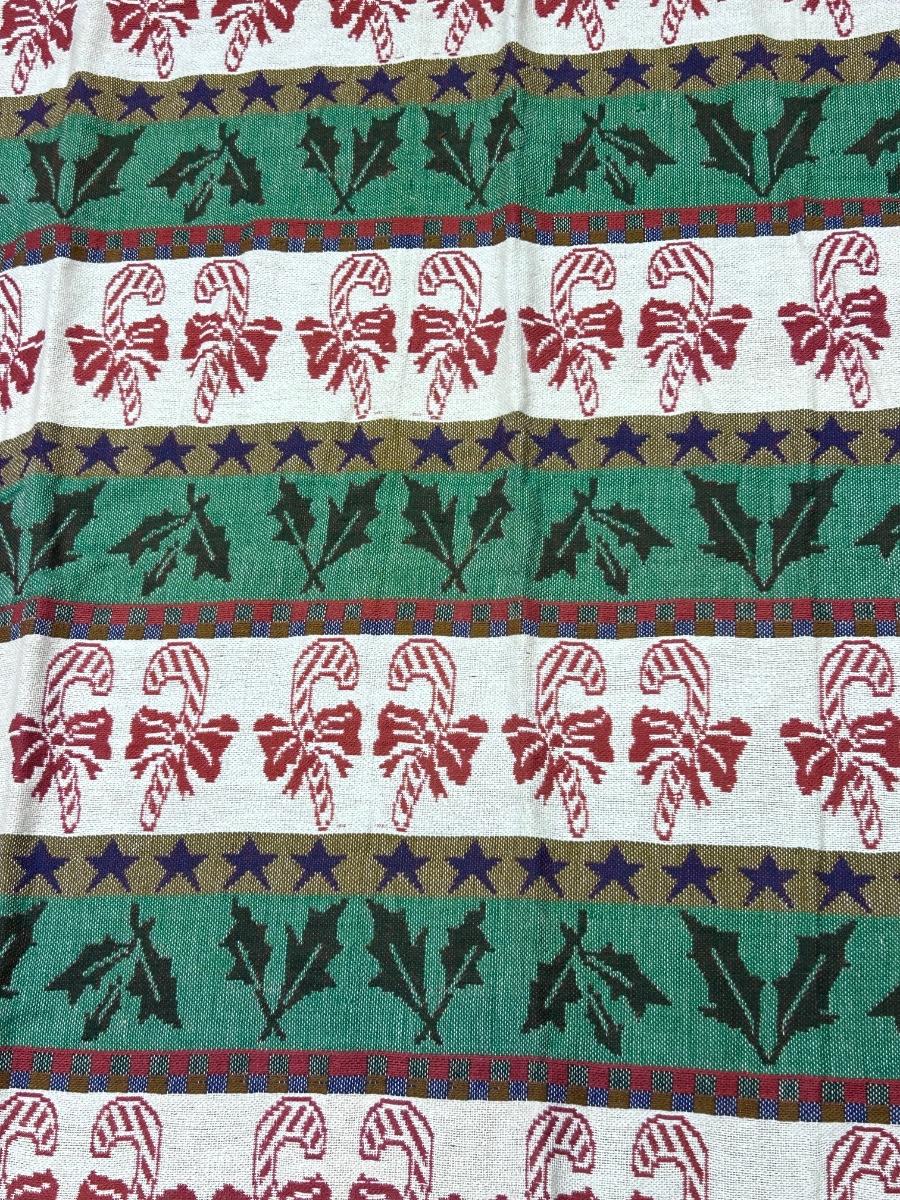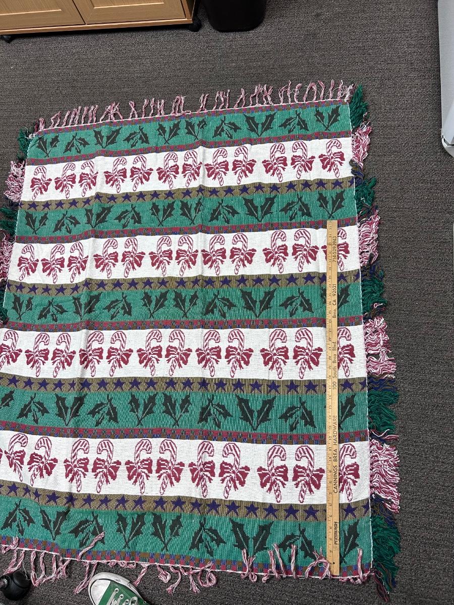 Candy Cane and Holly Striped Green and Red Christmas Holiday Fringed Edge Blanket. In good condition. No spots or stains. About 3'x5' size.
