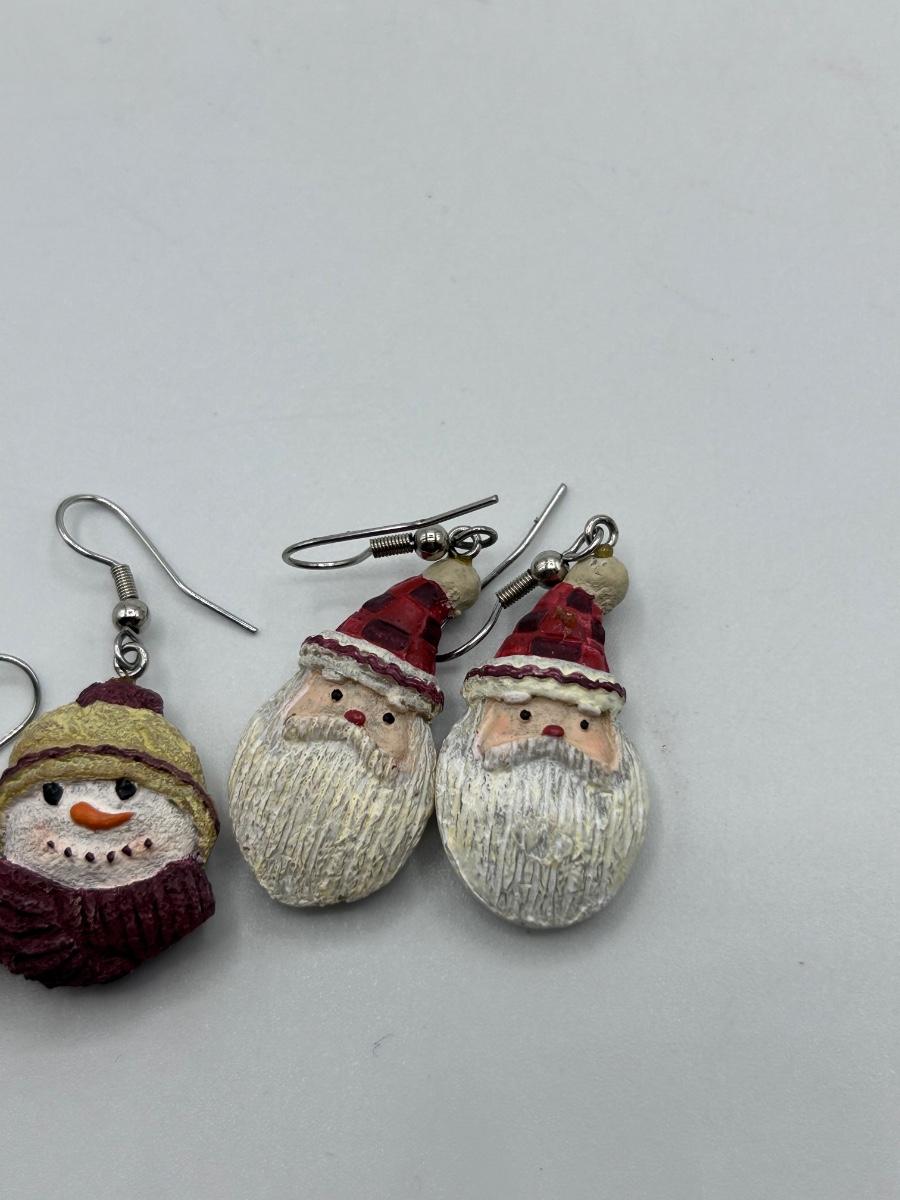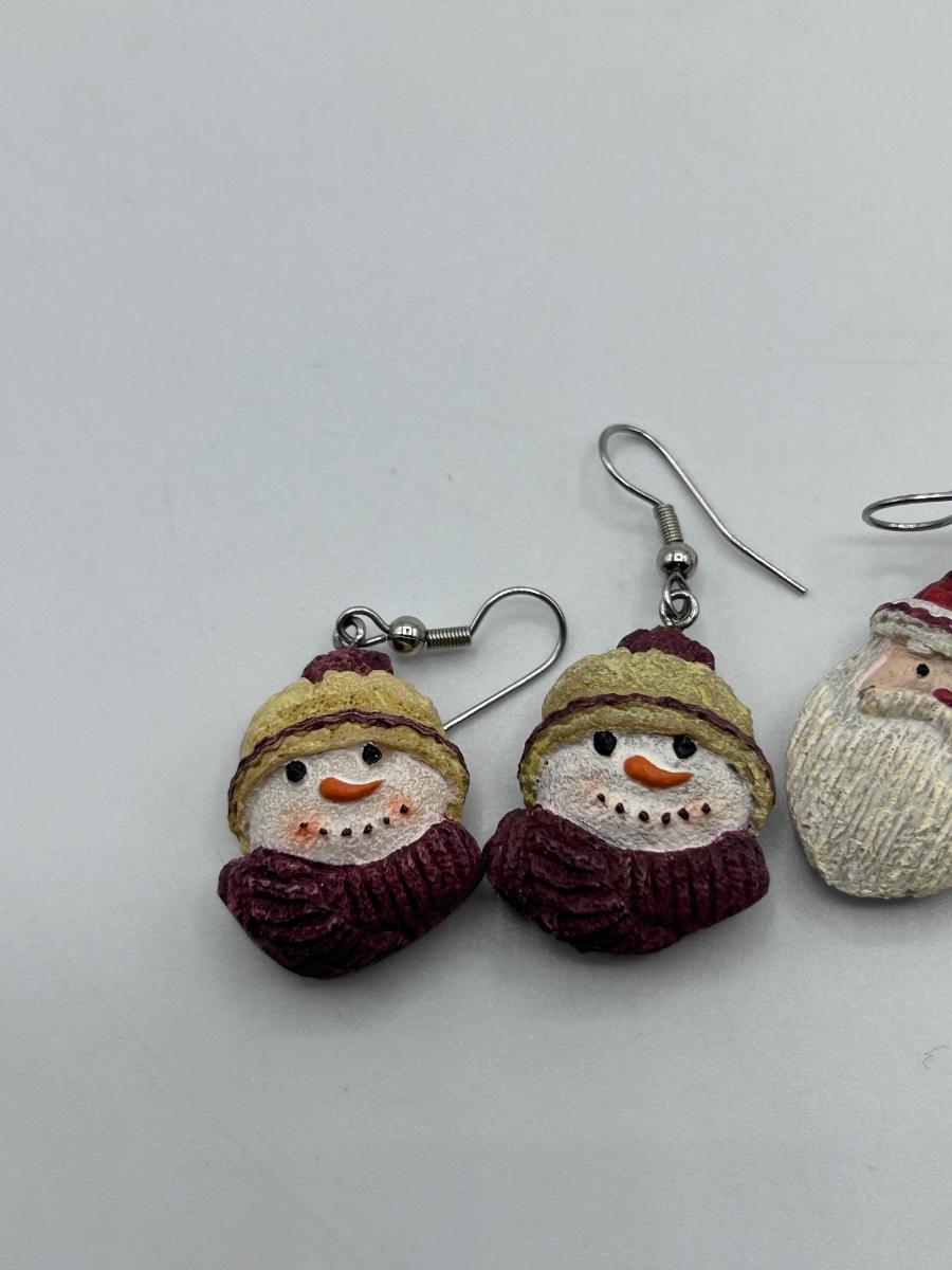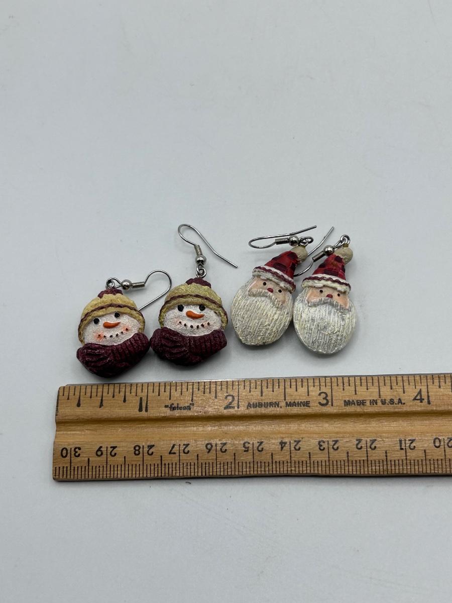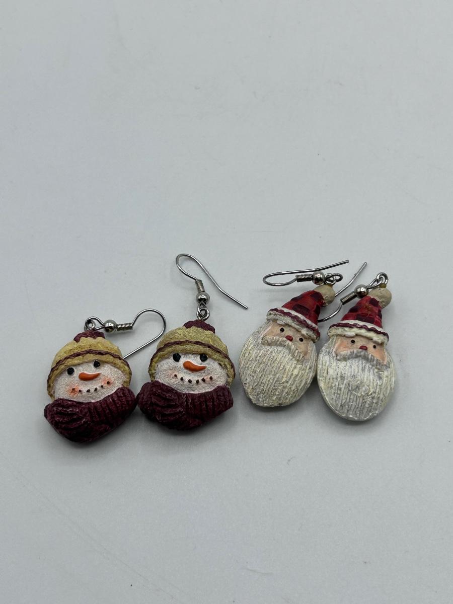 Two Pairs of Christmas Holiday Resin Dangling Earrings for Pierced Ears Snowman & Santa Claus. In good condition.
