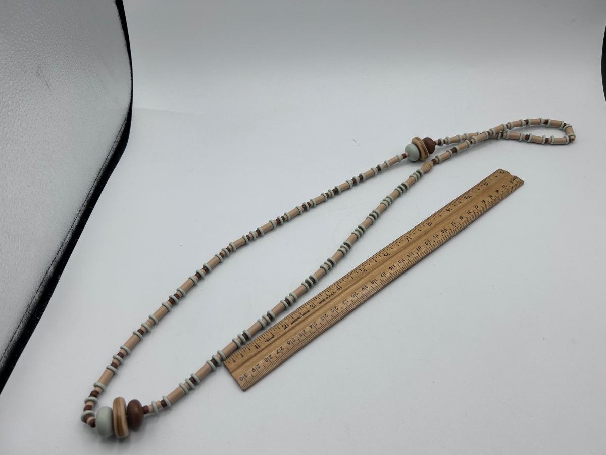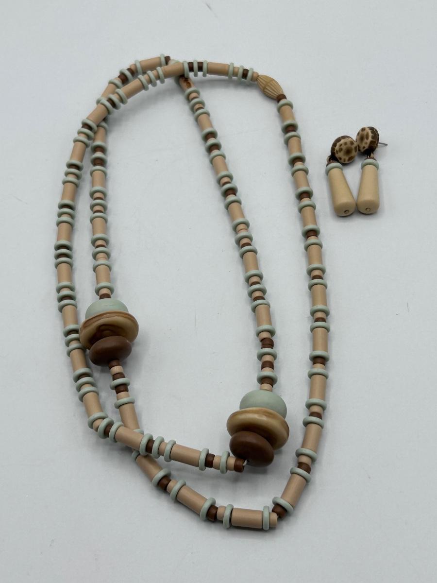 Matching Set of Tan and Pale Blue Beaded Necklace and Drop Dangle Earrings. Light weight beads. In good condition. Long necklace.