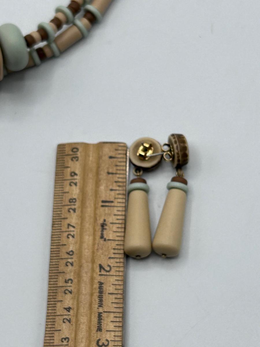 Matching Set of Tan and Pale Blue Beaded Necklace and Drop Dangle Earrings