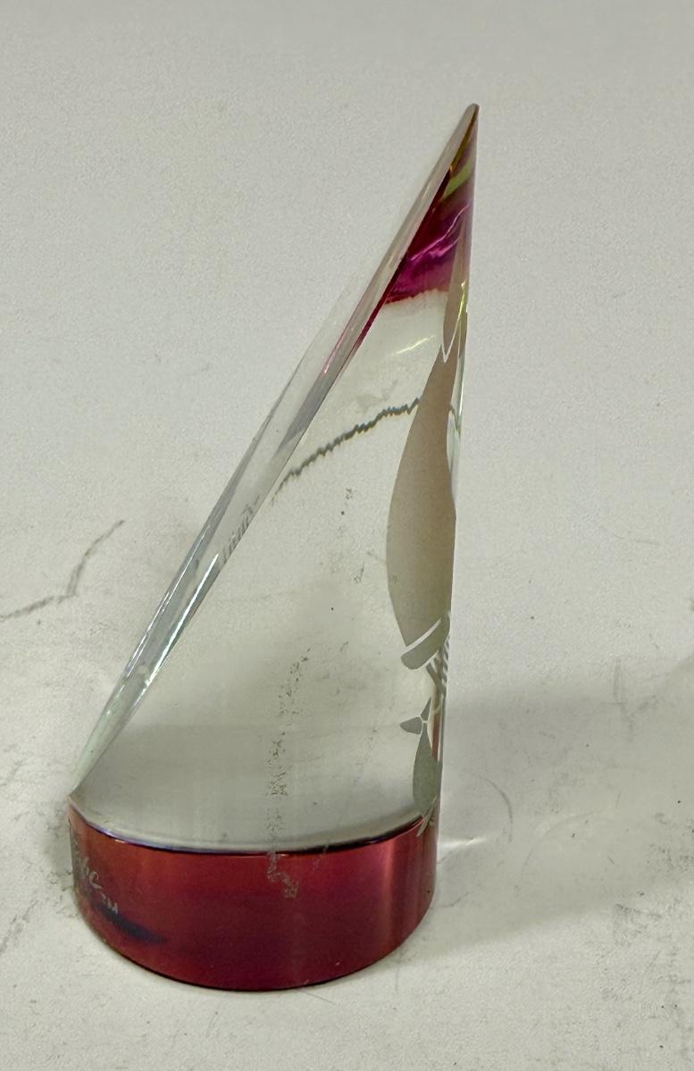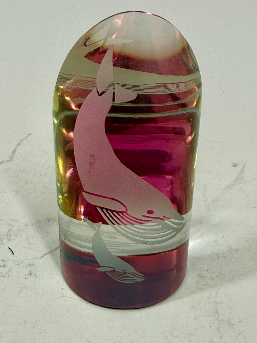 Glass cylinder with beveled cut, etched with images of 2 whales. Approx. 3.5" tall, great condition.
