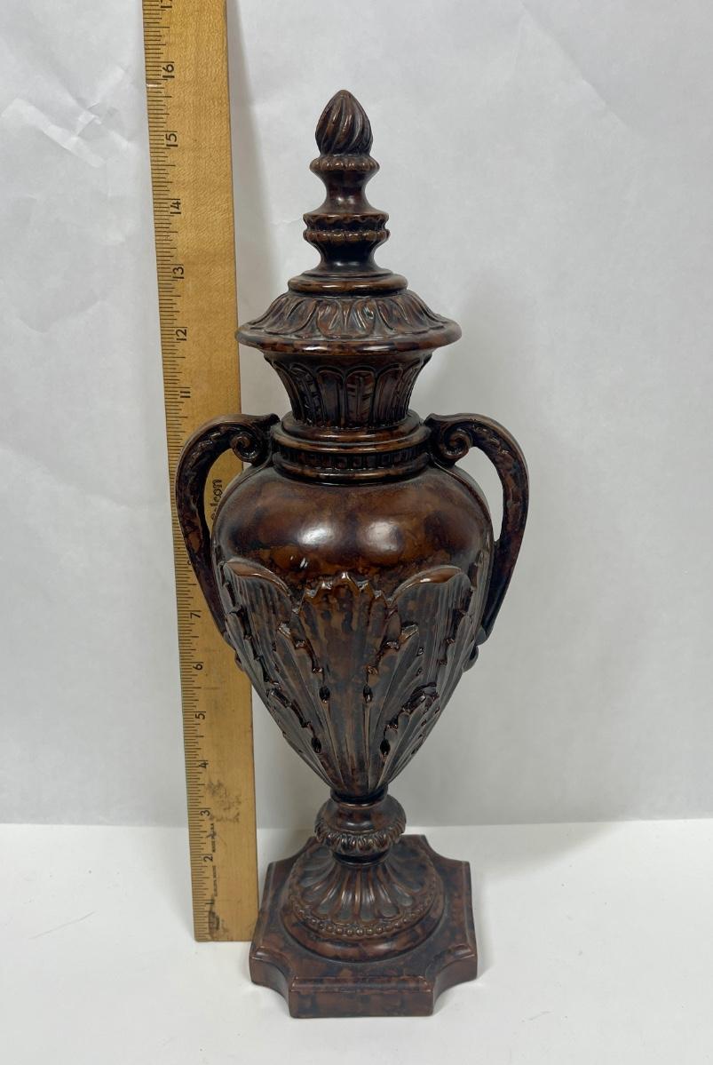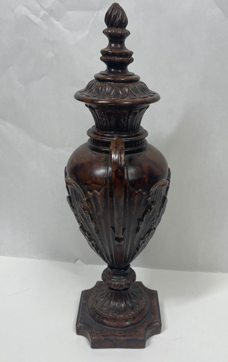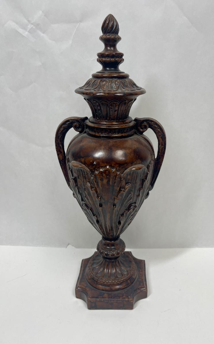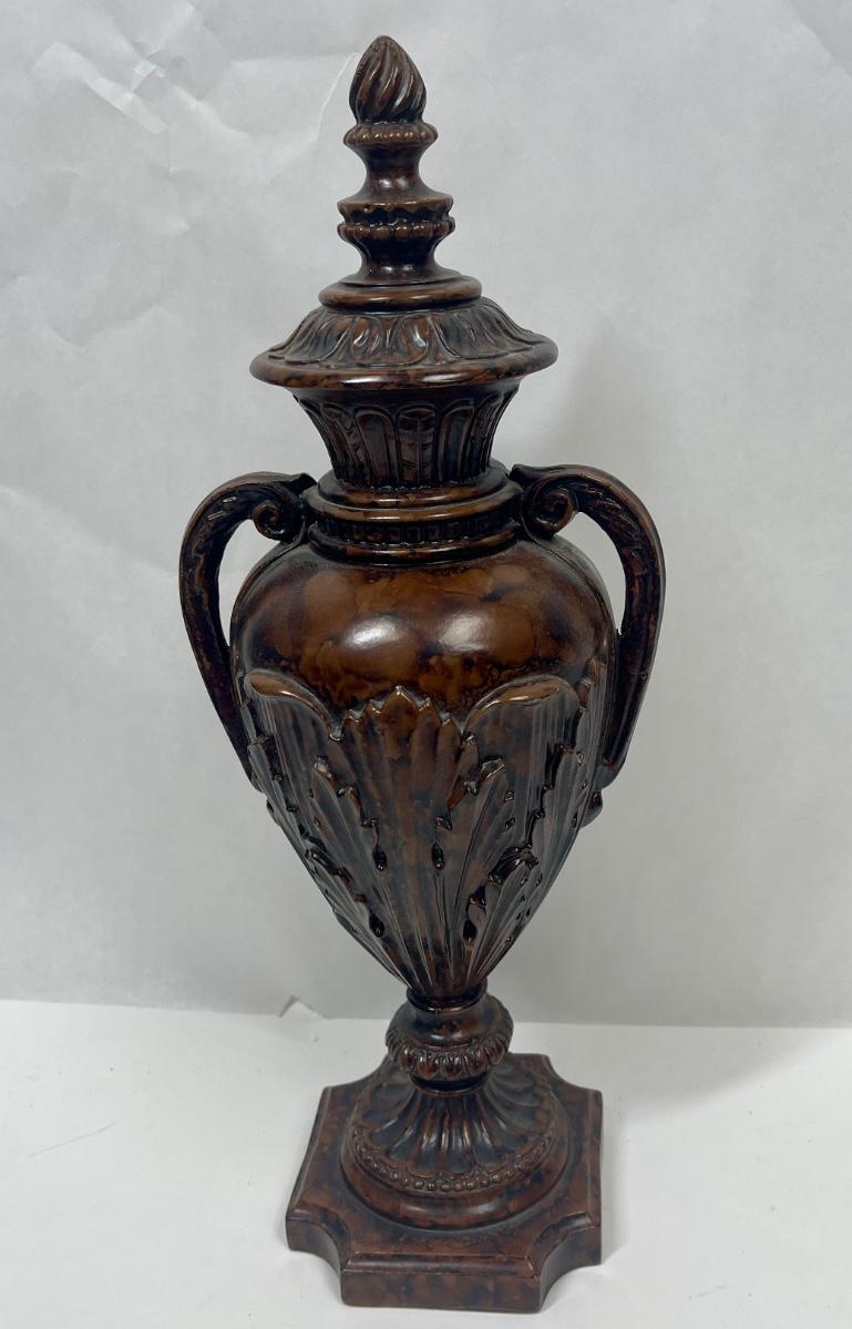 Dark brown, solid, 1-piece resin urn. Heavy, makes a nice accent piece. Made to look like weathered bronze, or possibly a dark wood.
