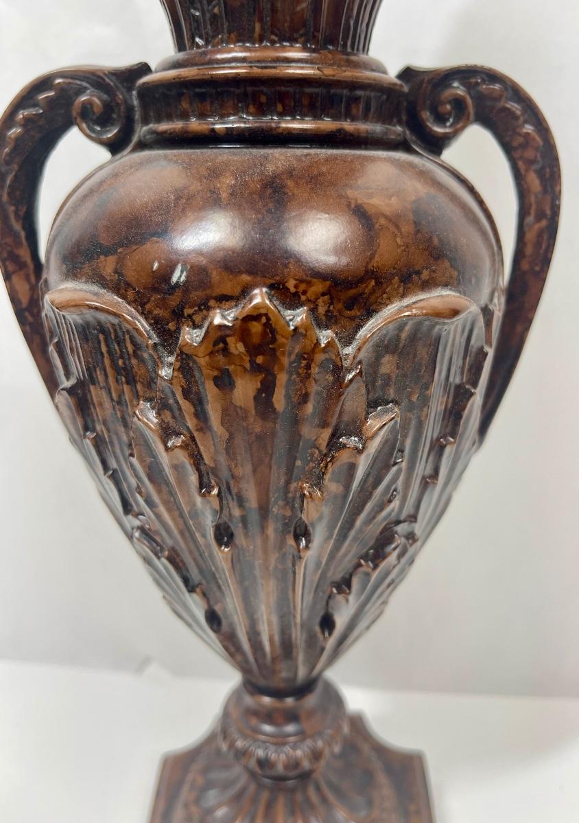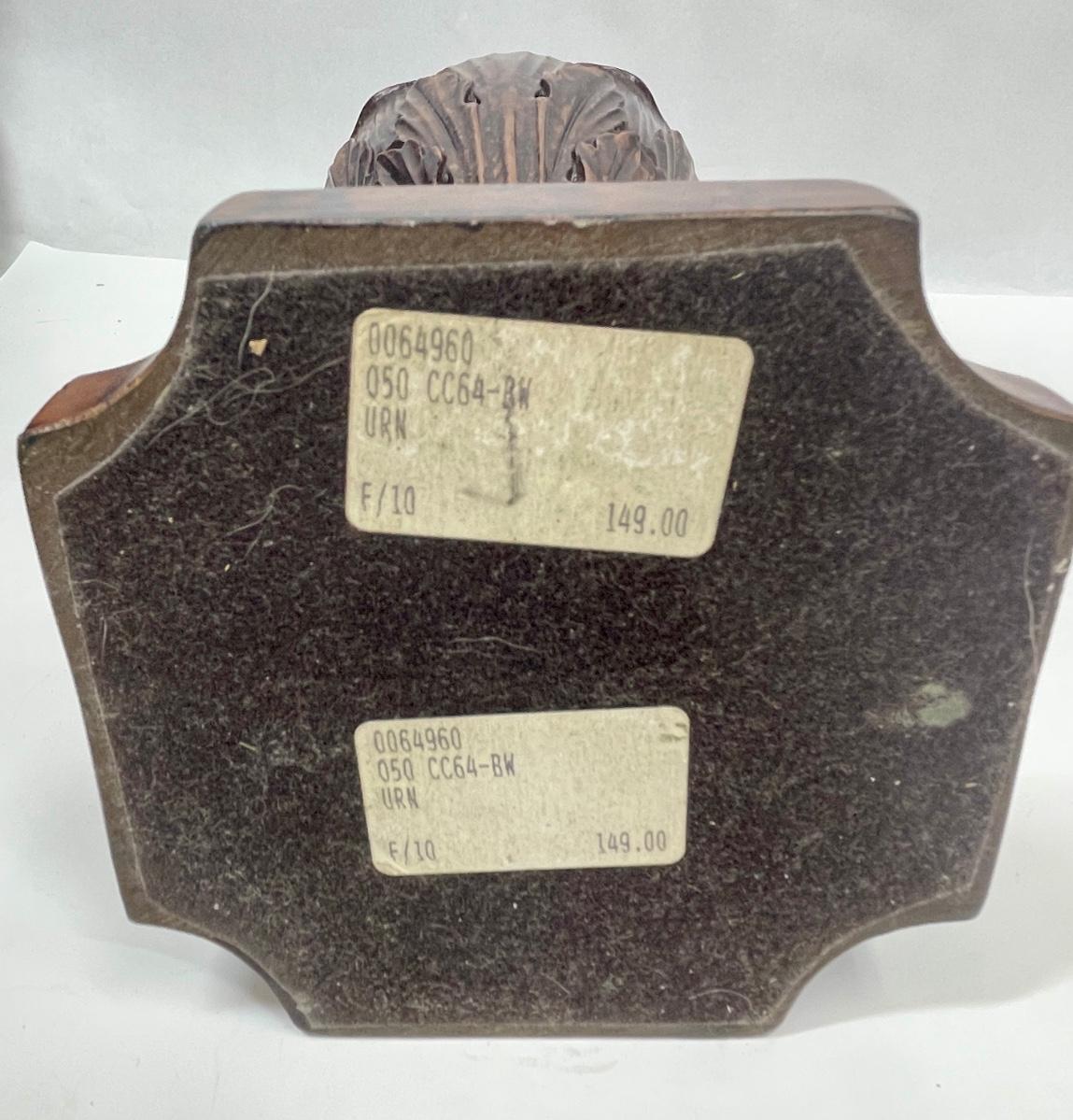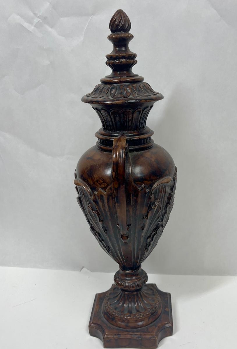 Dark brown, solid, 1-piece resin urn. Heavy, makes a nice accent piece. Made to look like weathered bronze, or possibly a dark wood.