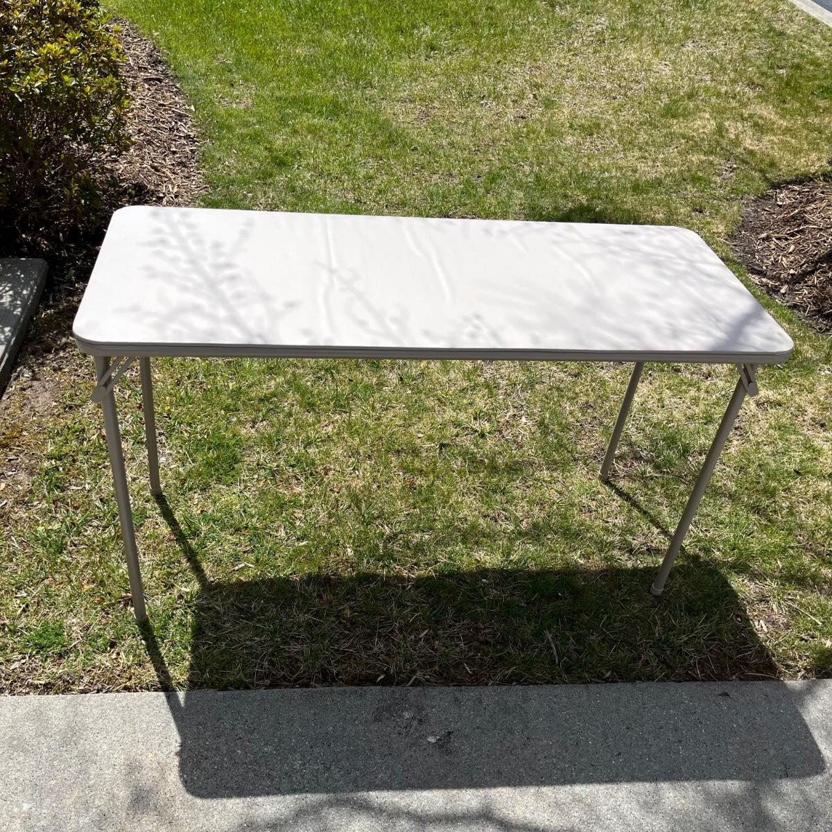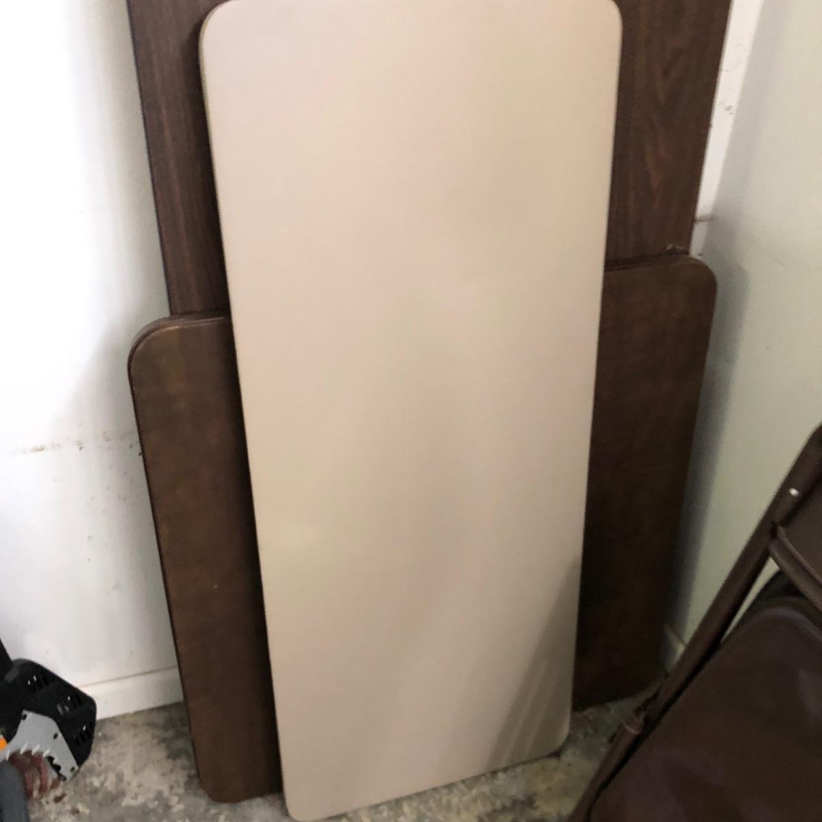 Three folding tables include rectangular 6’ long table and 4’long tables and a 2’ 10” square table. Four metal folding chairs are dark and medium brown with the medium brown chairs having scratches on seat and back. The largest table is made of particle board with a plastic wood look veneer surface. This table is heavy and measures 6’ x 2.5’ x 2’ 5.5”. Local pickup only.