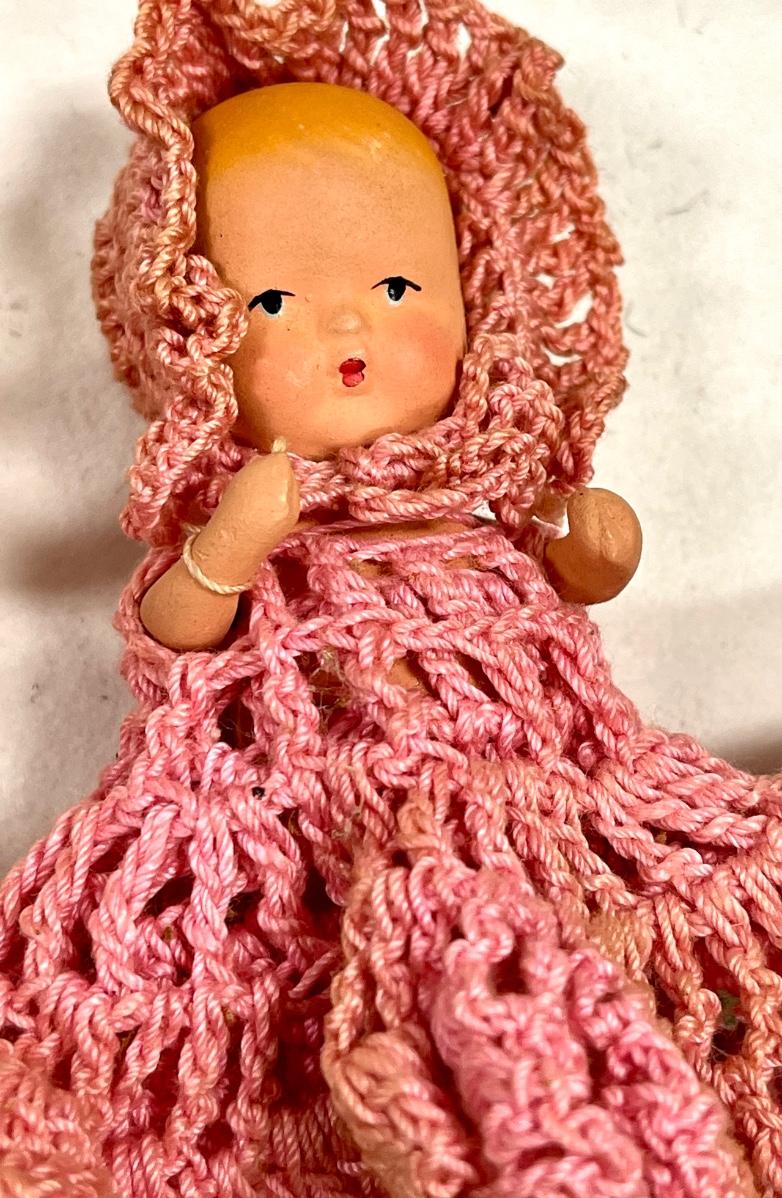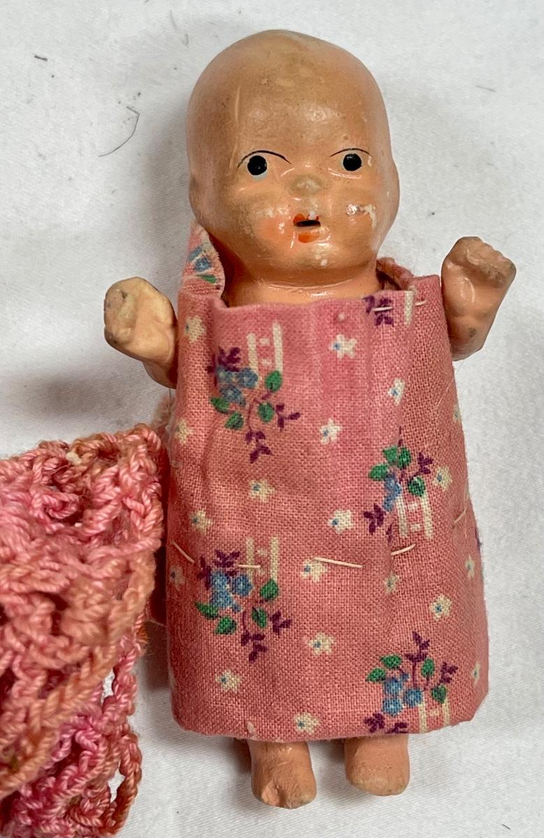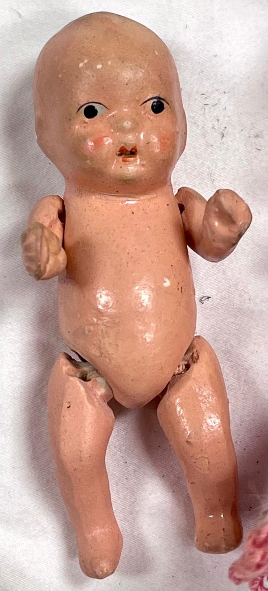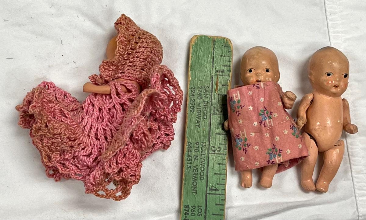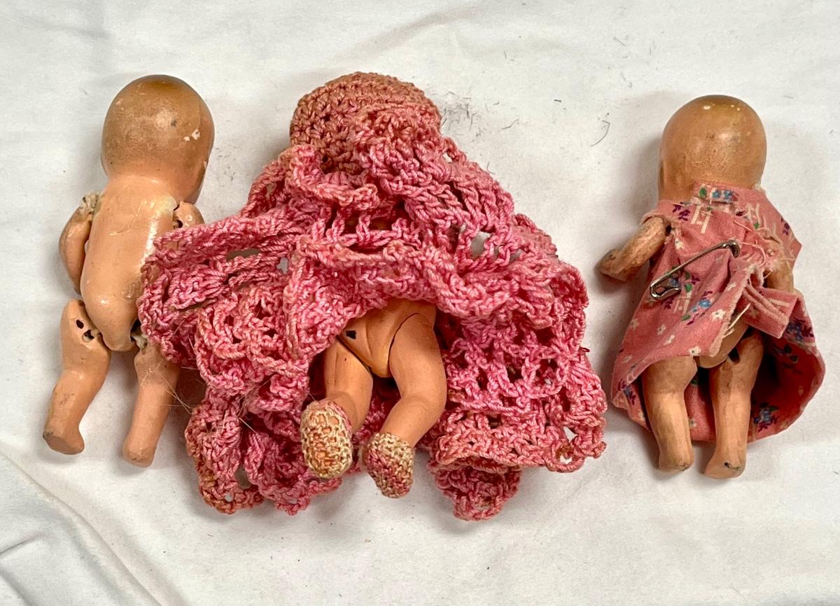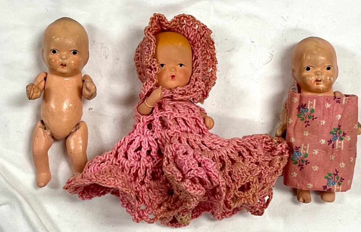Set of Three Jointed Body Baby Doll Miniature Dollhouse Dolls. Composite bodied dolls with painted features. Under 4" size.