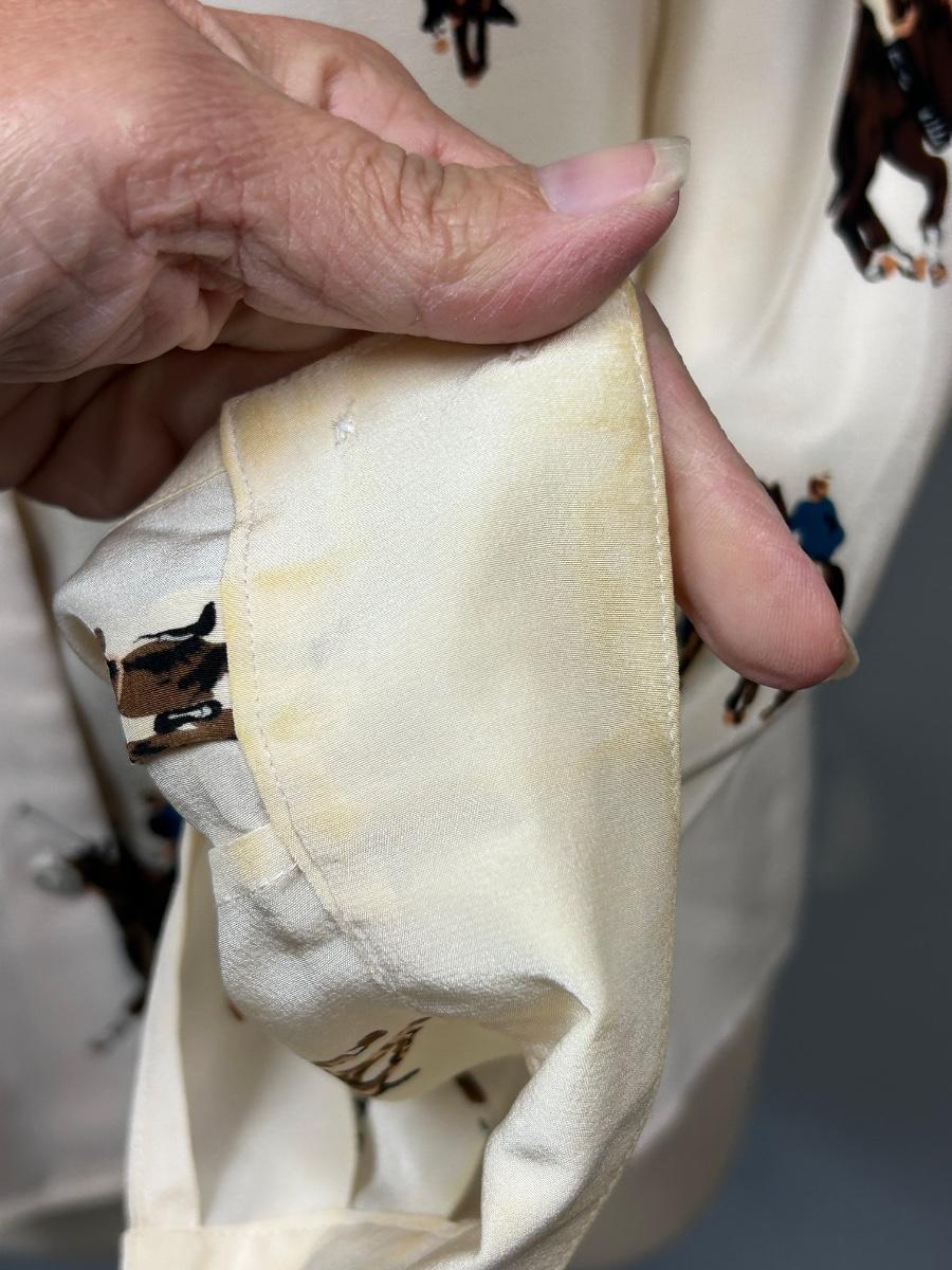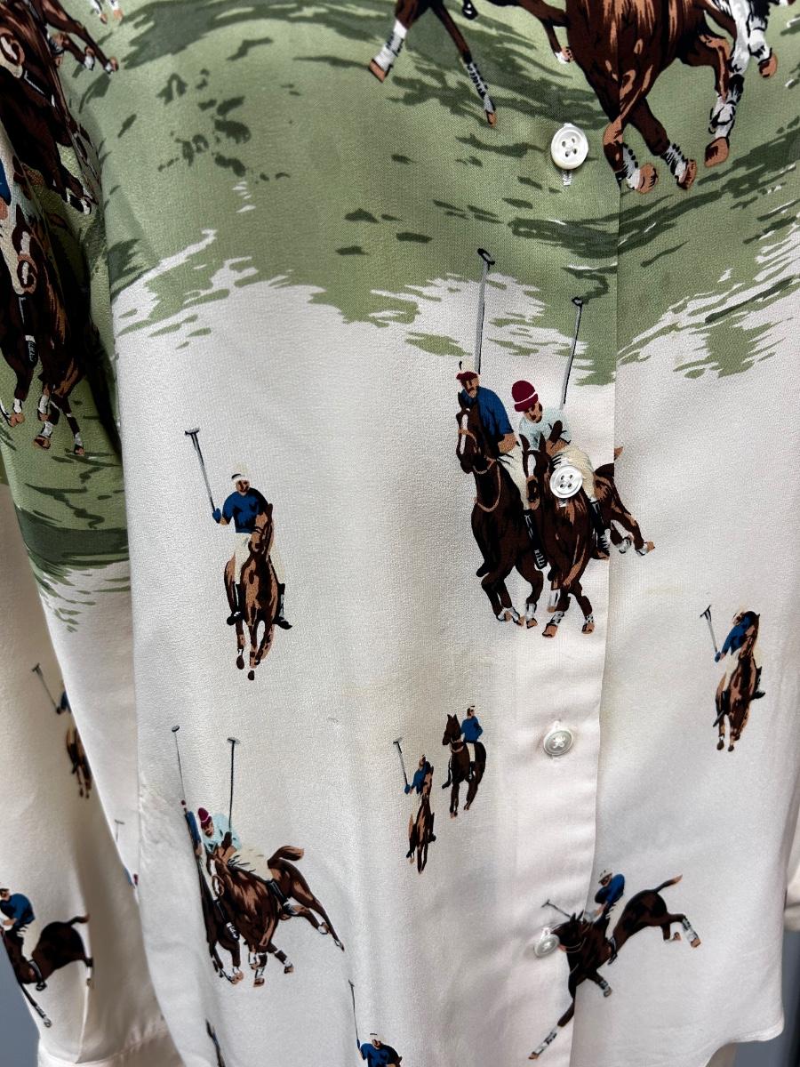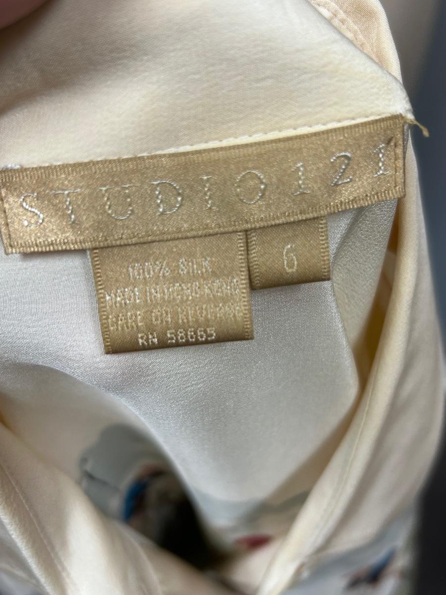 Studio 121 Size 6 100% Silk Equestrian Polo Players Button Front Blouse. In previously worn condition. There is a few faint spots and some discoloration on collar and cuff. May just need to go to cleaners. In wearable condition.